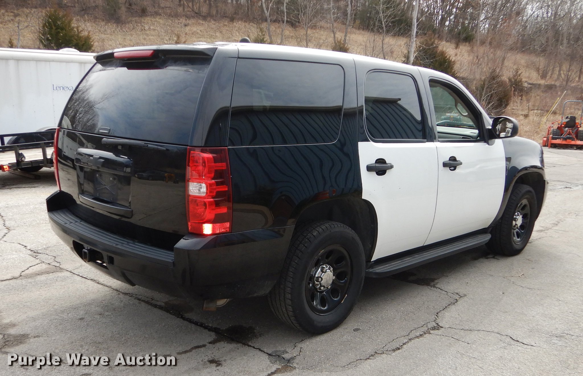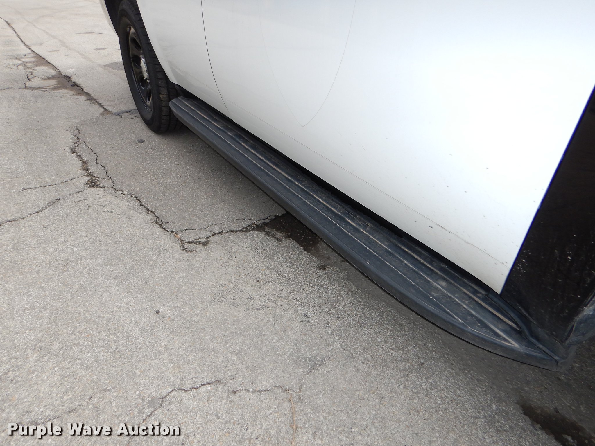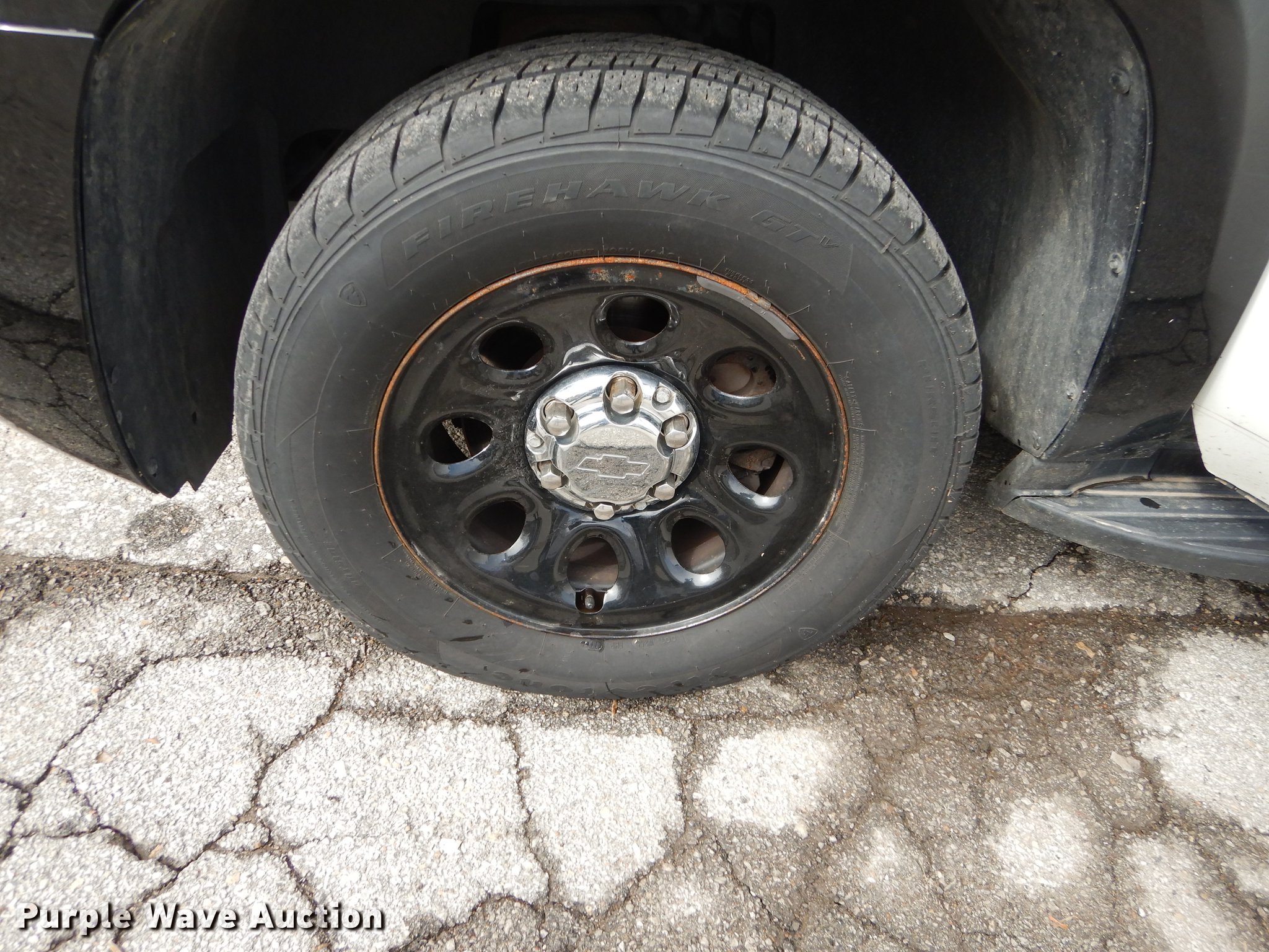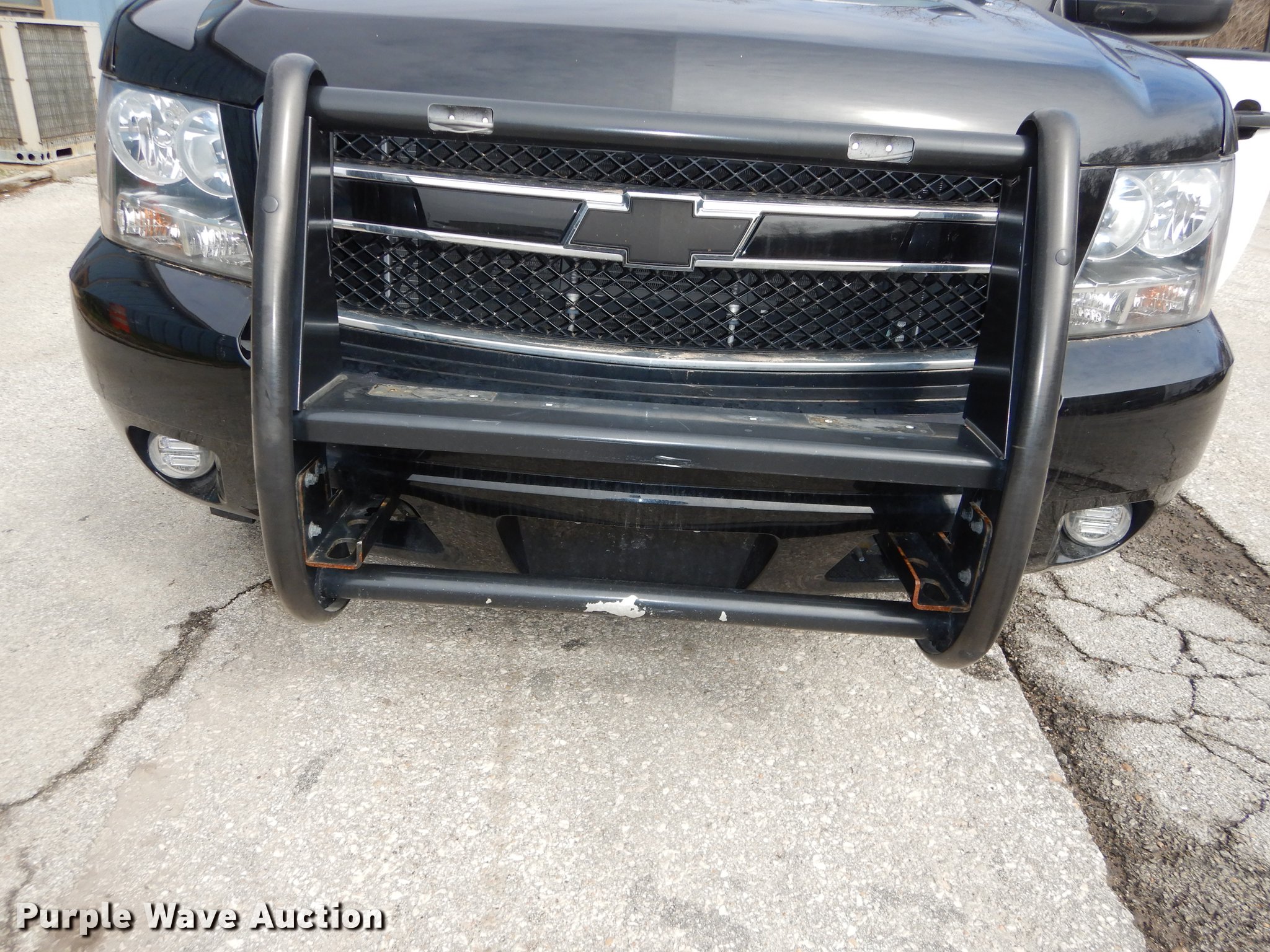 Purple Wave is selling a used Passenger Vehicle in Kansas. This item is a 2013 Chevrolet Tahoe Police SUV with the following: 149,171 miles on odometer, 5.3L V8 OHV 16V FFV gas engine, Automatic transmission, AC and heat, Tilt, Cruise, AM/FM/CD, Power locks, windows, mirrors and driver seat, Cloth front interior, Vinyl rear interior, Fog lights, Spotlight, Running boards, Grill guard, Trailer wiring, Receiver hitch, 265/60R17 tires, Center console missing, Holes in roof from equipment