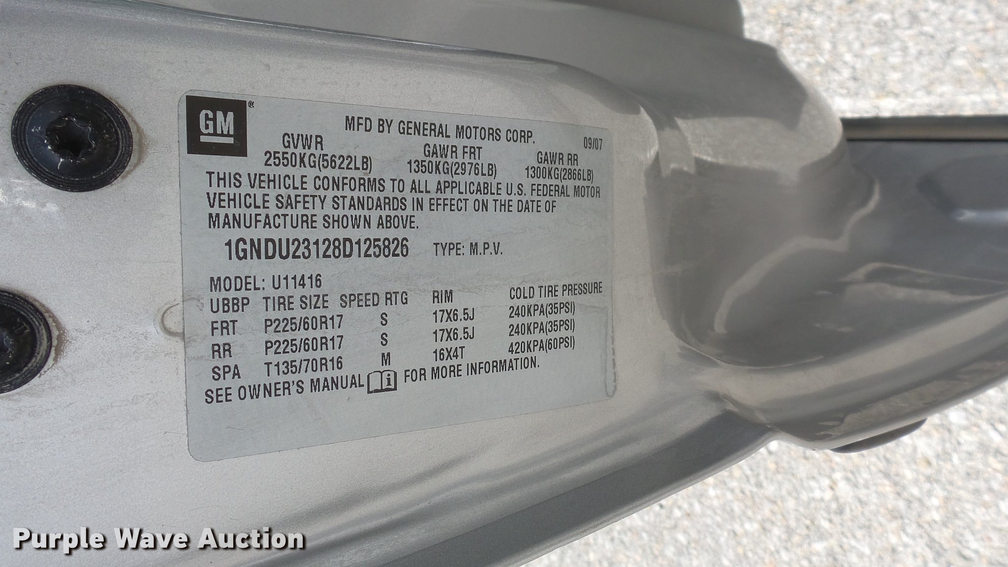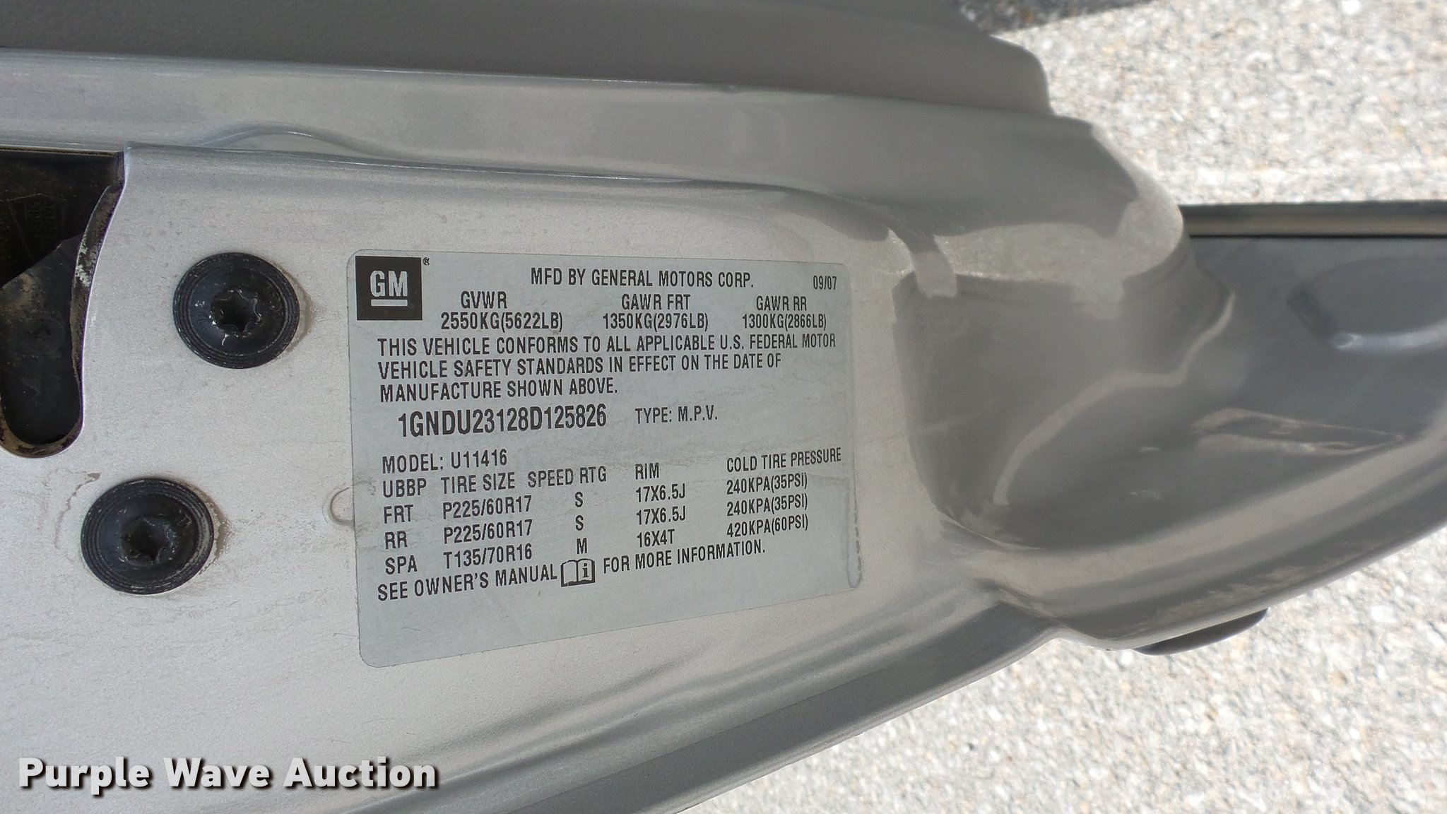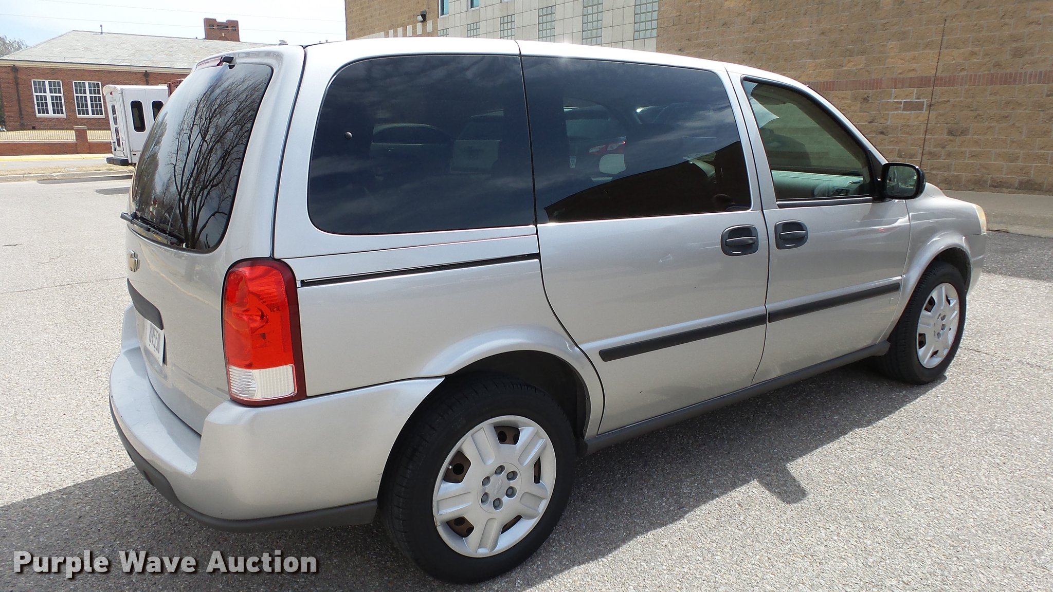 Purple Wave is selling a used Passenger Vehicle in Kansas. This item is a 2008 Chevrolet Uplander van with the following: 130,878 miles on odometer, 3.9L V6 DOHC 24V gas engine, Automatic Transmission, AC and heat, Tilt, Cruise, AM/FM/CD, Power locks, windows, and mirrors, Cloth interior, Fog lights, 225/60R17 tires