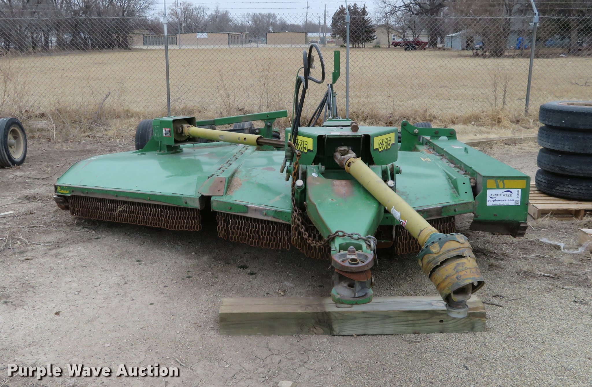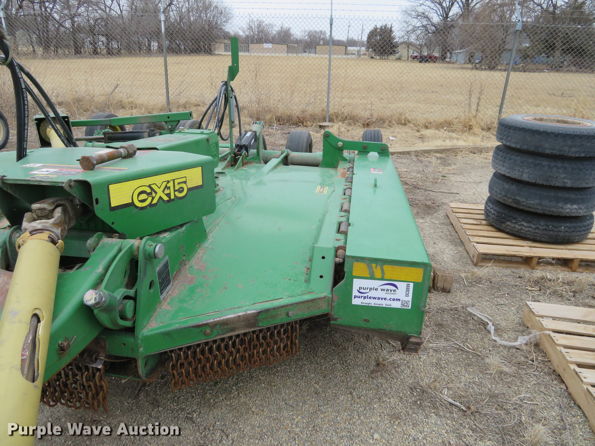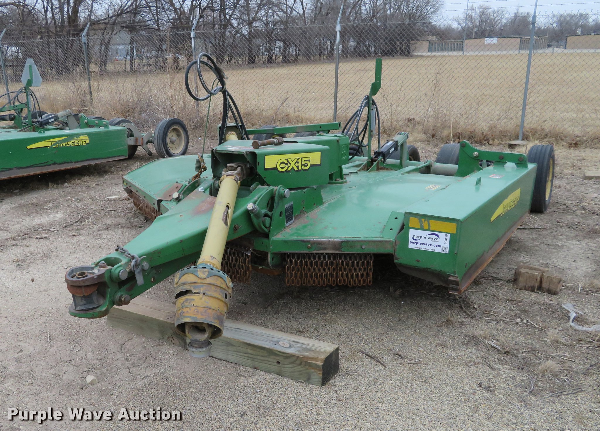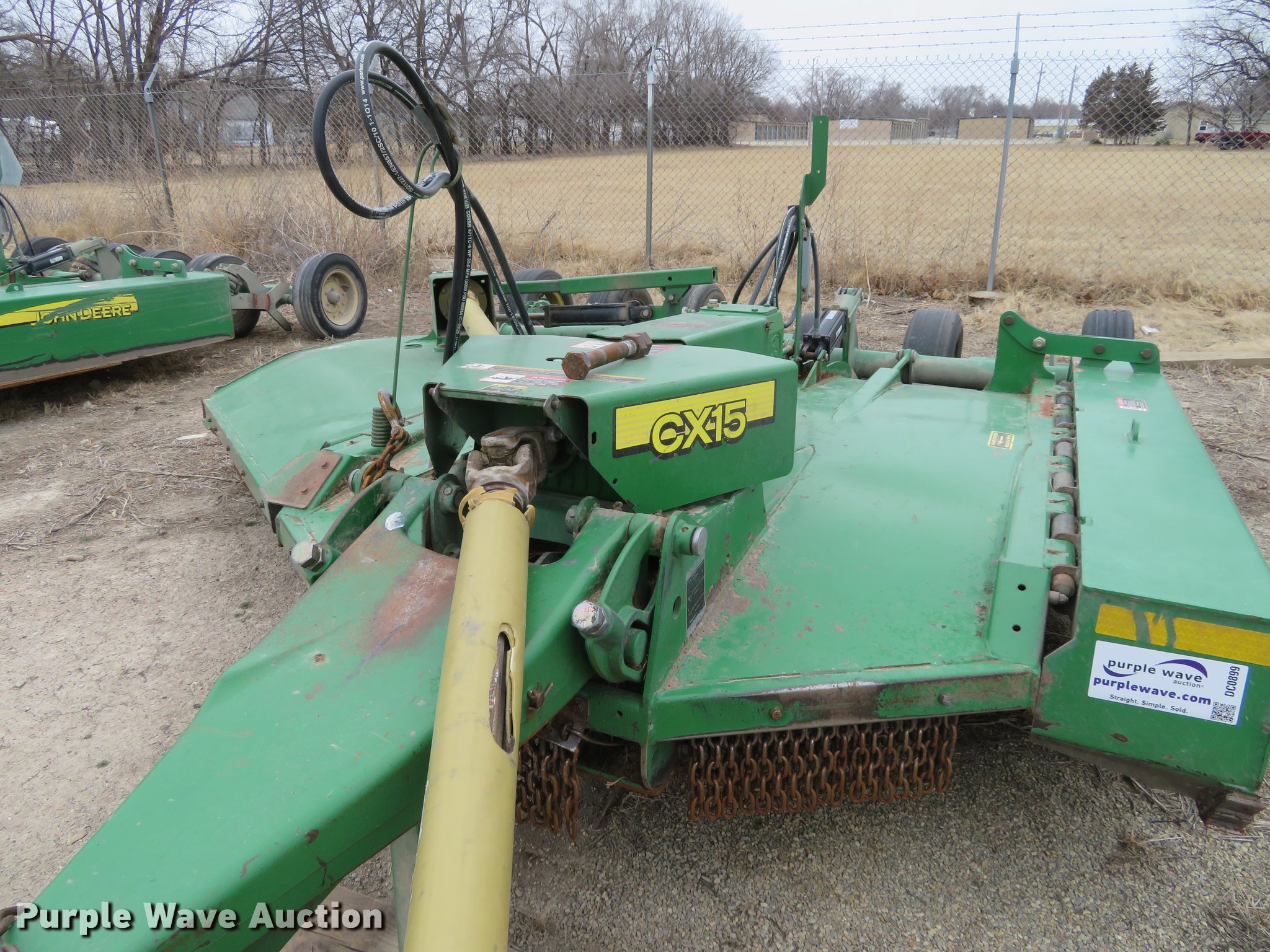 Purple Wave is selling a used Mower, Cutter, Shredder in Kansas. This item is a John Deere CX15 rotary mower with the following: 10'W, Hydraulic lift and fold, Chain guards, 540 PTO, 26x9-14.5 tires, Serial P0CX15G008583