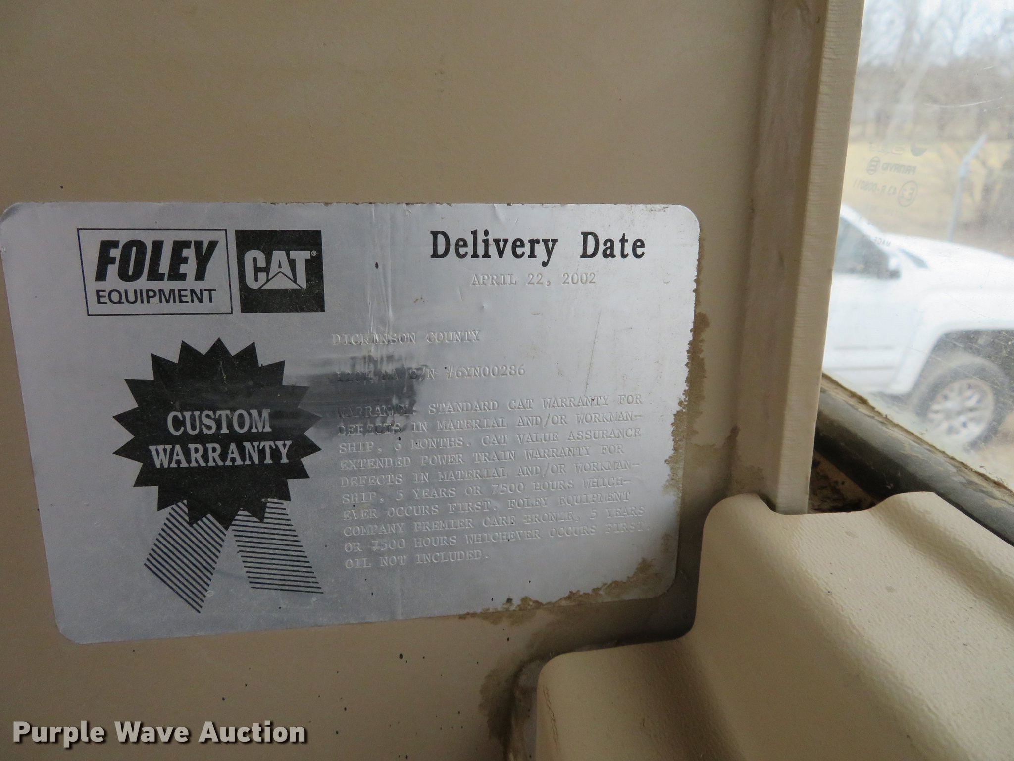 Purple Wave is selling a used Motor Grader in Kansas. This item is a 2002 Caterpillar 120H motor grader with the following: 1,286 hours on meter, Caterpillar 3116 six cylinder turbo diesel engine, Powershift transmission, 8F-6R gears, Differential lock, Enclosed cab, AC and heat, Suspension seat, Front and rear work lights, 16'W moldboard, Tip control, Side shift, 14.00R24 tires, Serial CAT0120HL6YN00286
