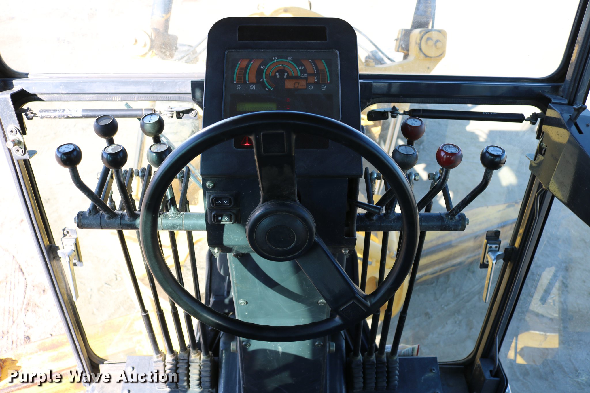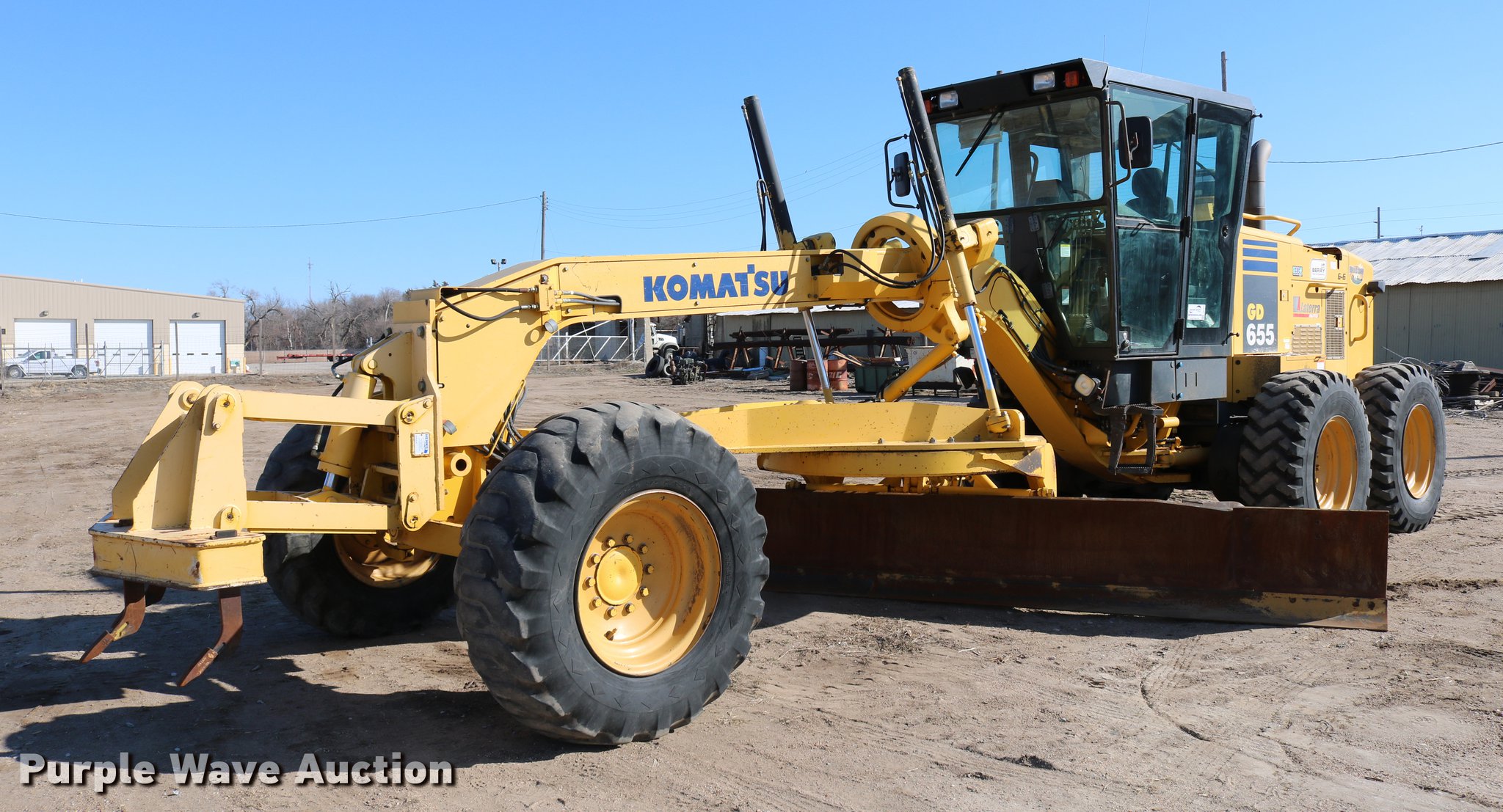 Purple Wave is selling a used Motor Grader in Kansas. This item is a 2007 Komatsu GD655-3E0 motor grader with the following: 9,389 hours on meter, Cummins 8.3L six cylinder turbo diesel engine, 180-200 HP, Serial 26851314, Powershift transmission, 8F-4R gears, EROPS, AC and heat, AM/FM, Suspension seat, Nine hydraulic control valves, Front and rear work lights, 14'W moldboard, Tip control, Side shift, Left blade extension, Circle slip clutch, Henke front mounted lift group, Henke front mounted scarifier, (9) shank capacity, (3) shanks, 17.5-25 tires, Serial 51520