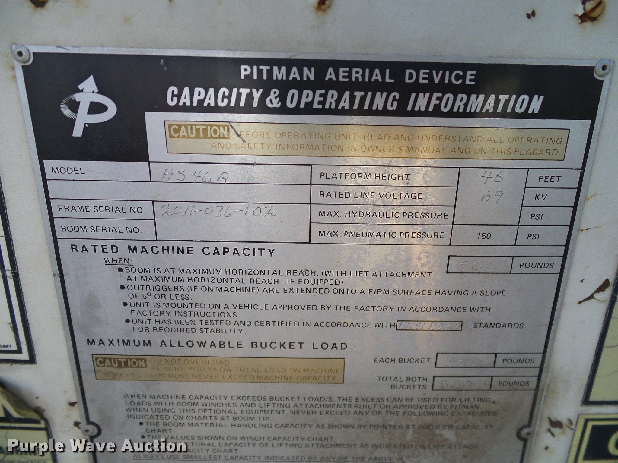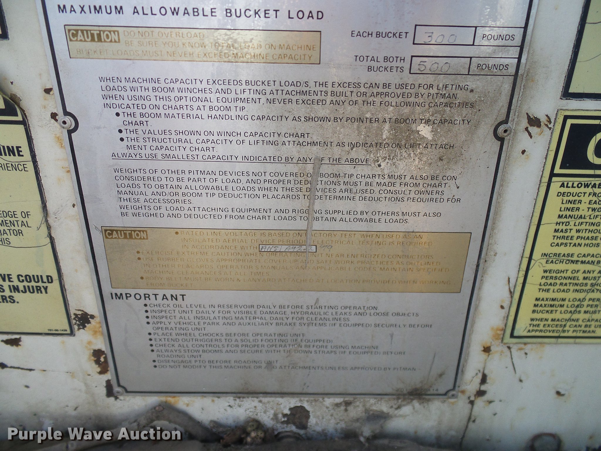 Purple Wave is selling a used Bucket Truck in Oklahoma. This item is a 1979 Ford F800 bucket truck with the following: 57,984 miles on odometer, Eight cylinder gas engine, Five speed manual transmission, Two speed rear end, Single axle, Heat, Suspension seat, PTO, IHL utility bed, 14'L, Shelving, Pitman M546A boom, 500 lbs max. lift capacity, 46' max. lift height, Man basket, Ground and platform controls, Boom rotation, Articulating and insulated boom, (4) outriggers, Serial 20H-036-102, Single fuel tank, 171" wheelbase, Spring suspension, Air brakes, 10.00R20 tires, Windshield cracked, Driver's door damaged, will not open fully, Unit# 302 83
