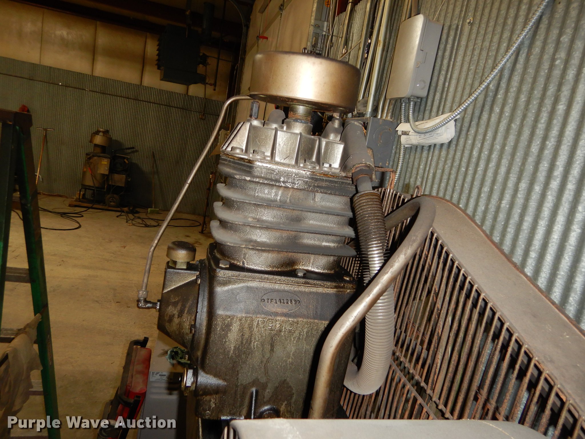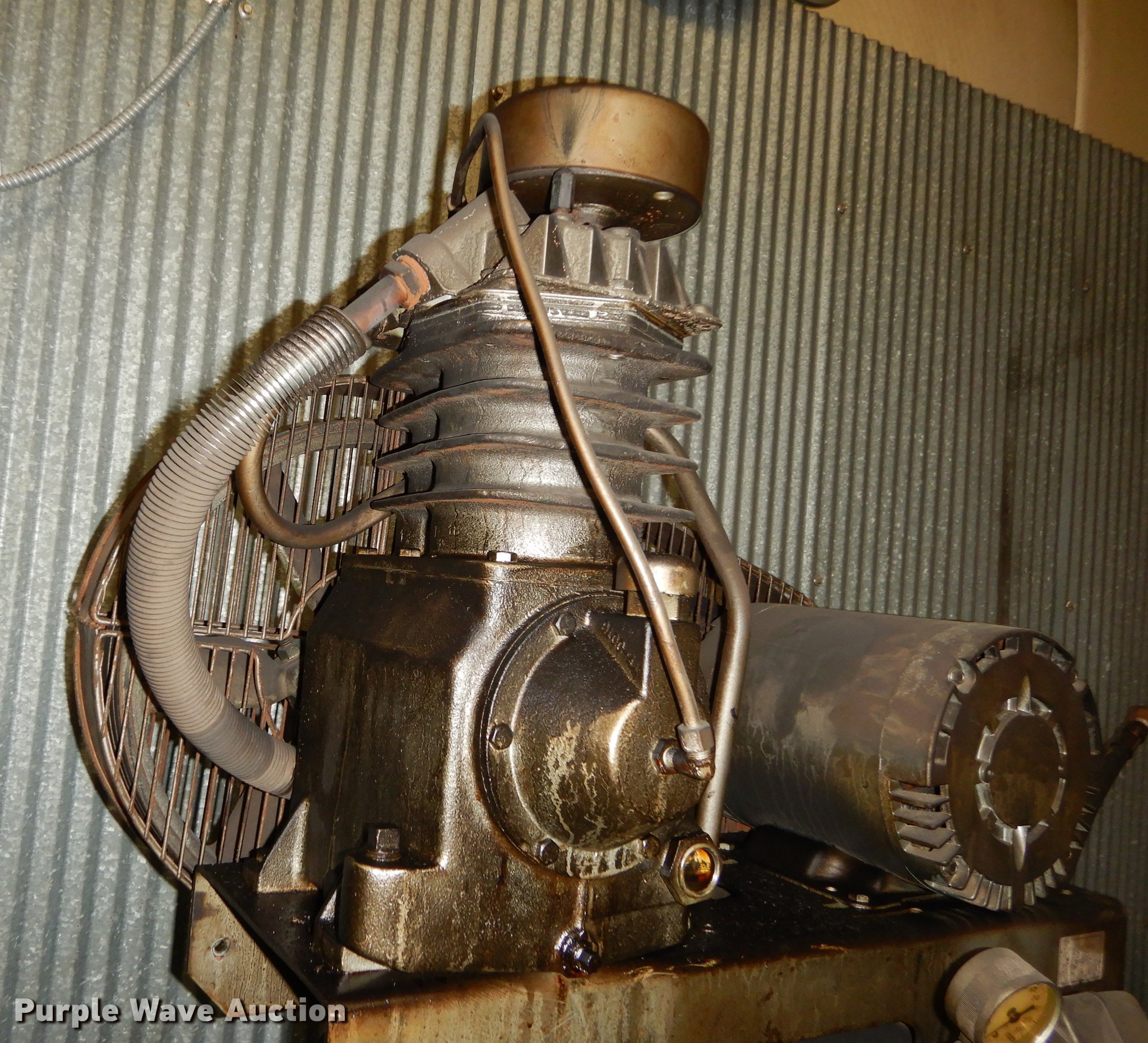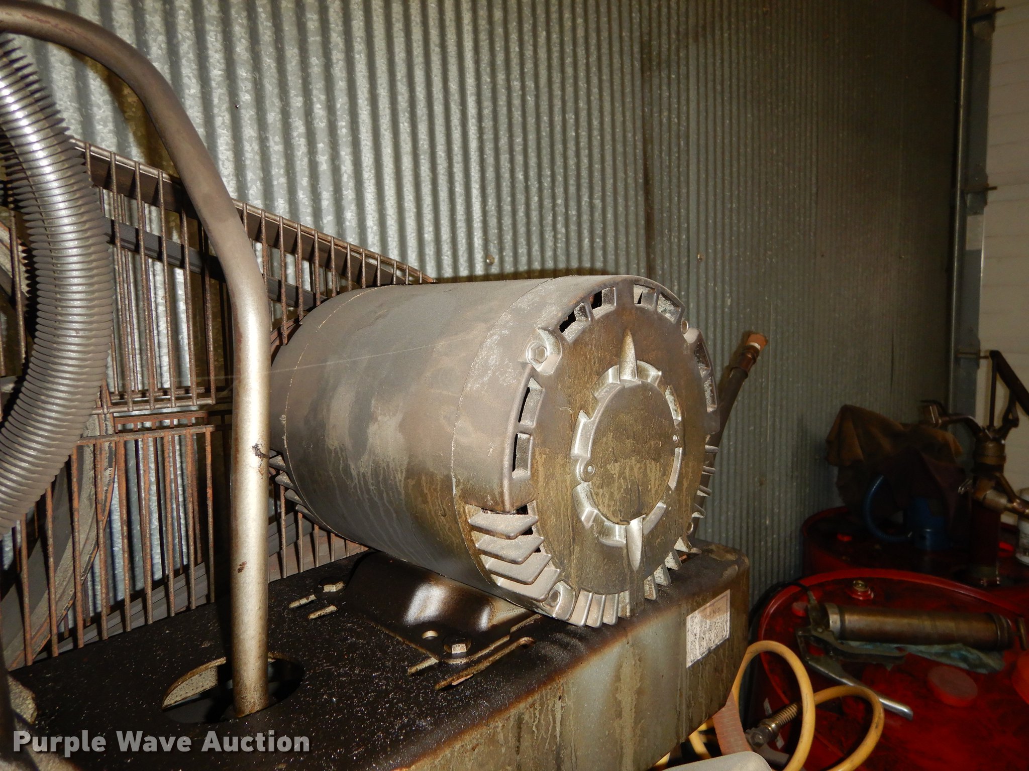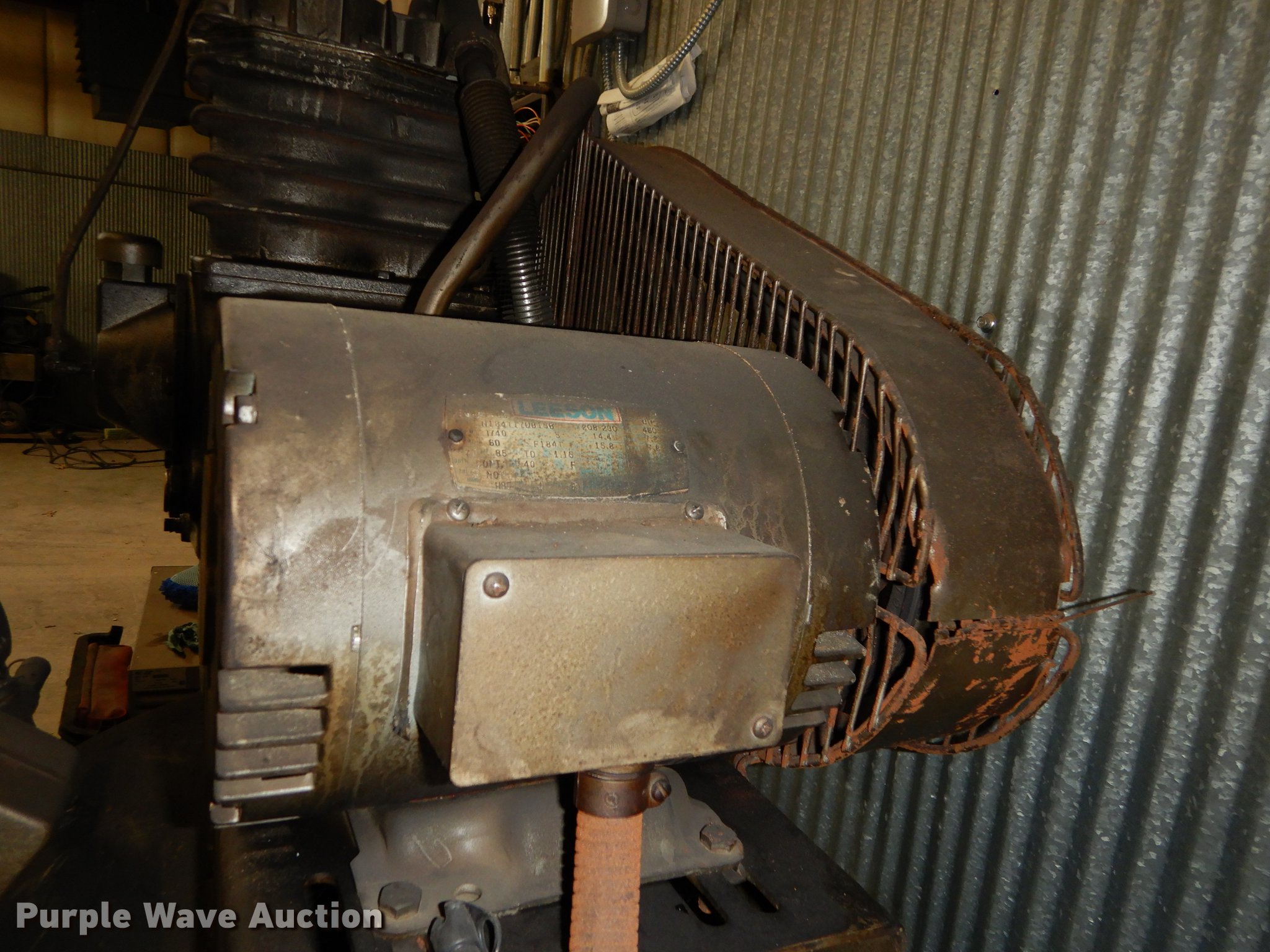 Purple Wave is selling a used Air Compressor in Kansas. This item is a Fliteway air compressor with the following: Leeson electric motor, Three phase, 80 gallon capacity, Unit has been in a fire, Covered in soot