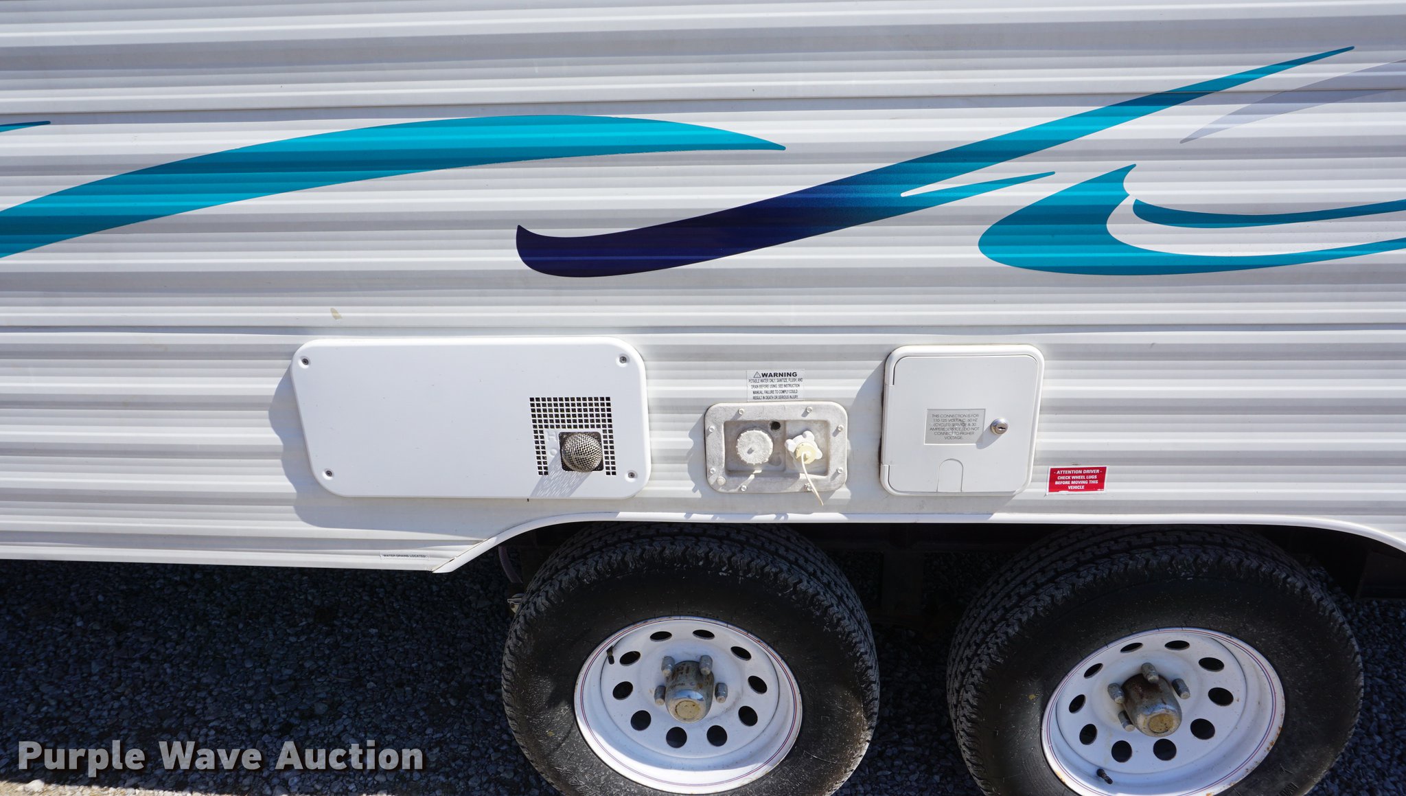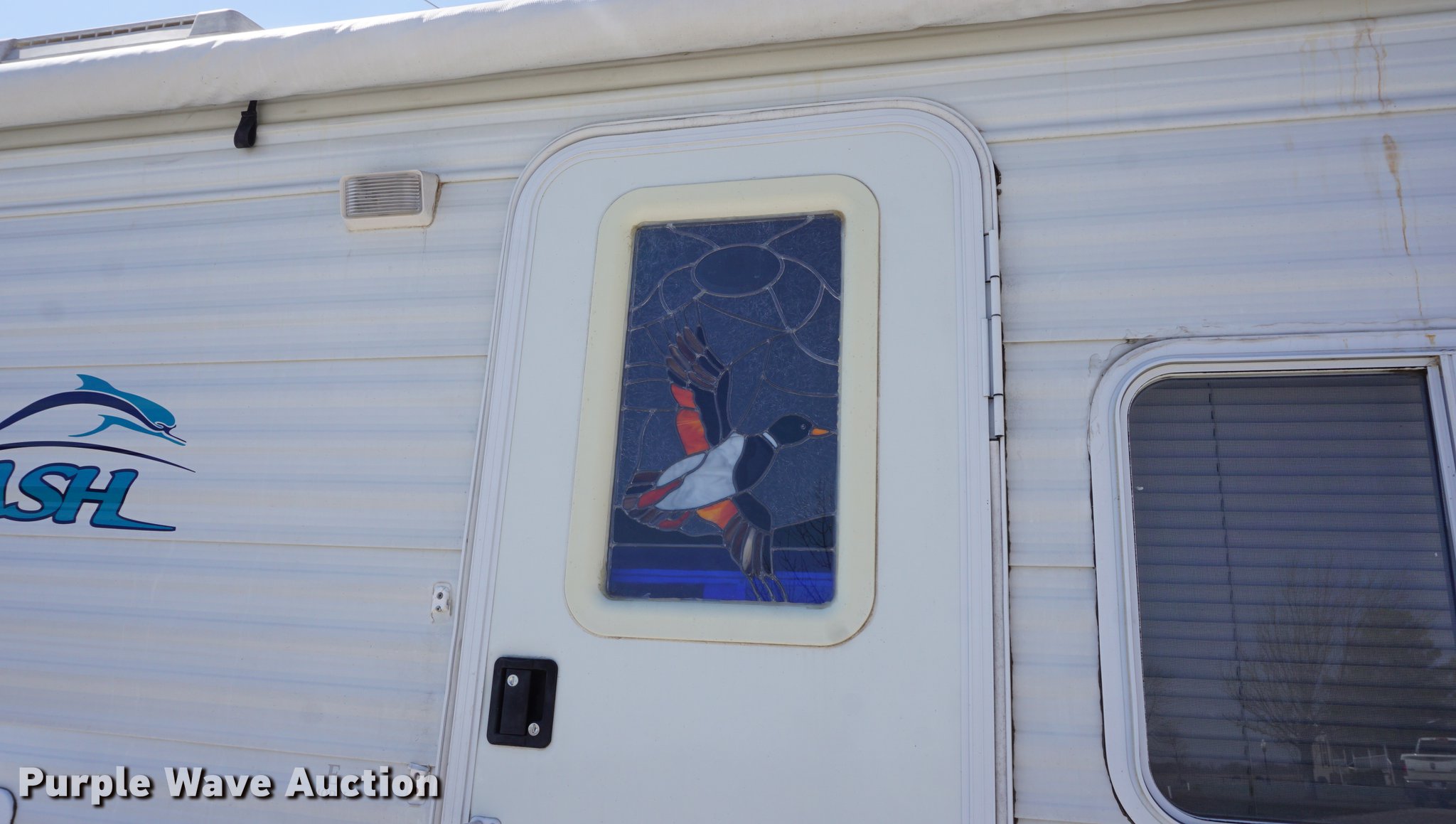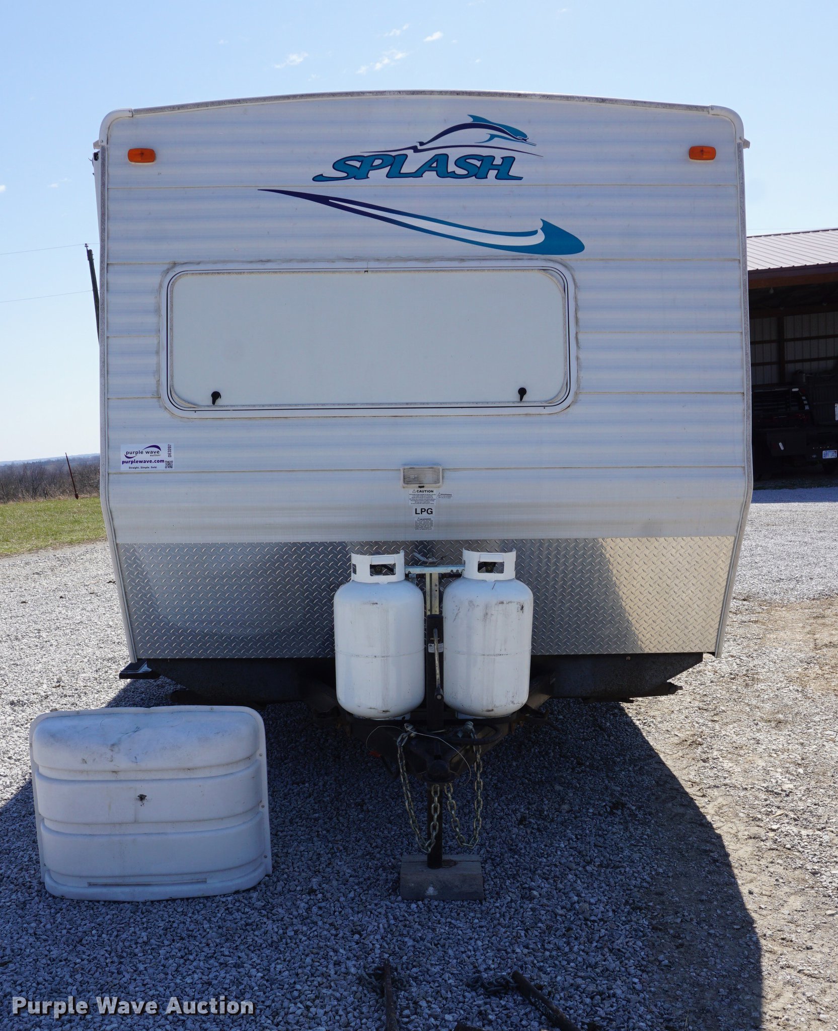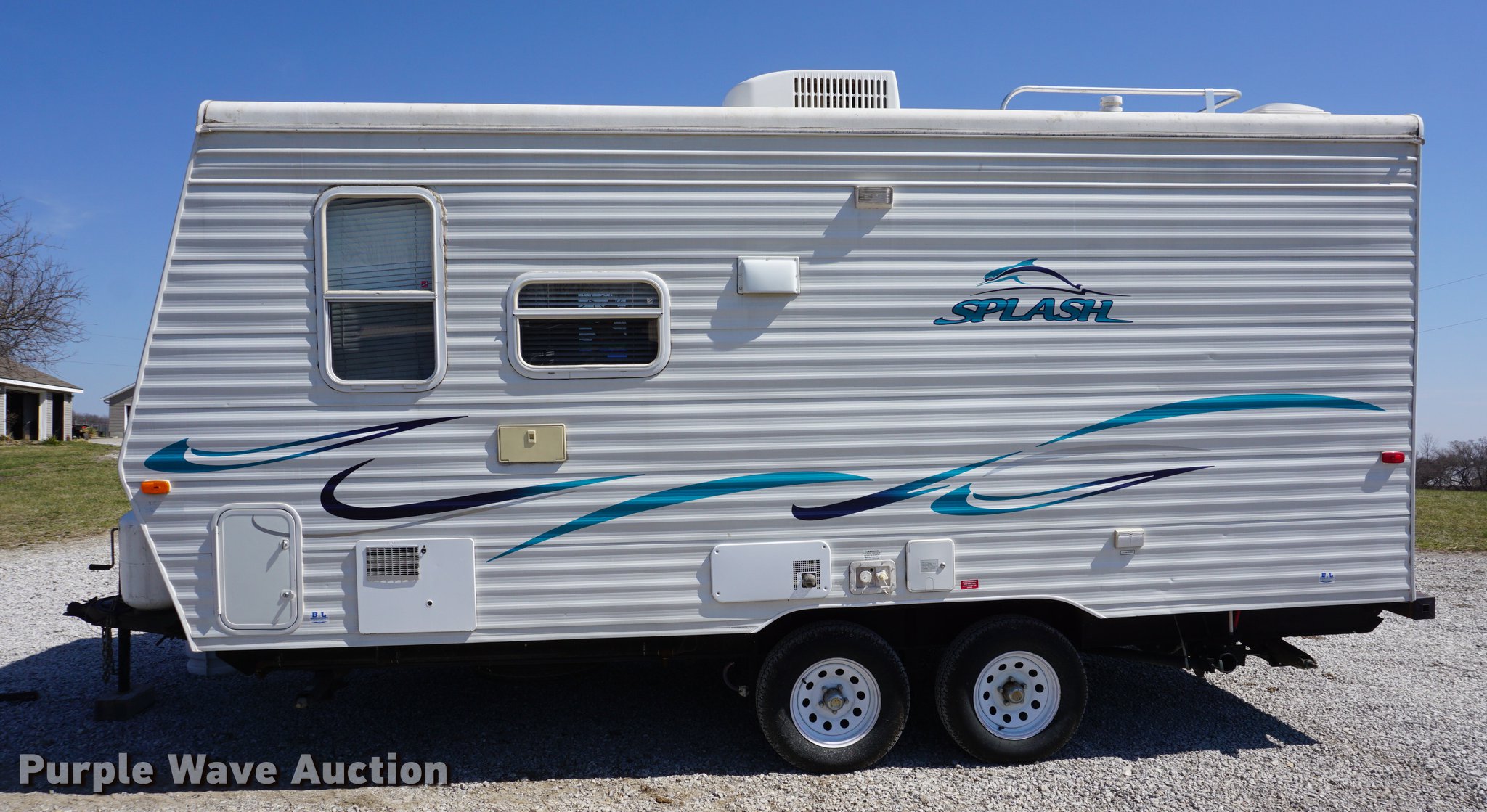 Purple Wave is selling a used RV in Kansas. This item is a 2003 National RV Splash camper with the following: 18'L, Awning, Four person sleeping capacity, Microwave, Three burner range/oven, Refrigerator/freezer, Shower, Toilet, AC and heat, AM/FM/CD, (2) propane tanks, Exterior shower, Handle broken, 2 5/16" ball hitch, Equalizer attachment, Tandem axle, 205/75R14 tires