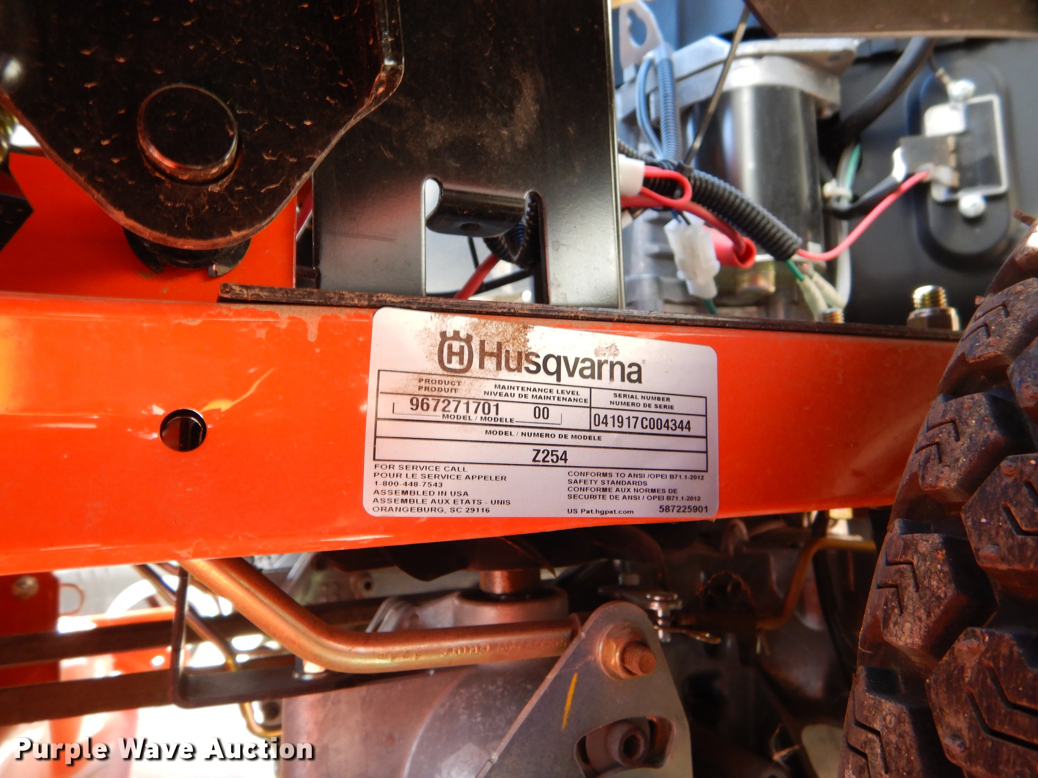 Purple Wave is selling a used Lawn Mower in Oklahoma. This item is a Husqvarna Z254 lawn mower with the following: 1 hours on meter, 54" cut, Kawasaki FR691V gas engine, 23 HP, Serial FR691VF14989, Hydrostatic transmission, Deck wash system, 11x6.00-5 front tires, 18x9.5-8 rear tires, Serial 041917C004344