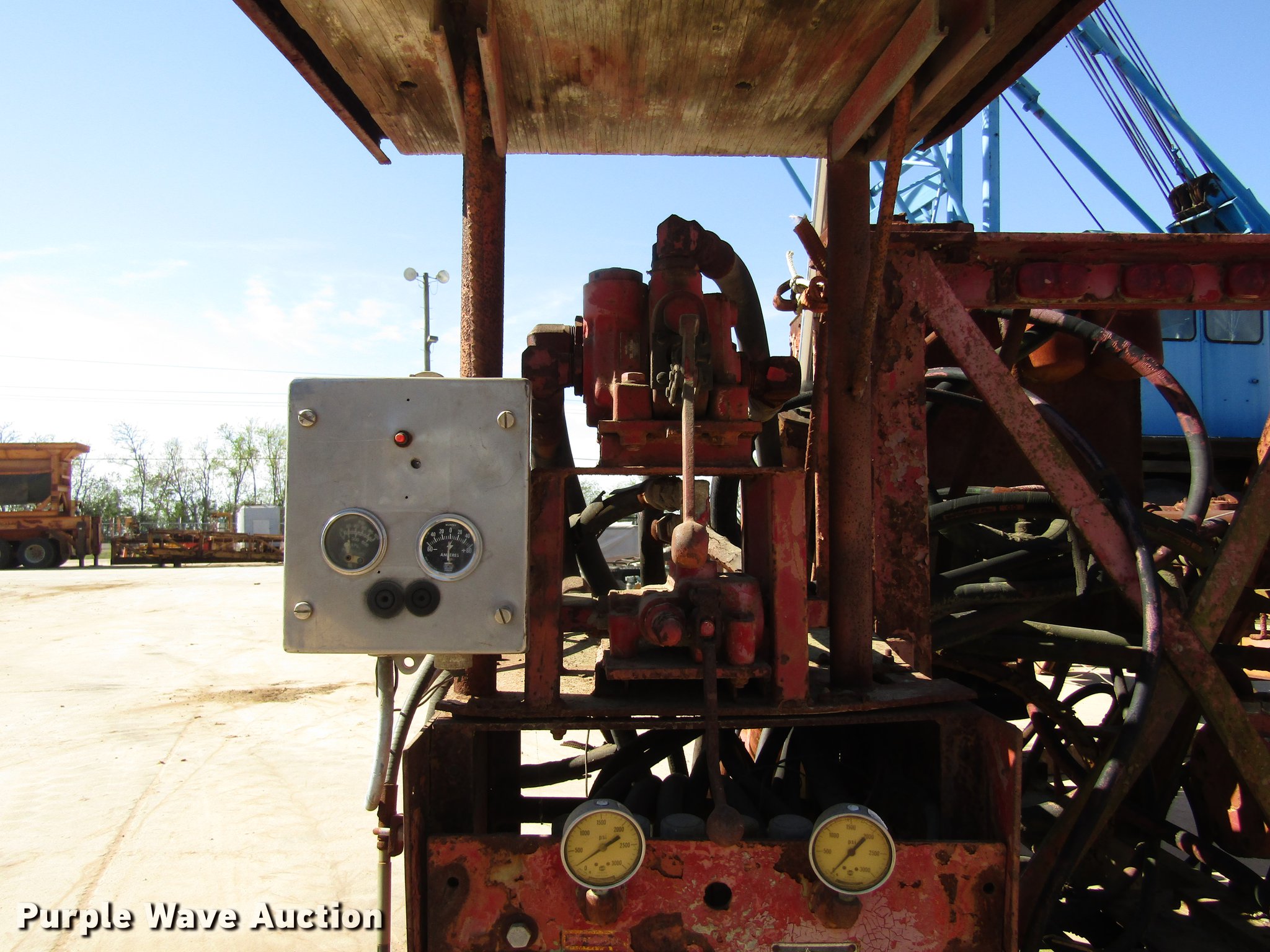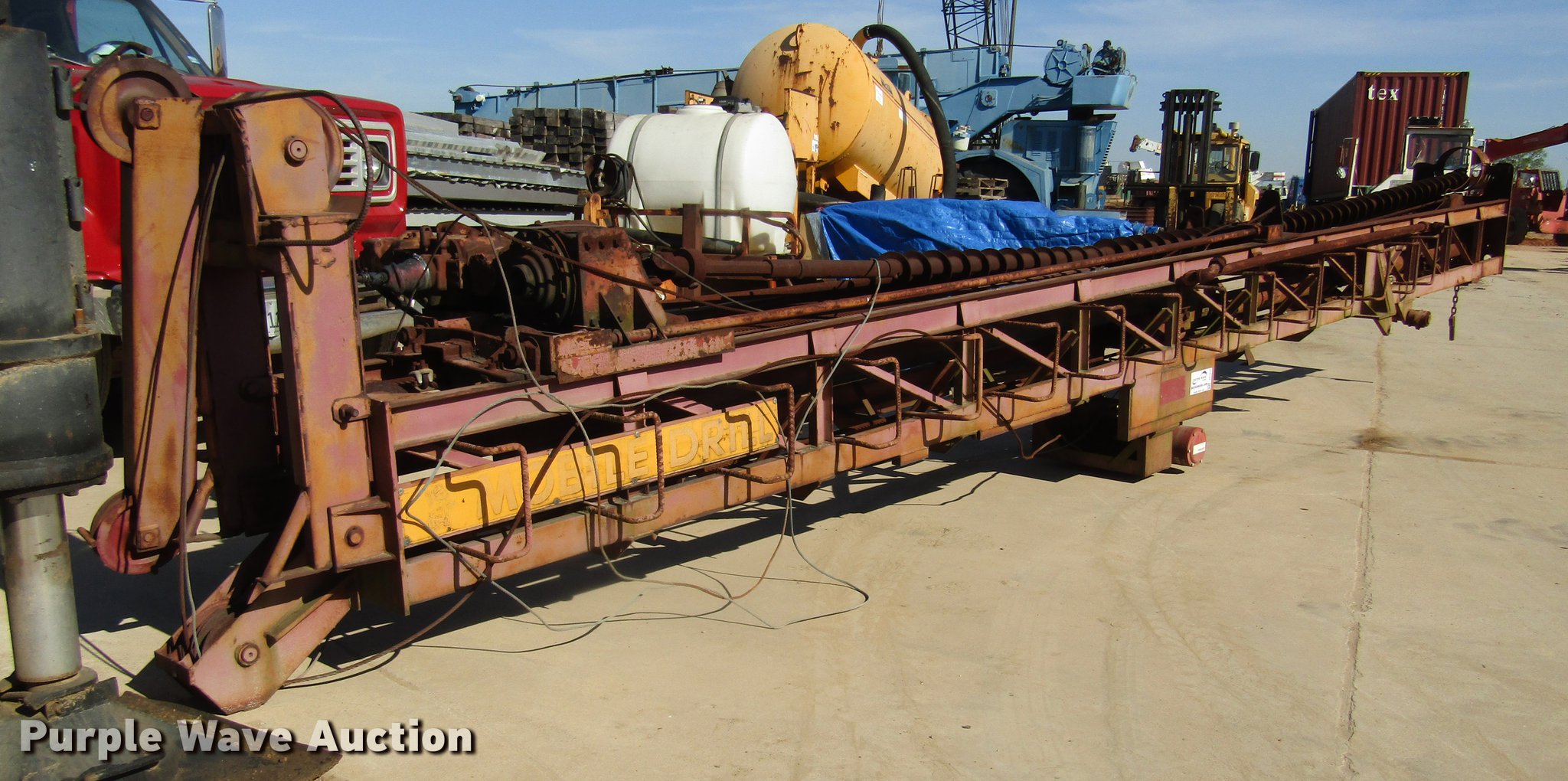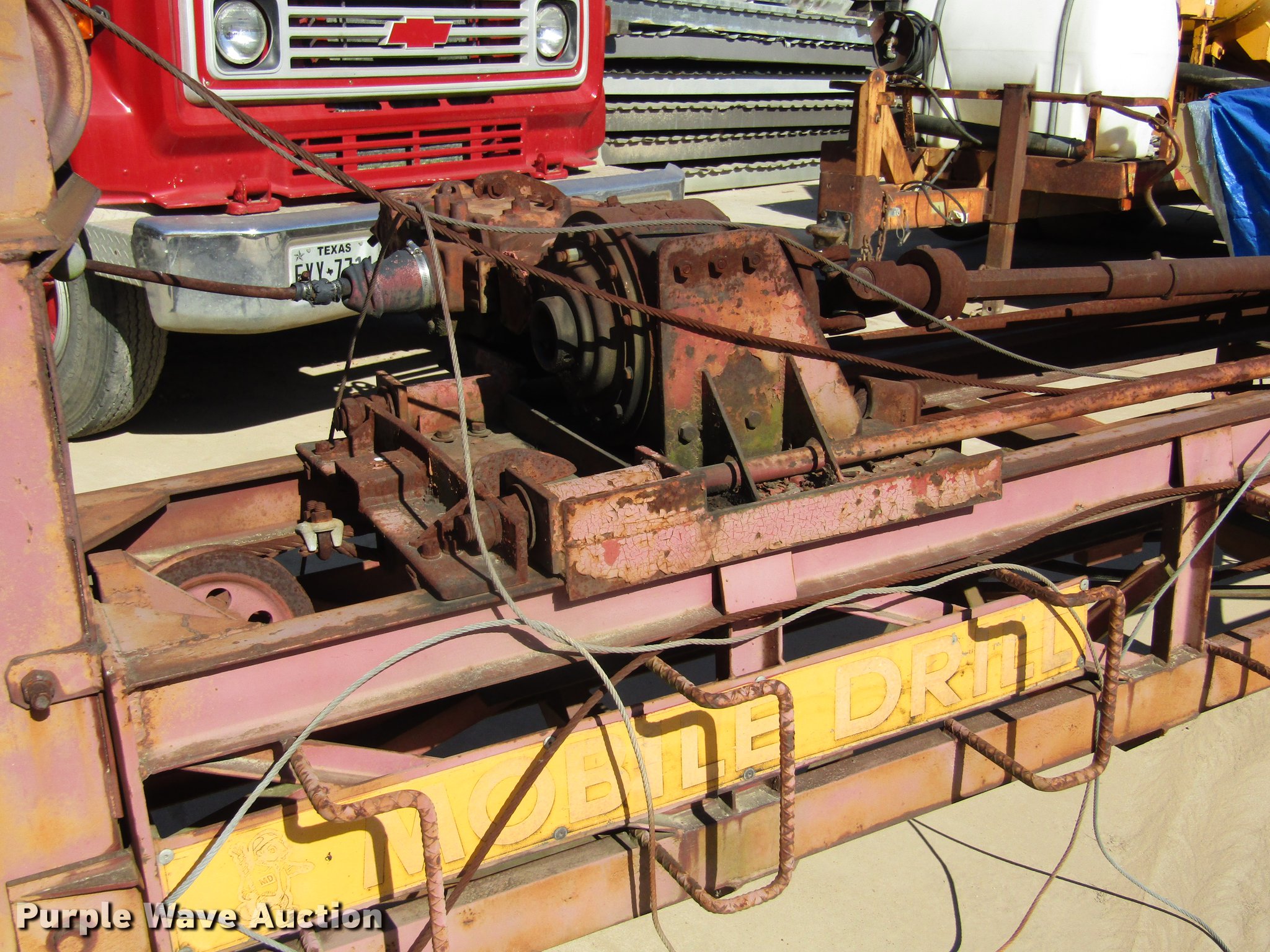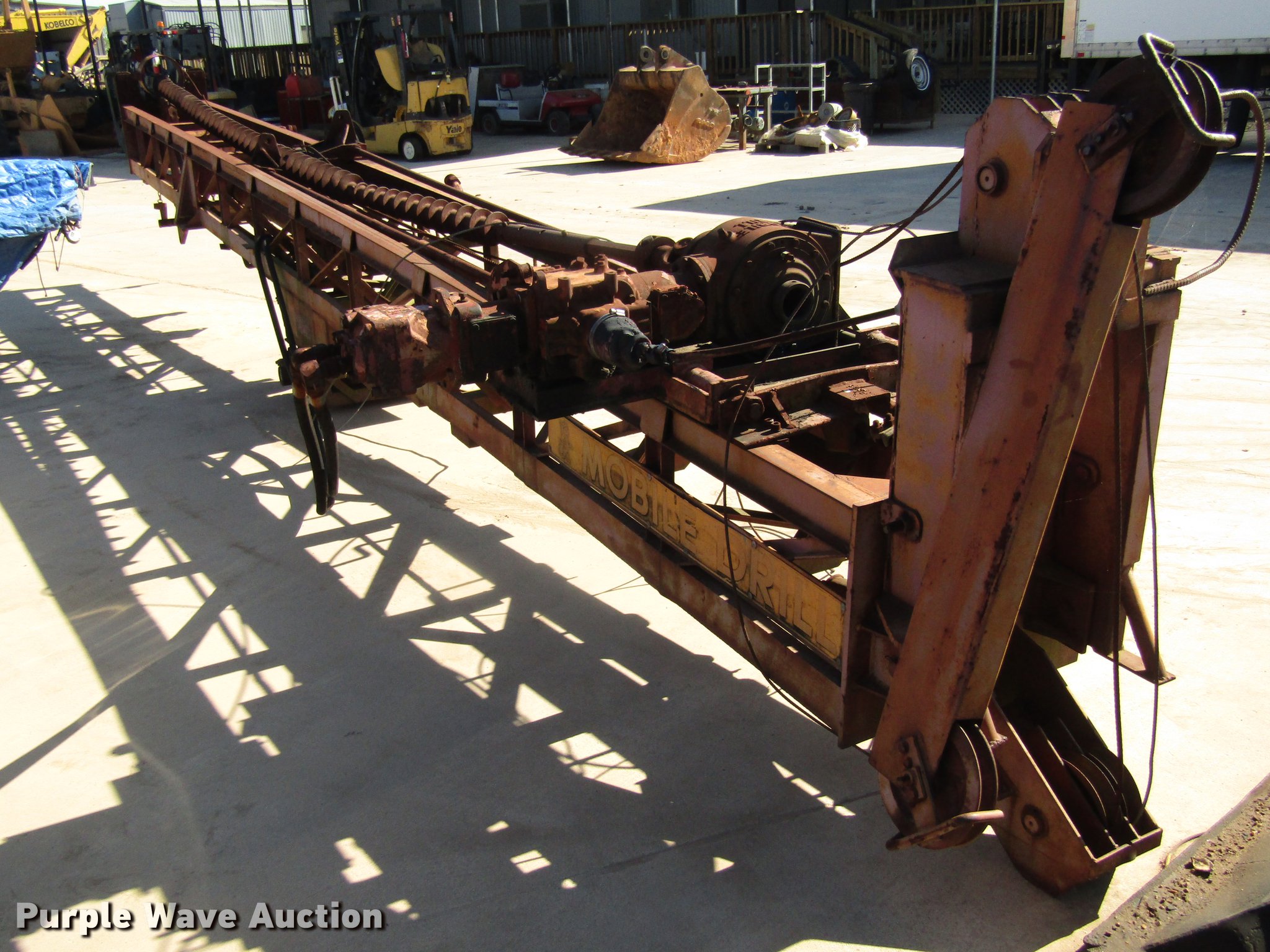 Mobile Drill 2100 hydraulic drill. 1,737 hours on meter, Perkins LB33470 four cylinder diesel engine Serial U783278C, Hydraulic drive, Dayton 3VJ75 winch, 24'L x 6" diameter bit, 5' x 12' main unit shipping dimensions, 30' x 5' carriage shipping dimensions, Serial 623442. 5050 FM 1960. Dayton, TX 77535