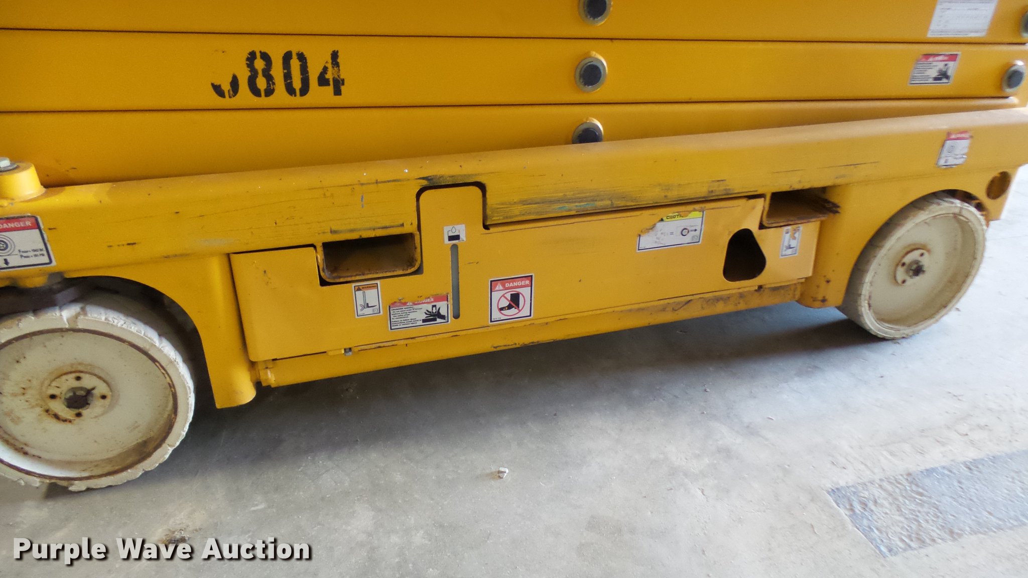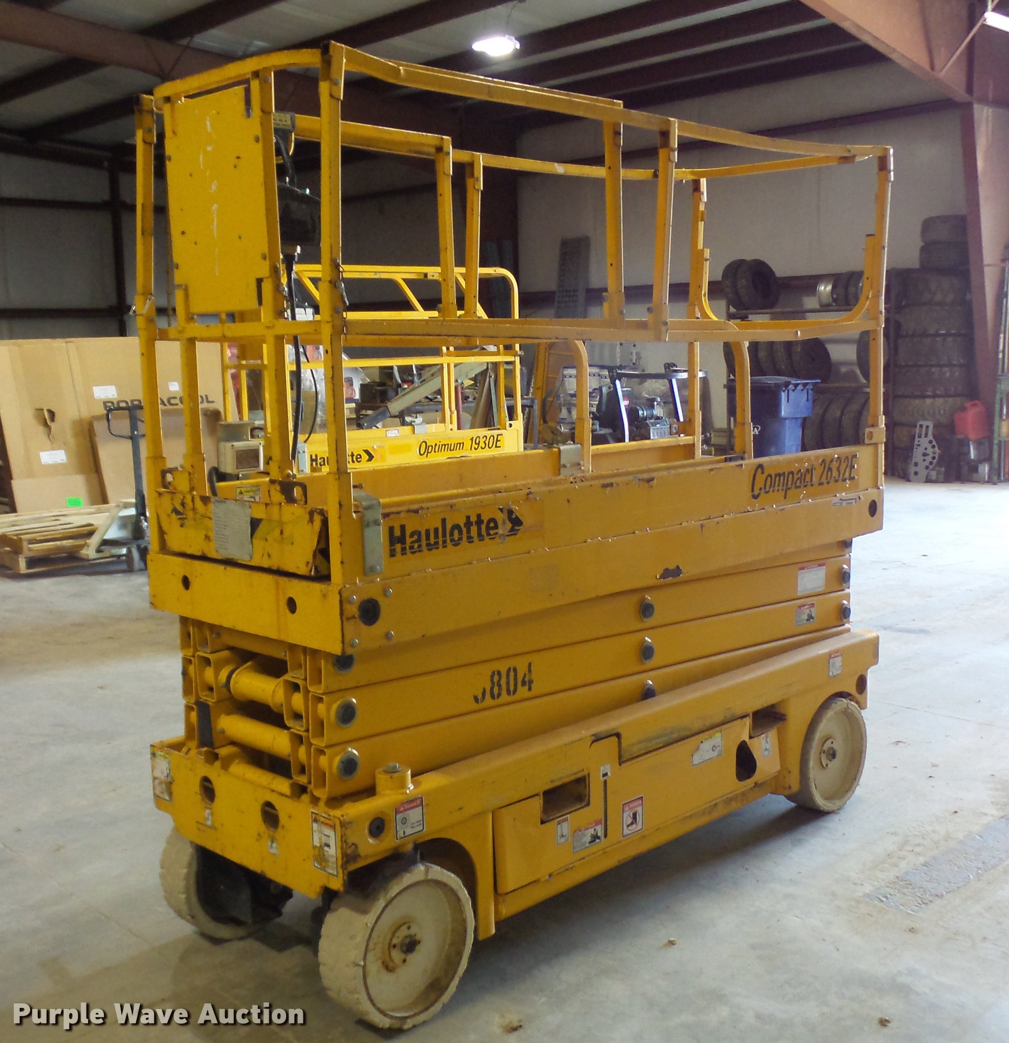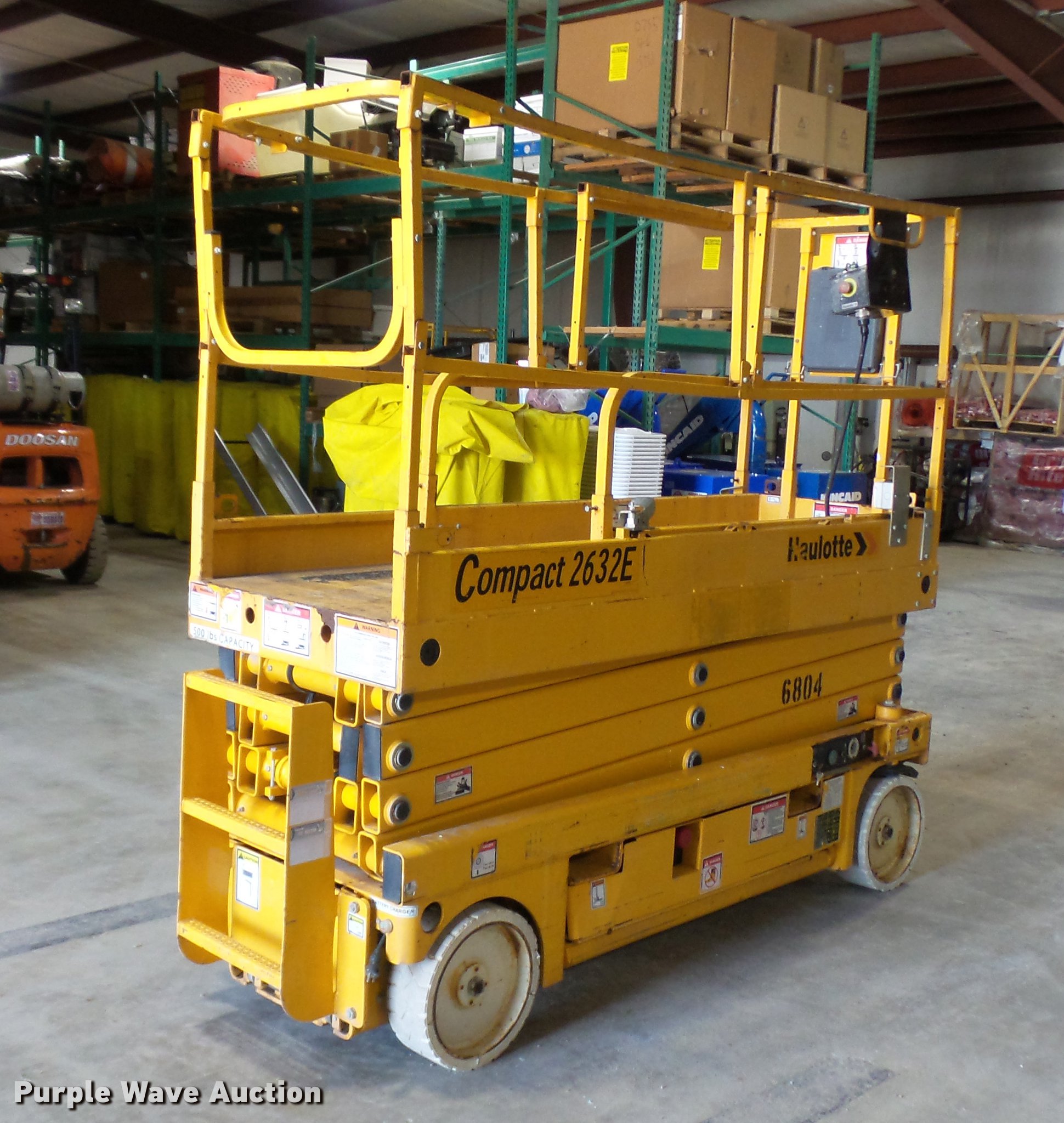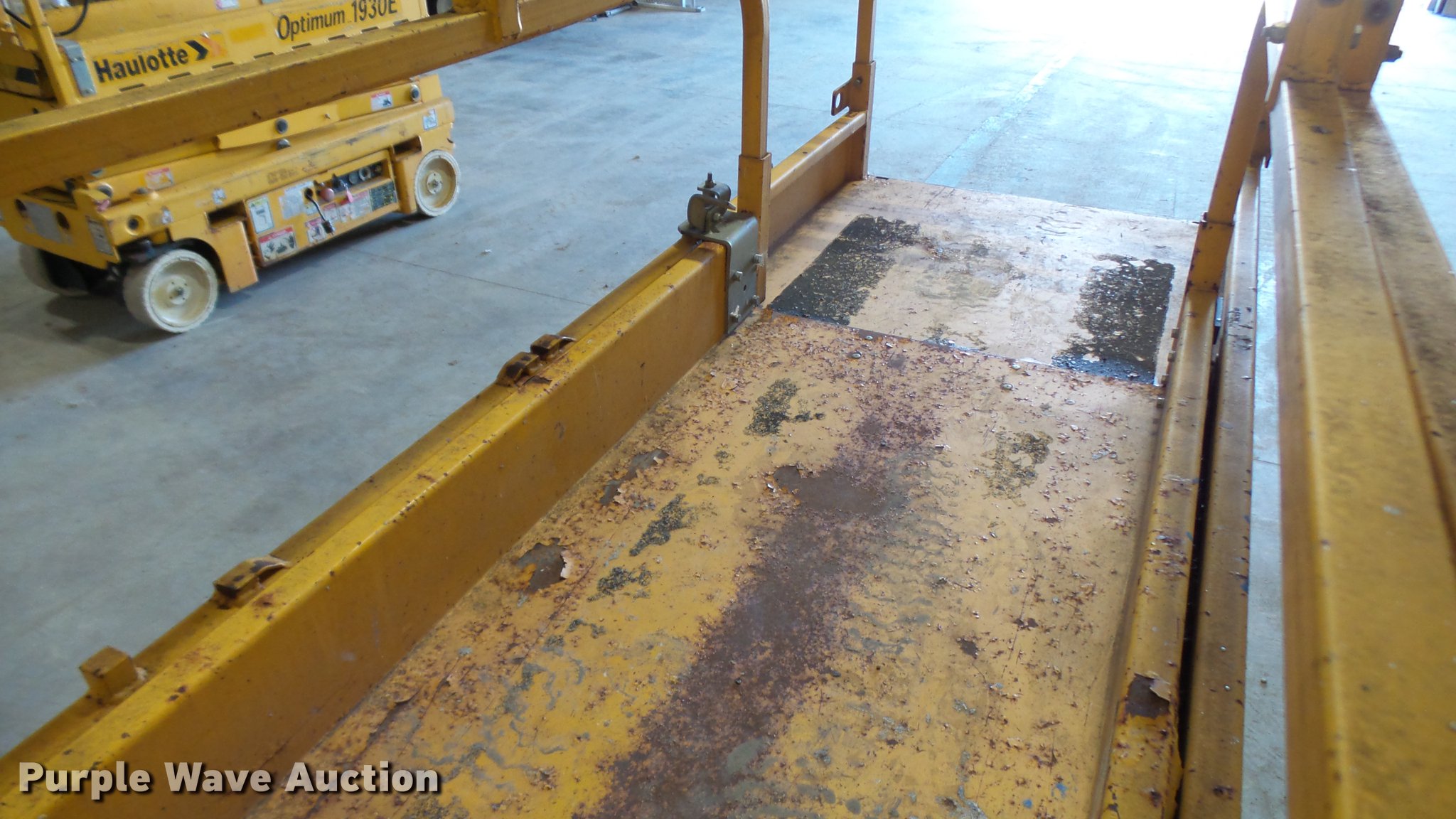 Purple Wave is selling a used Scissor or Vertical Lift in Missouri. This item is a 2007 Haulotte 2632E scissor lift with the following: 389 hours on meter, 24V operation, 500 lbs maximum lift capacity, 27' maximum lift height, 32"W platform, Manual platform extensions, AC power outlet, Platform and ground controls, Pot hole protection, On-board charger, Side fork lift pockets, Non-marking tires, 4,762 lbs. base operating weight, Serial CE125691