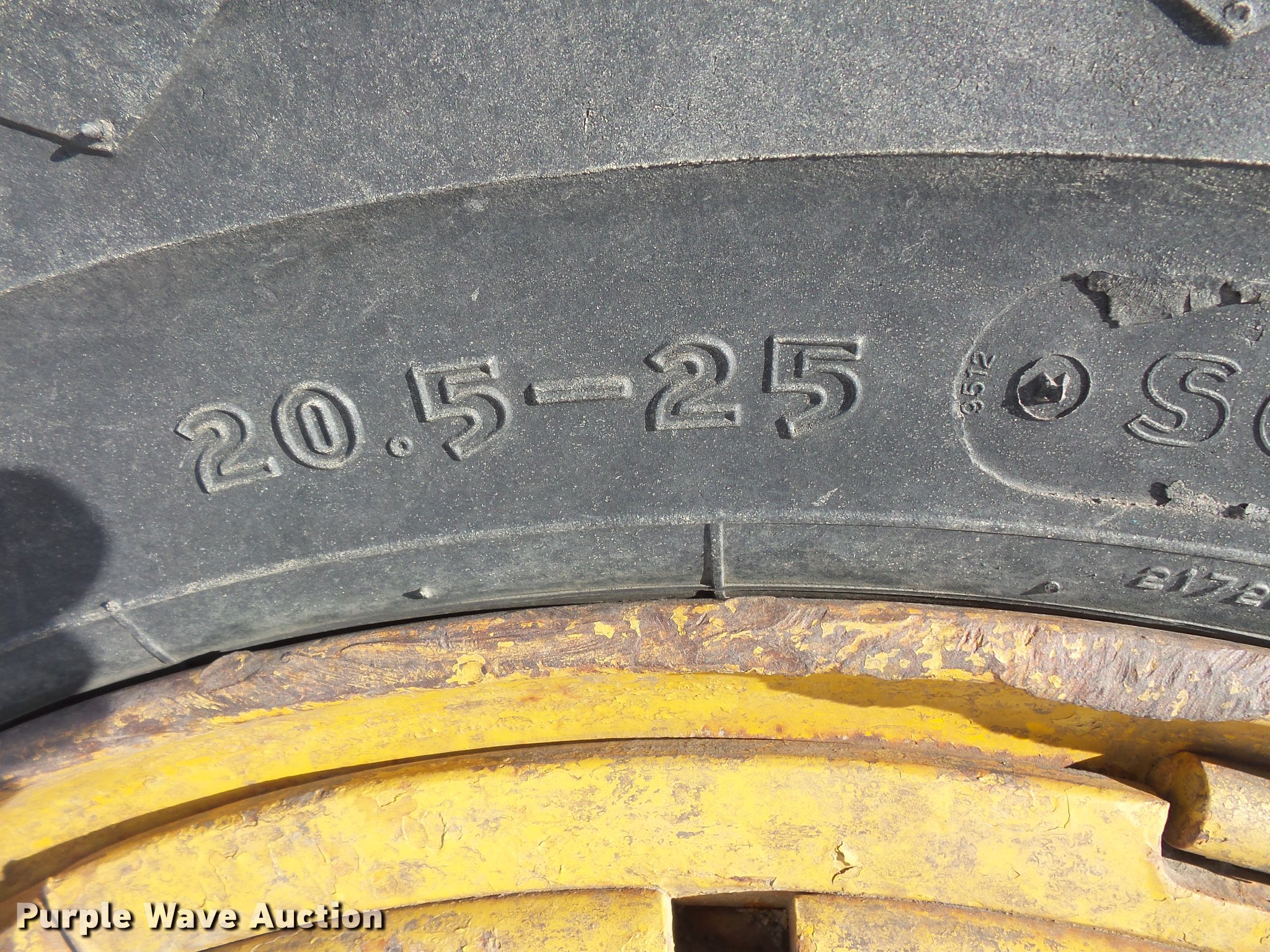 Caterpillar 435 scraper. 9'4" cutting width, 15-18 cu. yd. capacity, Rear push block, Hydraulic lift, Pin hitch, 20.5-25 front tires, 26.5R25 rear tires, Serial 45D916. Jensen Excavating & Trucking, LLC. 951 W Plaza St. Albert Lea, MN 56007
