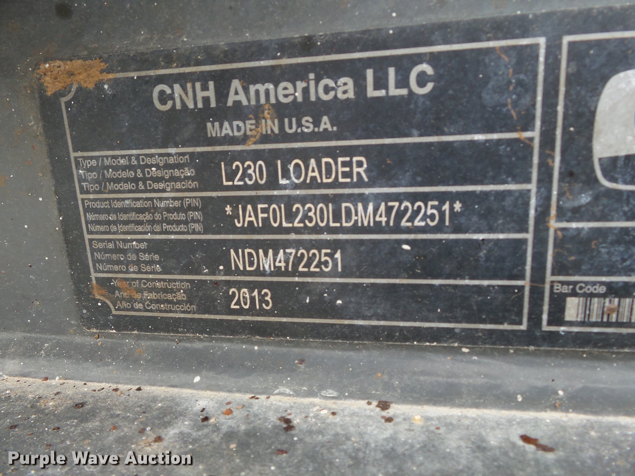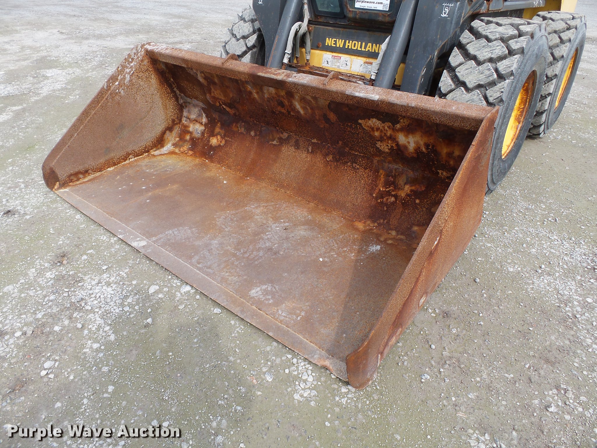 Purple Wave is selling a used Skid Steer Loader in Arkansas. This item is a 2013 New Holland L230 skid steer with the following: Fiat FPTF5B four cylinder diesel engine, 90 HP, Two speed hydrostatic transmission, Enclosed cab, AC and heat, AM/FM, Hand and foot controls, Suspension seat, Front and rear work lights, Wipers, High flow auxiliary hydraulics, Hydraulic quick coupler, 79"W bucket, Weld-on cutting edge, 3,400 lbs capacity, Counter weights, Titan 14-17.5 tires, Hour meter inoperable, Serial NDM472251, Unit# 37933