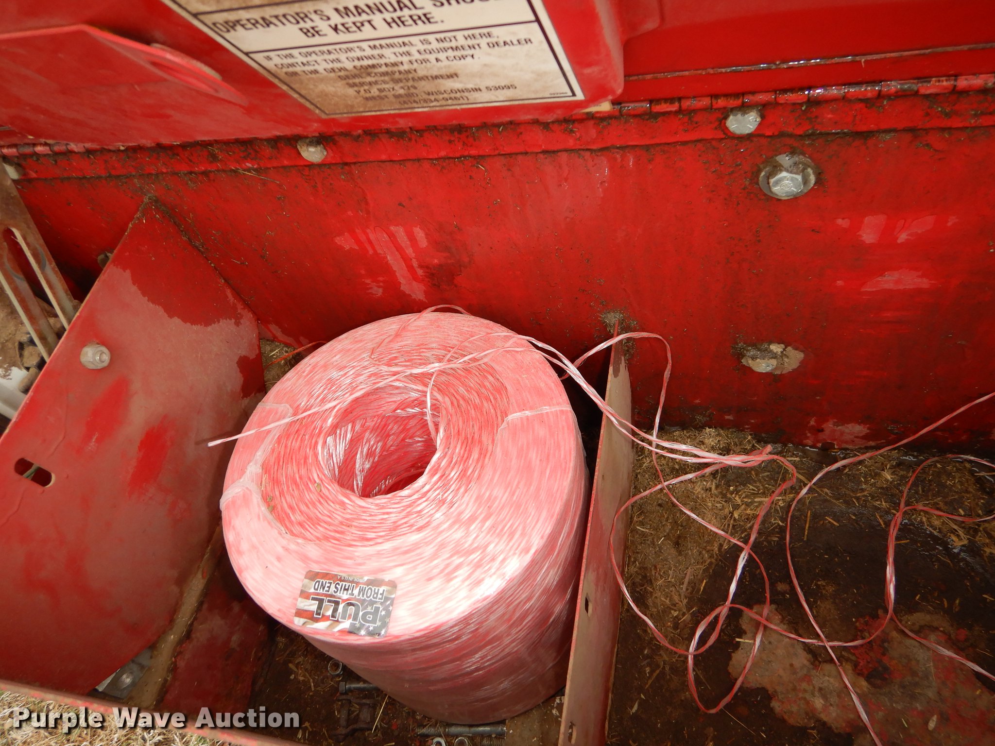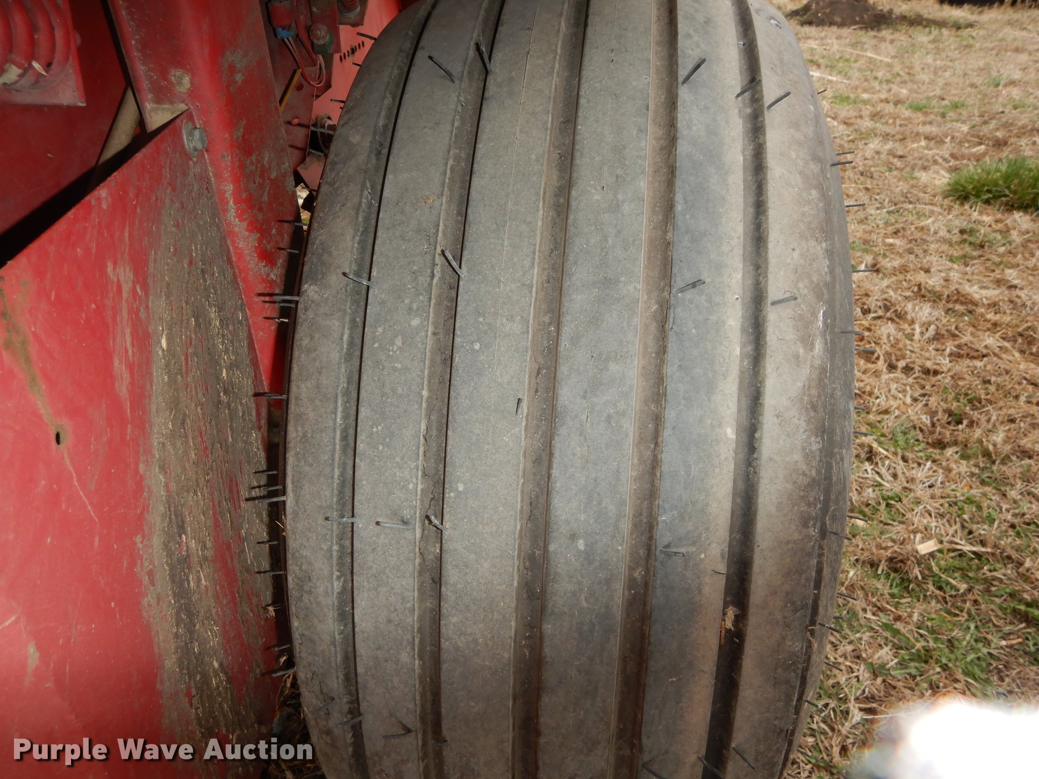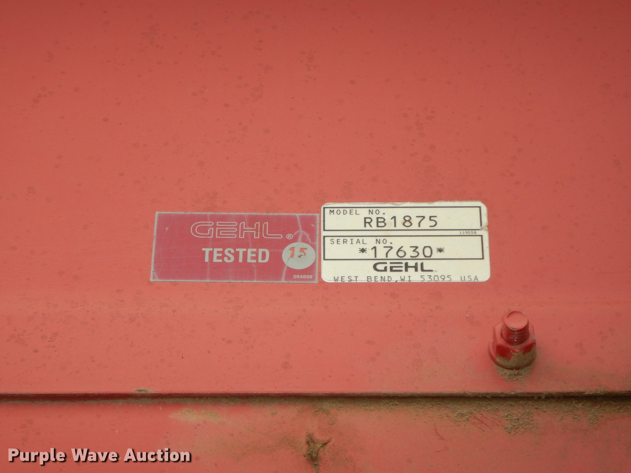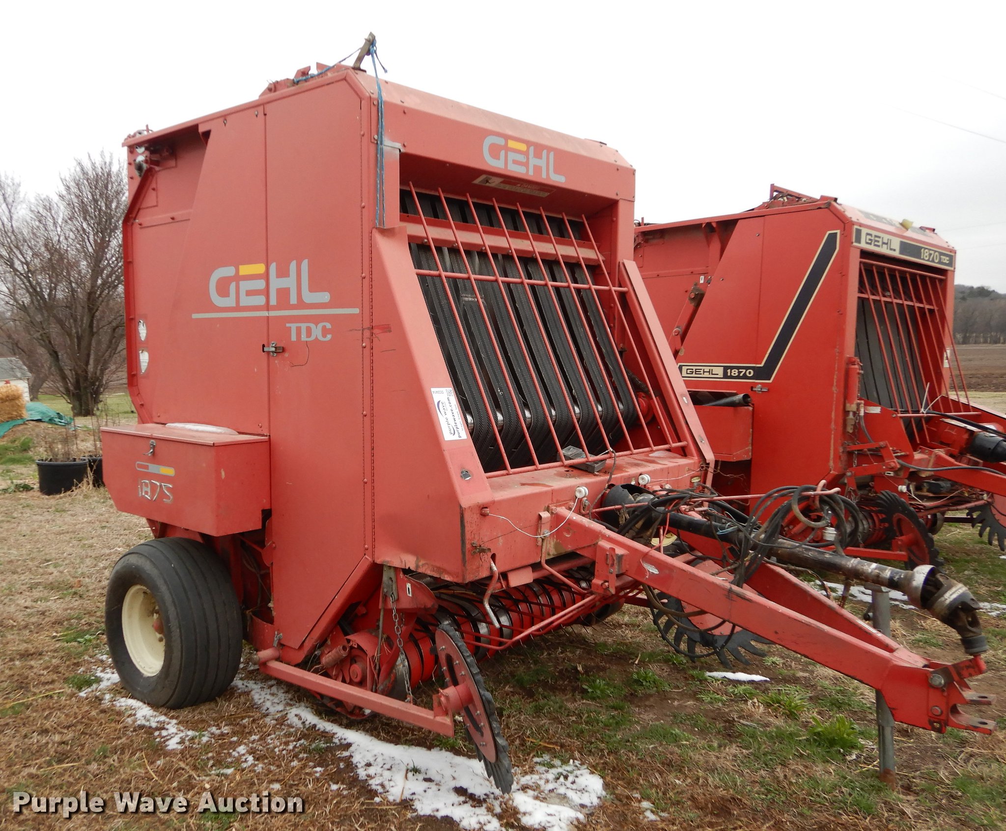 Purple Wave is selling a used Round Baler in Kansas. This item is a Gehl 1875 TDC round baler with the following: 5' x 6' bale capacity, 5'W pickup, Hydraulic pickup lift, Gathering wheels, Worn, Gehl monitor, Twin twine tie, Bale ramp, 540 PTO, Pin hitch, Carlisle 31x13.50-15 tires, Operators manual, Serial 17630