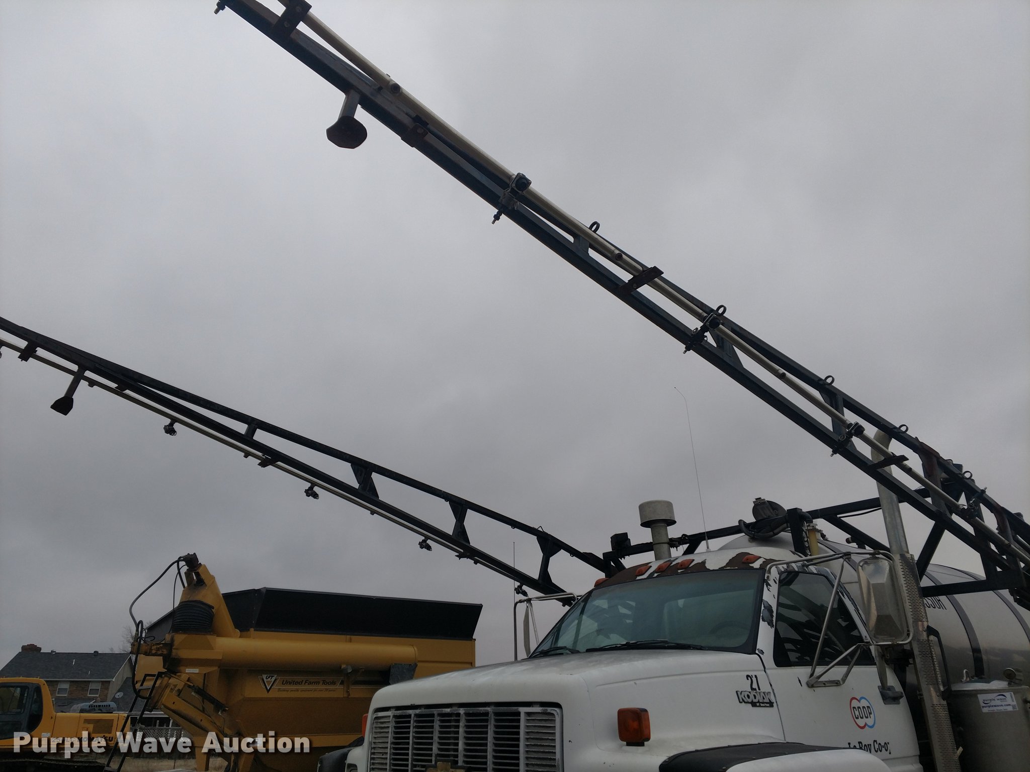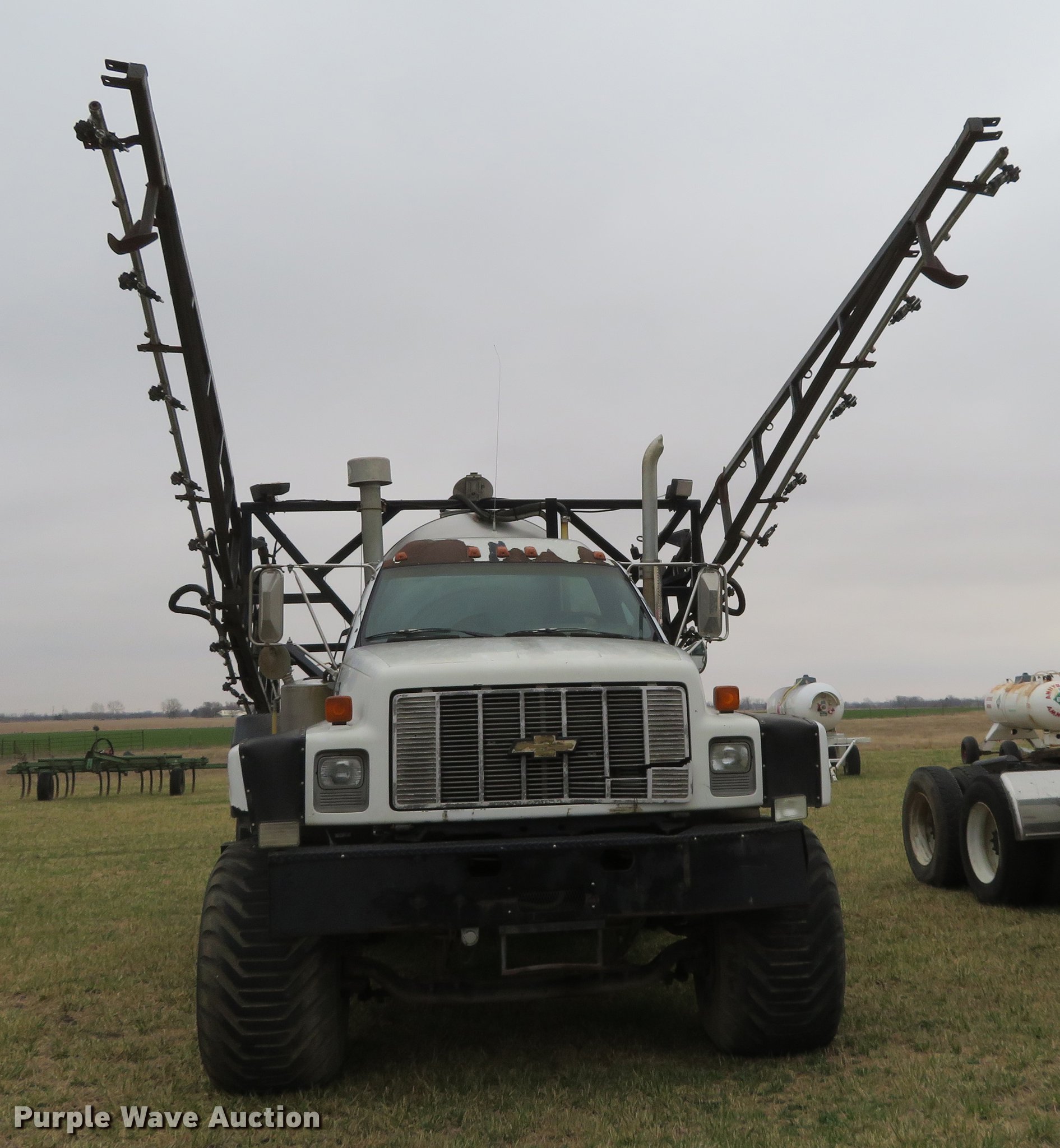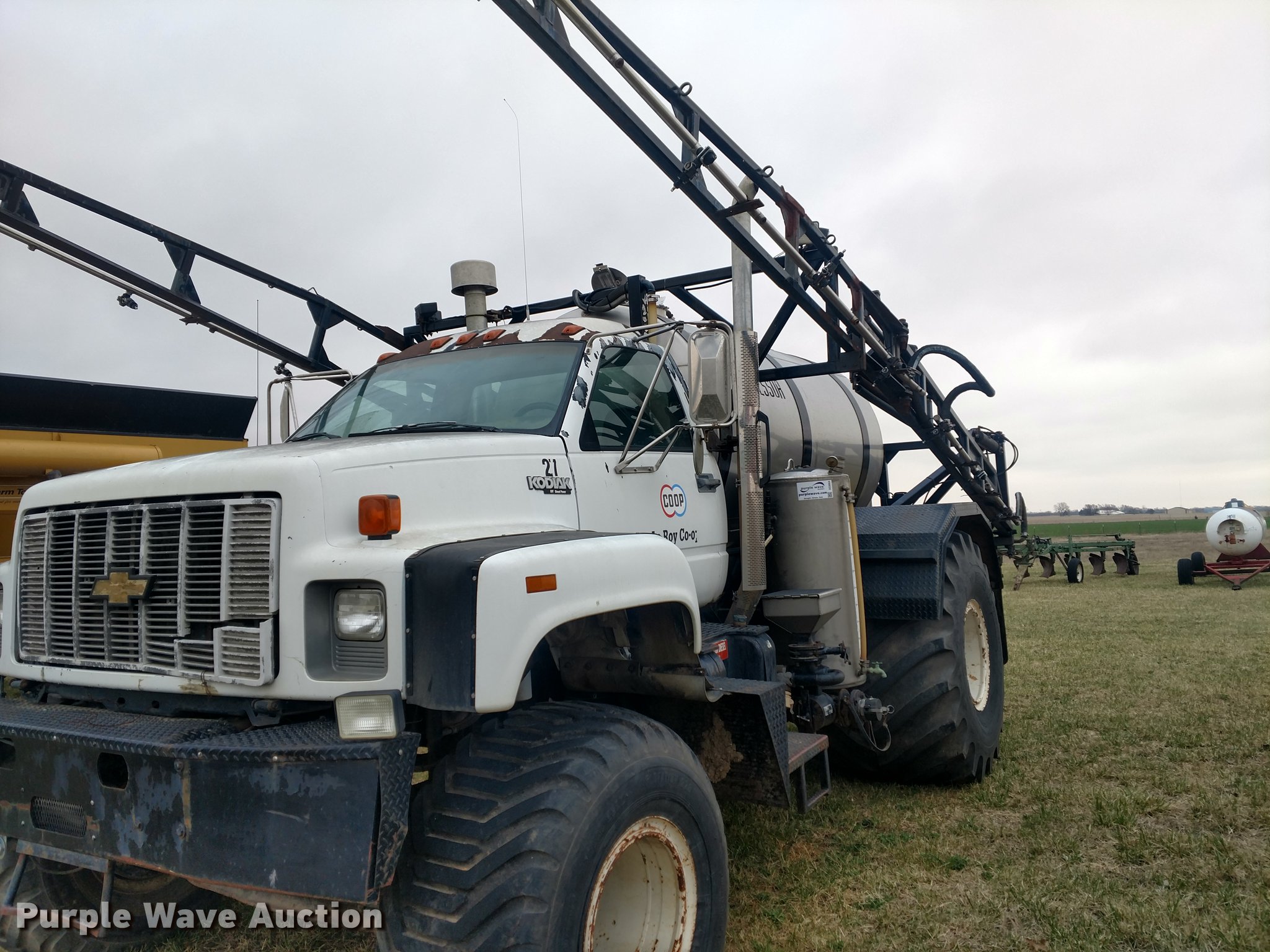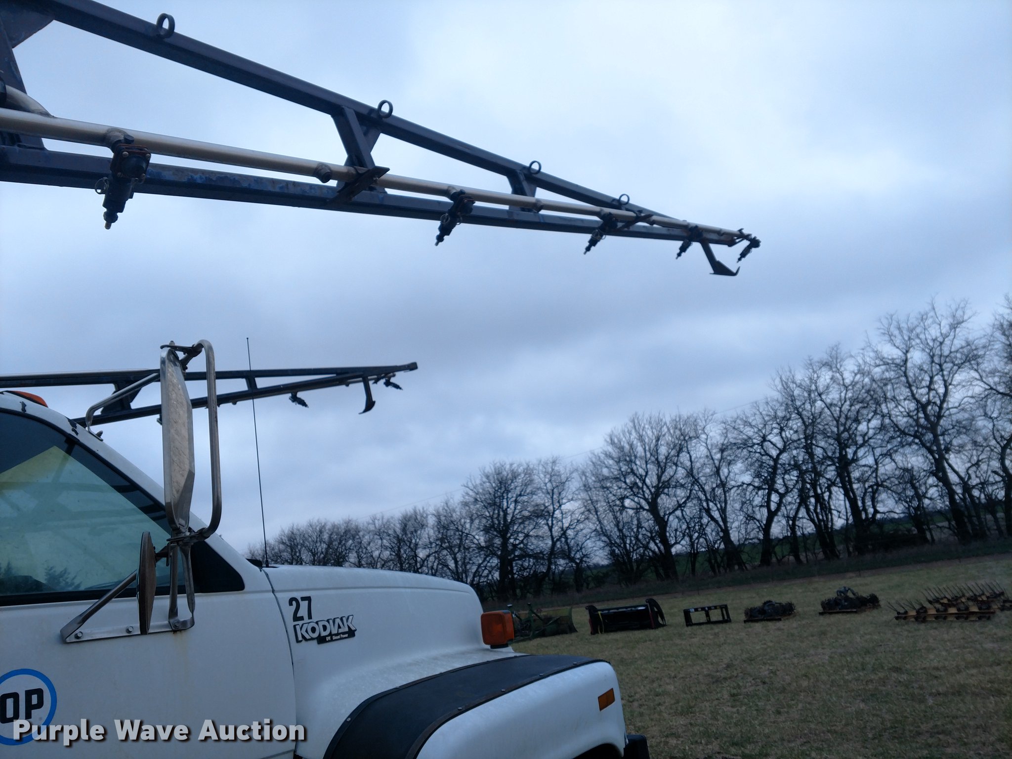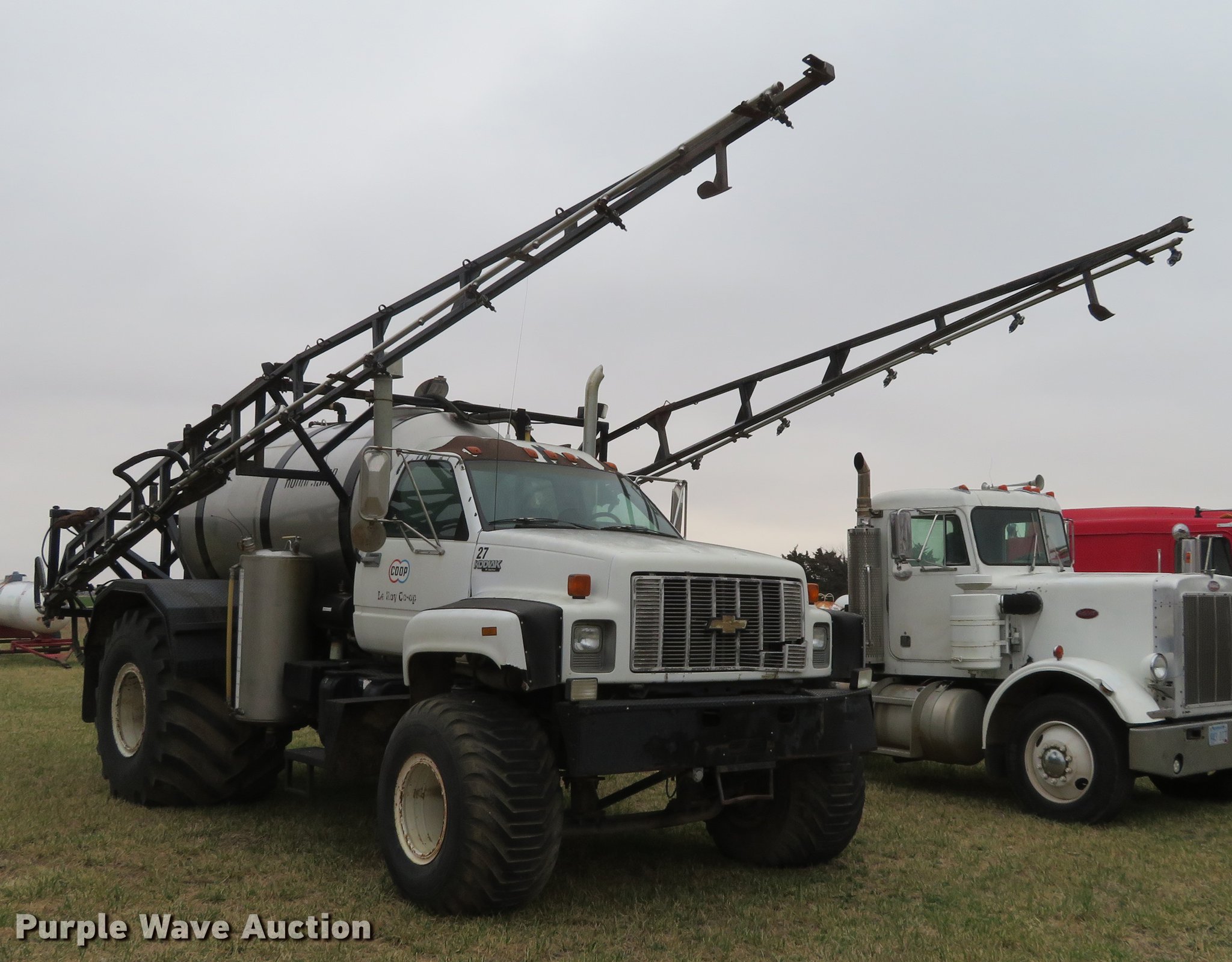 1994 Chevrolet Kodiak applicator truck. 81,113 miles on odometer, Caterpillar diesel engine, Automatic transmission, Manual windows and locks, 1,600 gallon stainless steel tank, 90'W booms Single nozzle bodies, 48x25.00-20 front flotation tires, 66x43.00-25 rear flotation tires. Item qualifies as an implement of husbandry and does not require a title in Kansas. Transfer of ownership documentation will be a bill of sale. 1GBP7H1J1RJ106985. Stands Farms, LLC. El Dorado, KS 67042