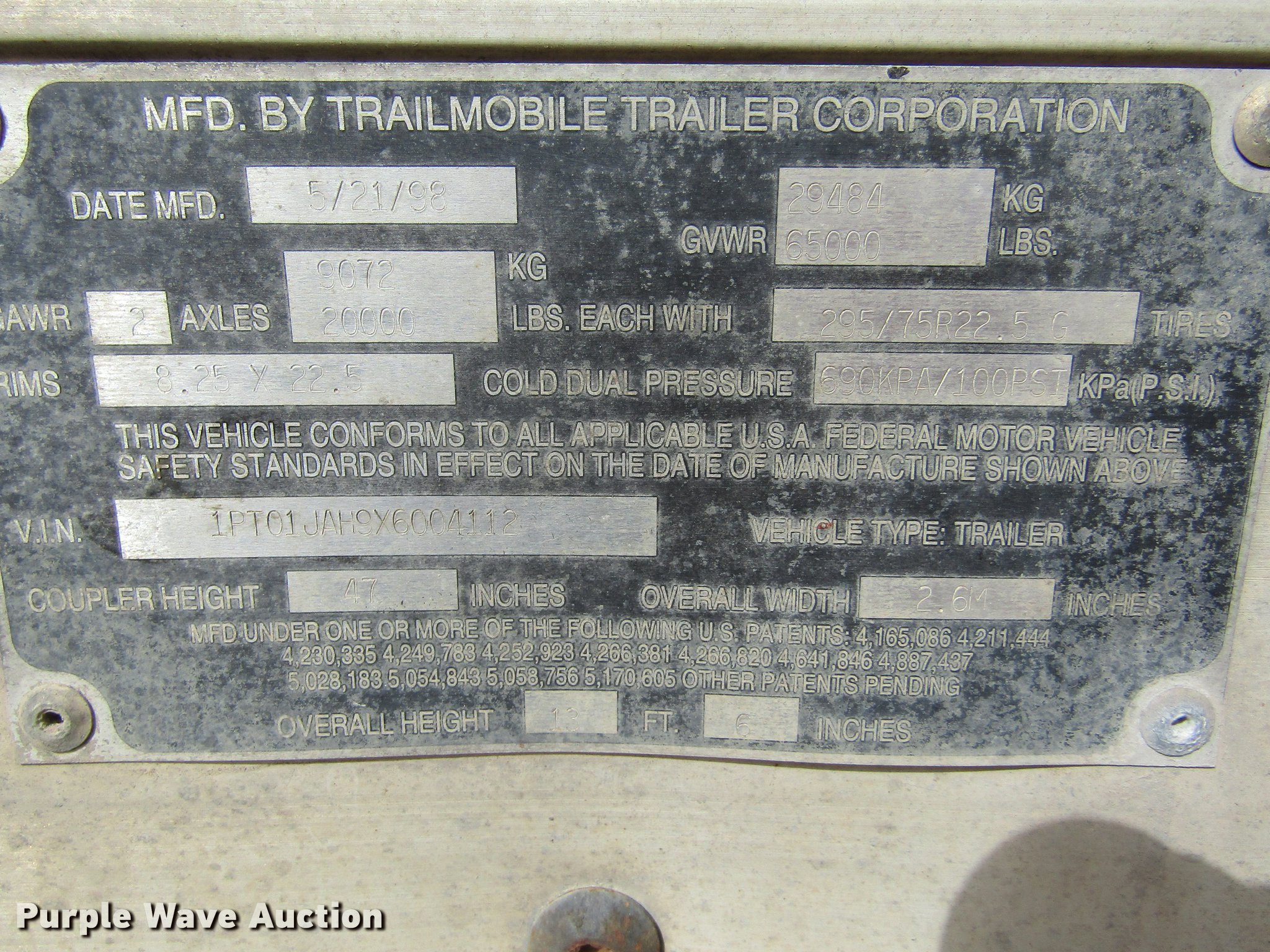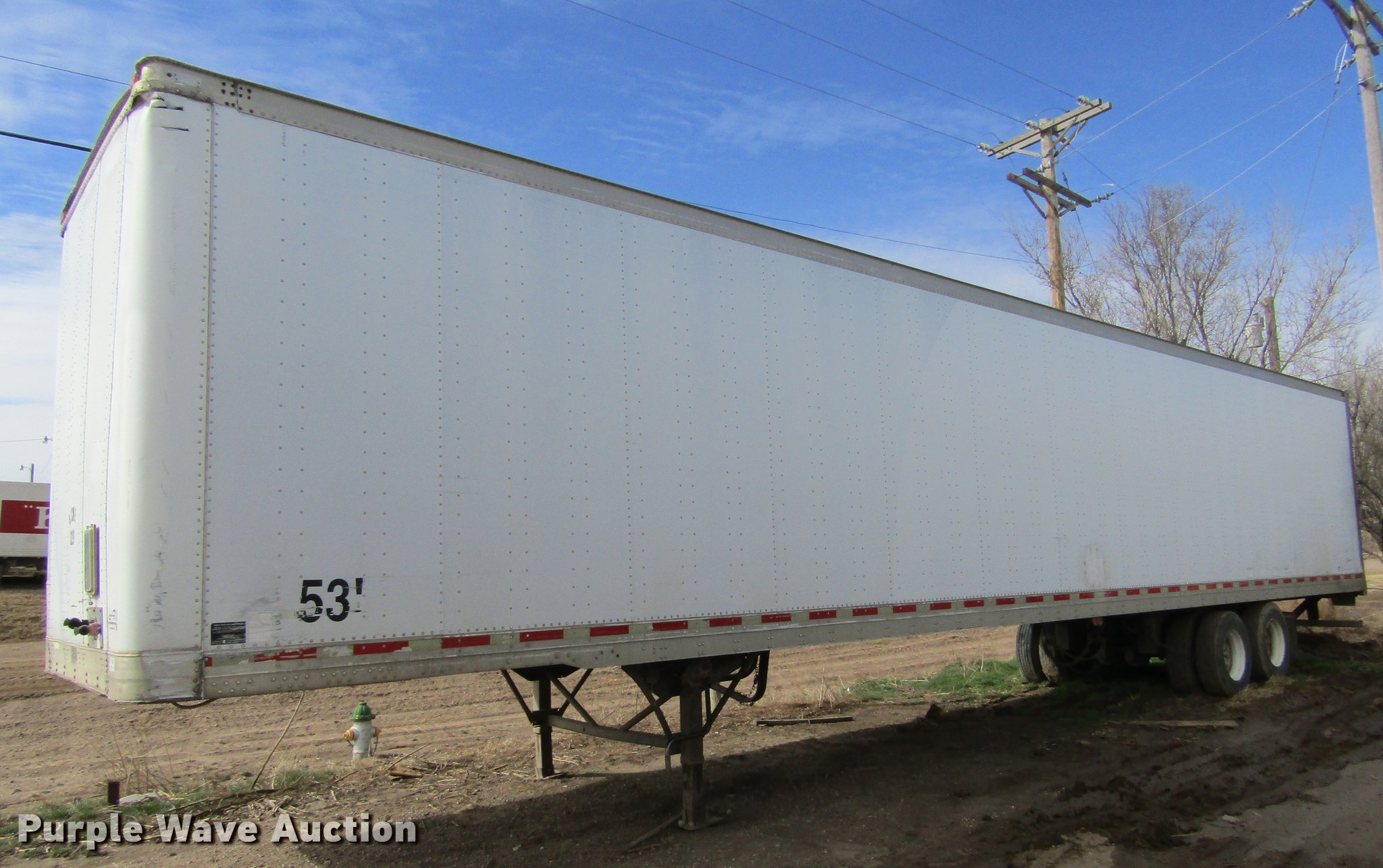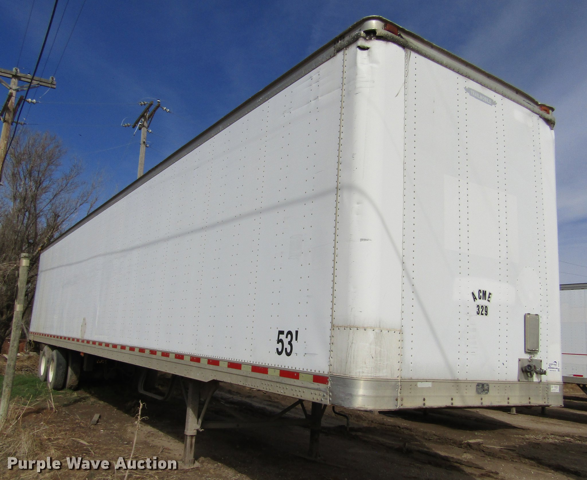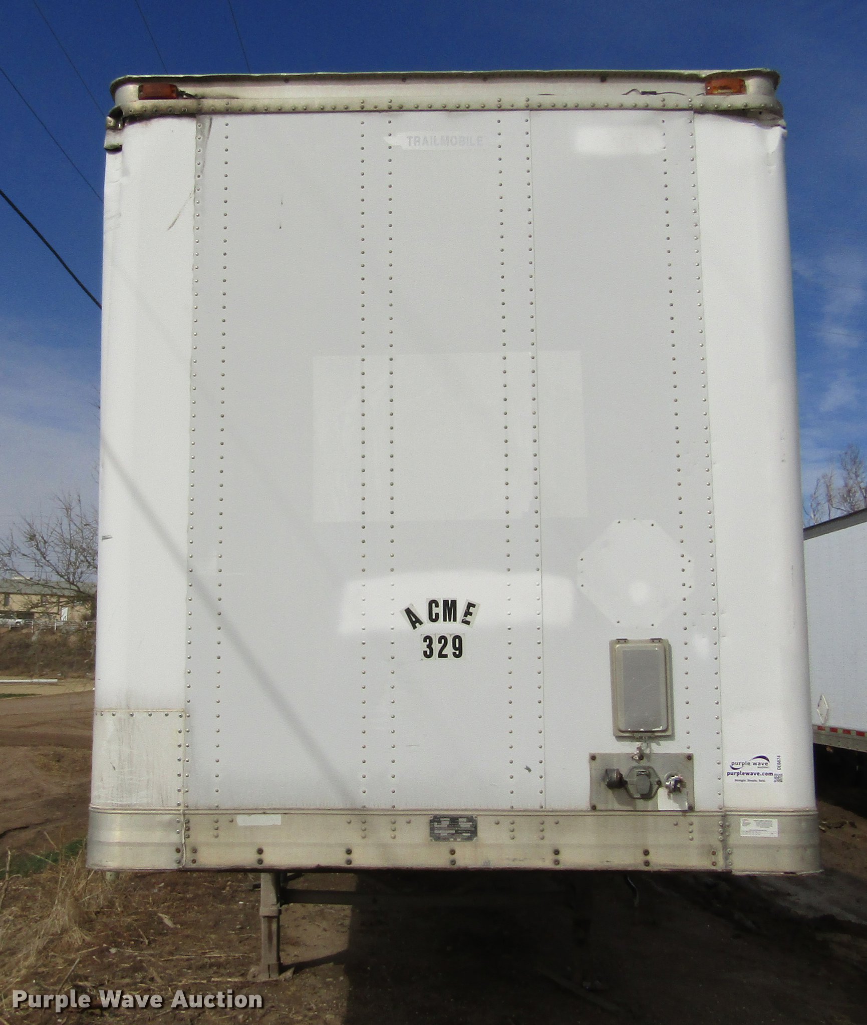 Purple Wave is selling a used Dry Van Trailer in Kansas. This item is a 1999 Trailmobile dry van trailer with the following: 53'L x 102"W, Wood deck, Swing-out rear doors, Dual leg landing gear, Fifth wheel plate, Tandem axle, Air suspension, Air brakes, Steel wheels, 295/75R22.5 tires, GVWR 65,00 lbs, GAWR 20,000 lbs, Unit# 329