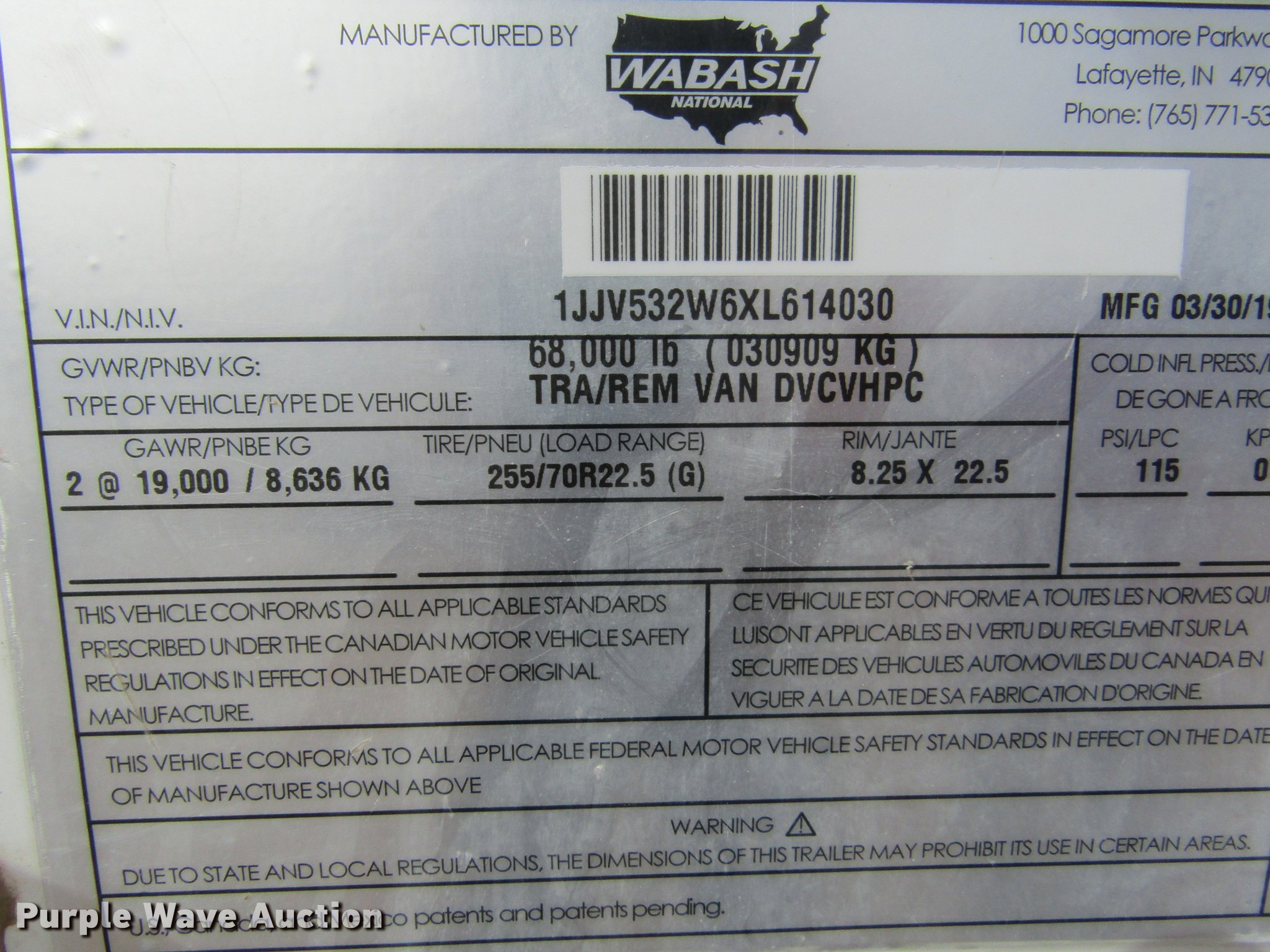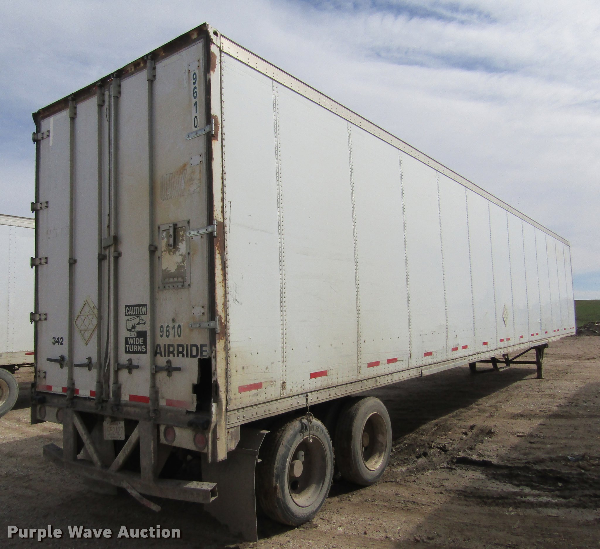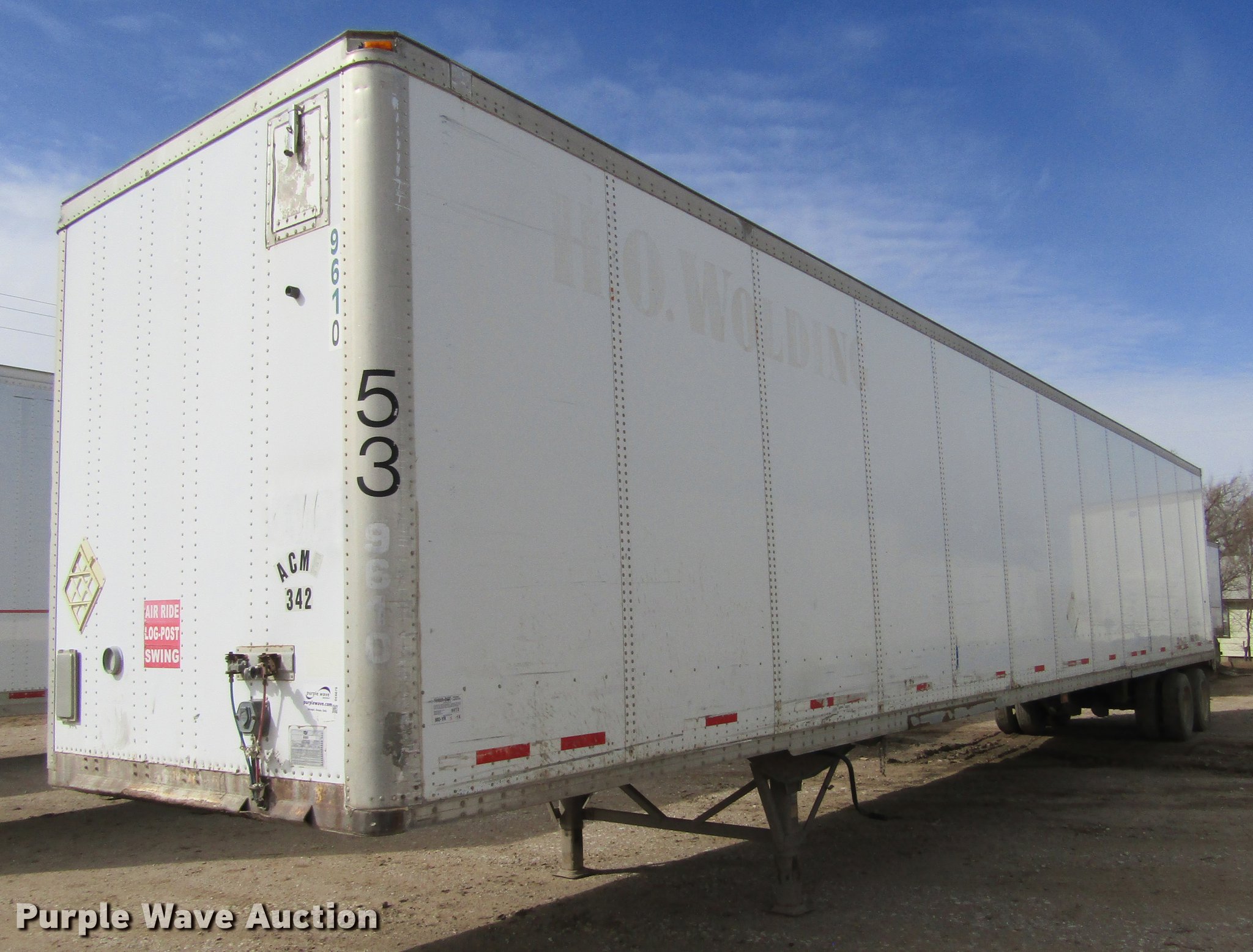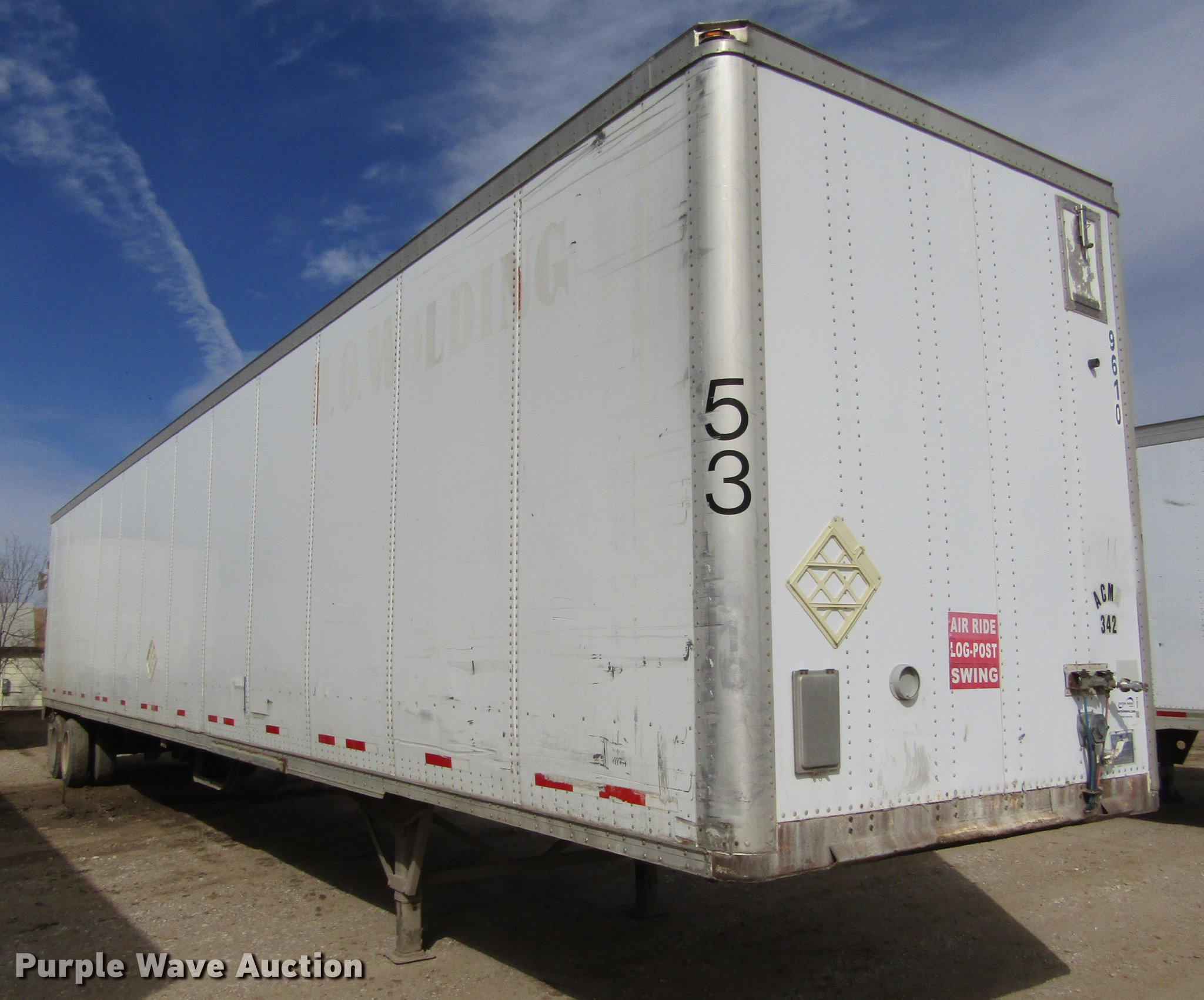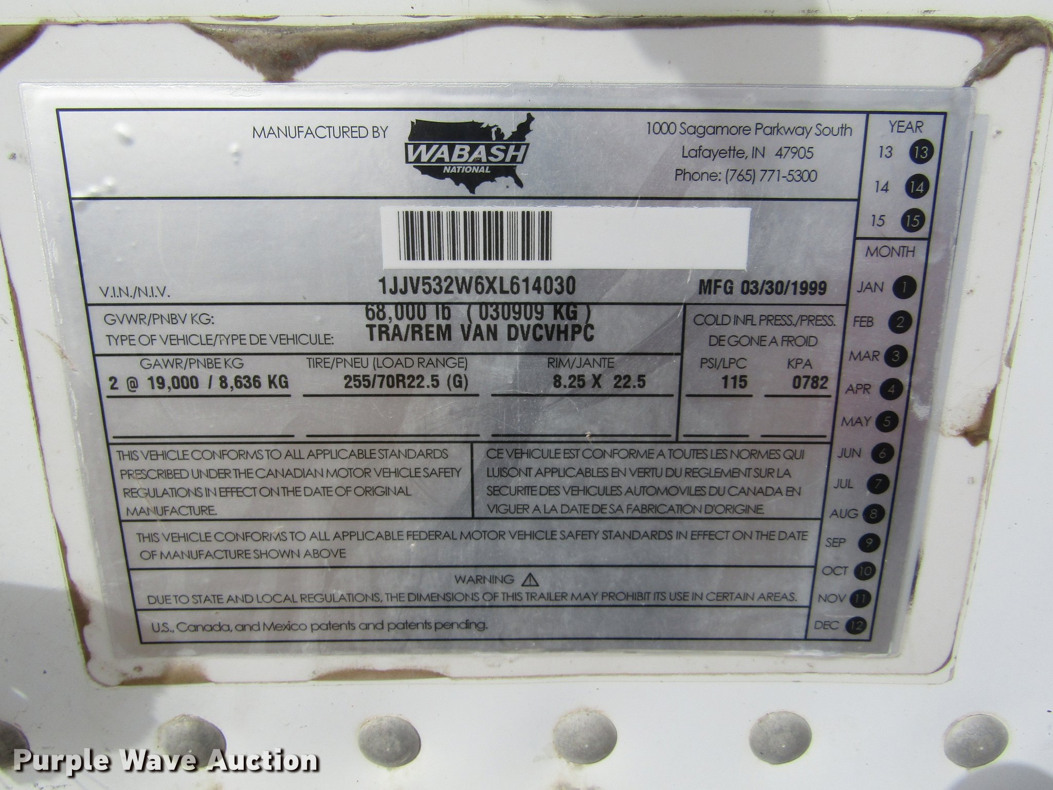 Purple Wave is selling a used Dry Van Trailer in Kansas. This item is a 1999 Wabash dry van trailer with the following: 53'L x 102"W, Wood deck, Swing-out rear doors, Dual leg landing gear, Fifth wheel plate, Tandem axle, Air suspension, Air brakes, Steel wheels, 295/70R22.5 tires, GVWR 68,000 lbs, GAWR 19,000 lbs, Unit# 342