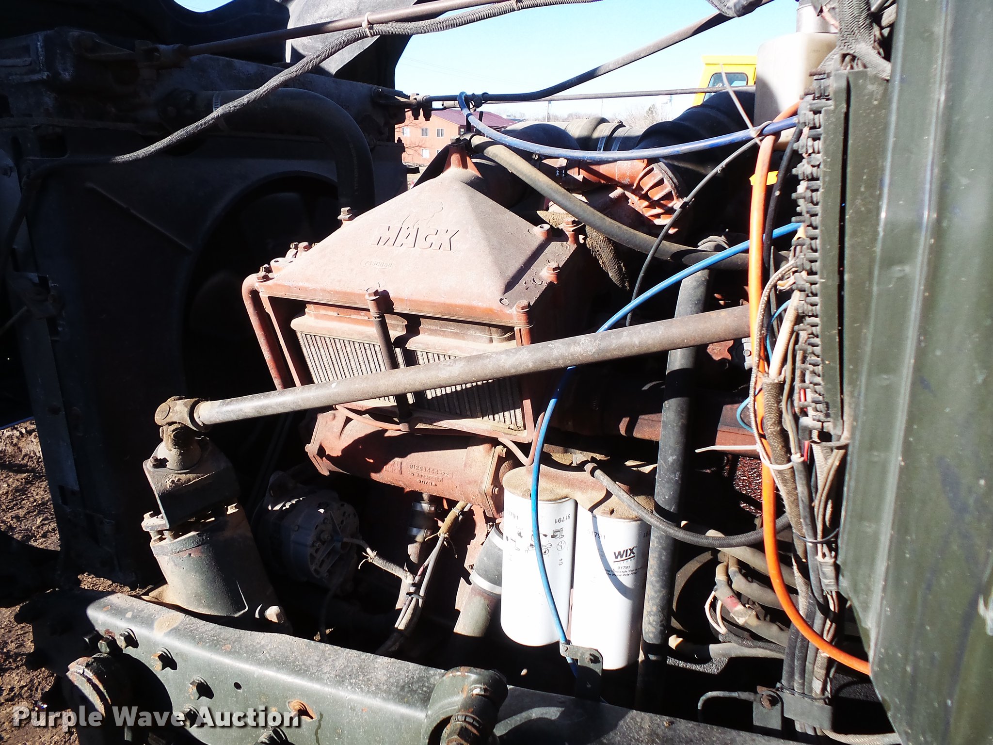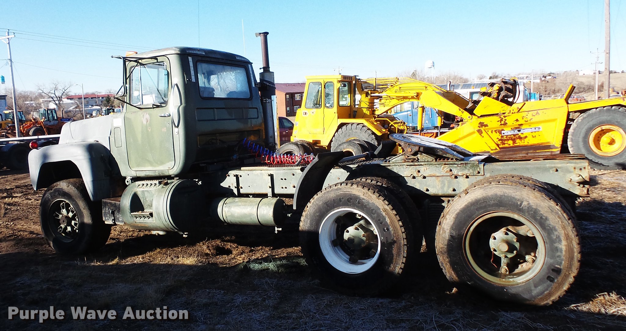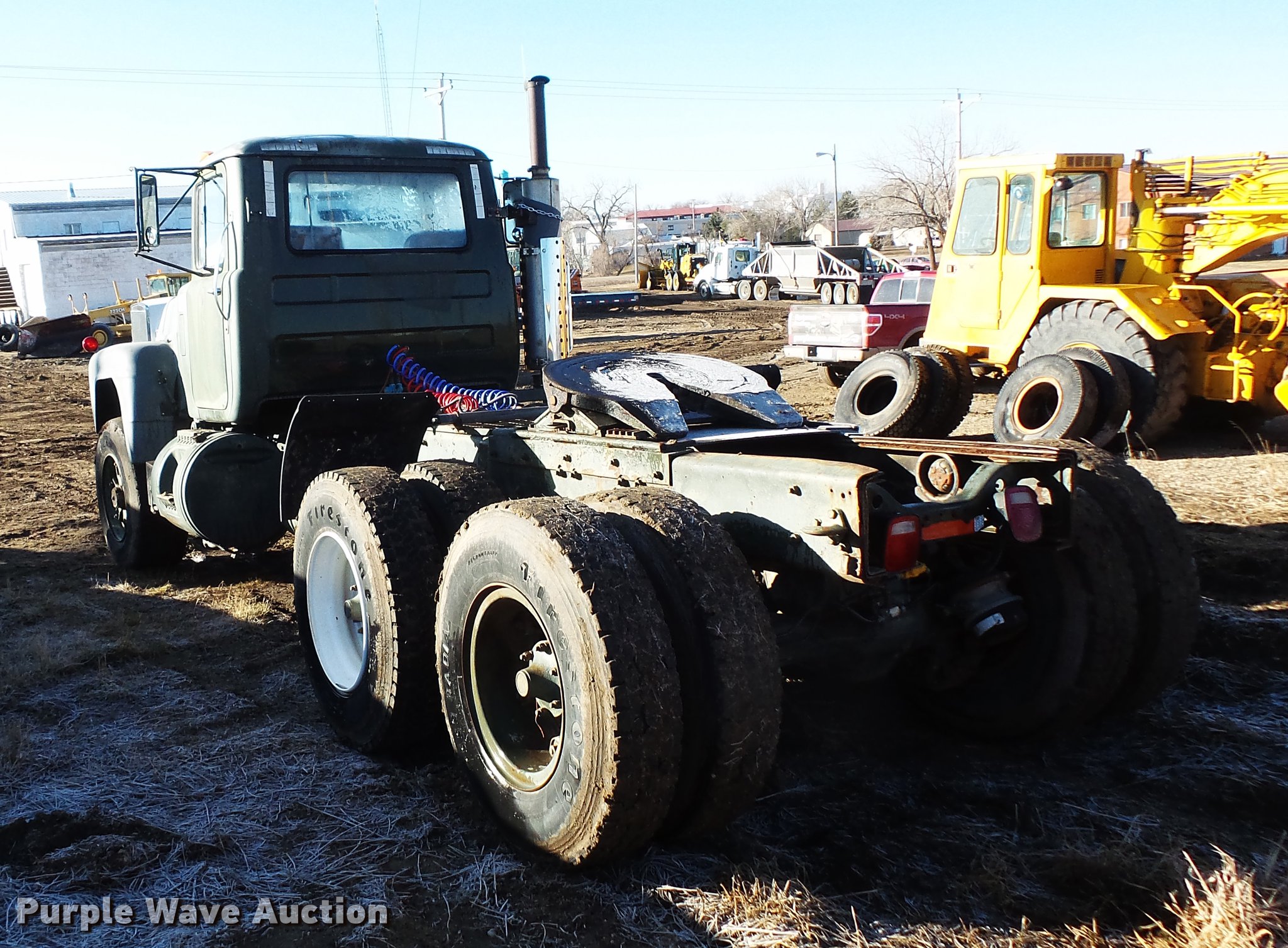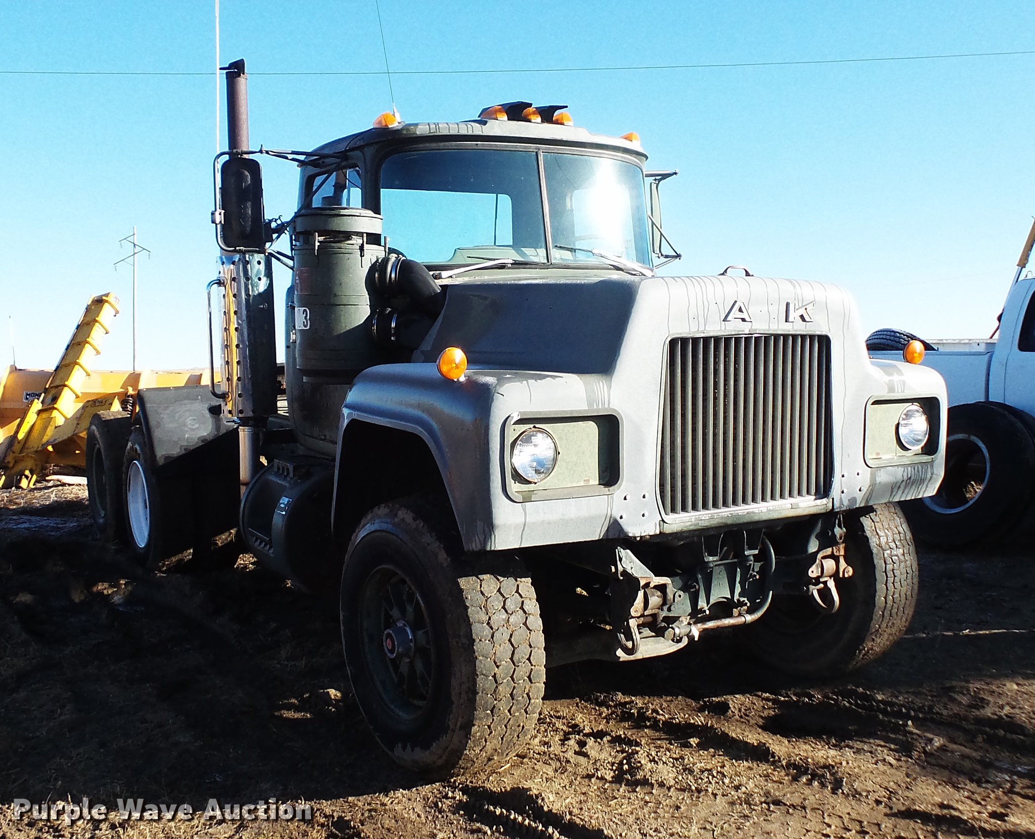 Purple Wave is selling a used Truck Tractor in South Dakota. This item is a 1980 Mack RD688 semi truck with the following: 13,151 miles on odometer, 3,890 hours on meter, Mack E6 six cylinder turbo diesel engine, 350 HP, Automatic transmission, Tandem axle, Air suspension seat, Backup alarm, Beacon light, Single exhaust stack, Steel deck plate, Sliding fifth wheel plate, Dual fuel tanks, Mack rear ends, Camelback suspension, Air brakes, 188" wheelbase, 385/65R22.5 front tires, 11R22.5 rear tires, (4) additional 10.00R20 tires, Additional 385/65R22.5 tire