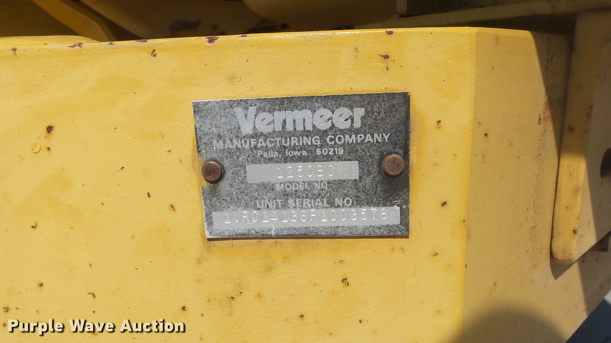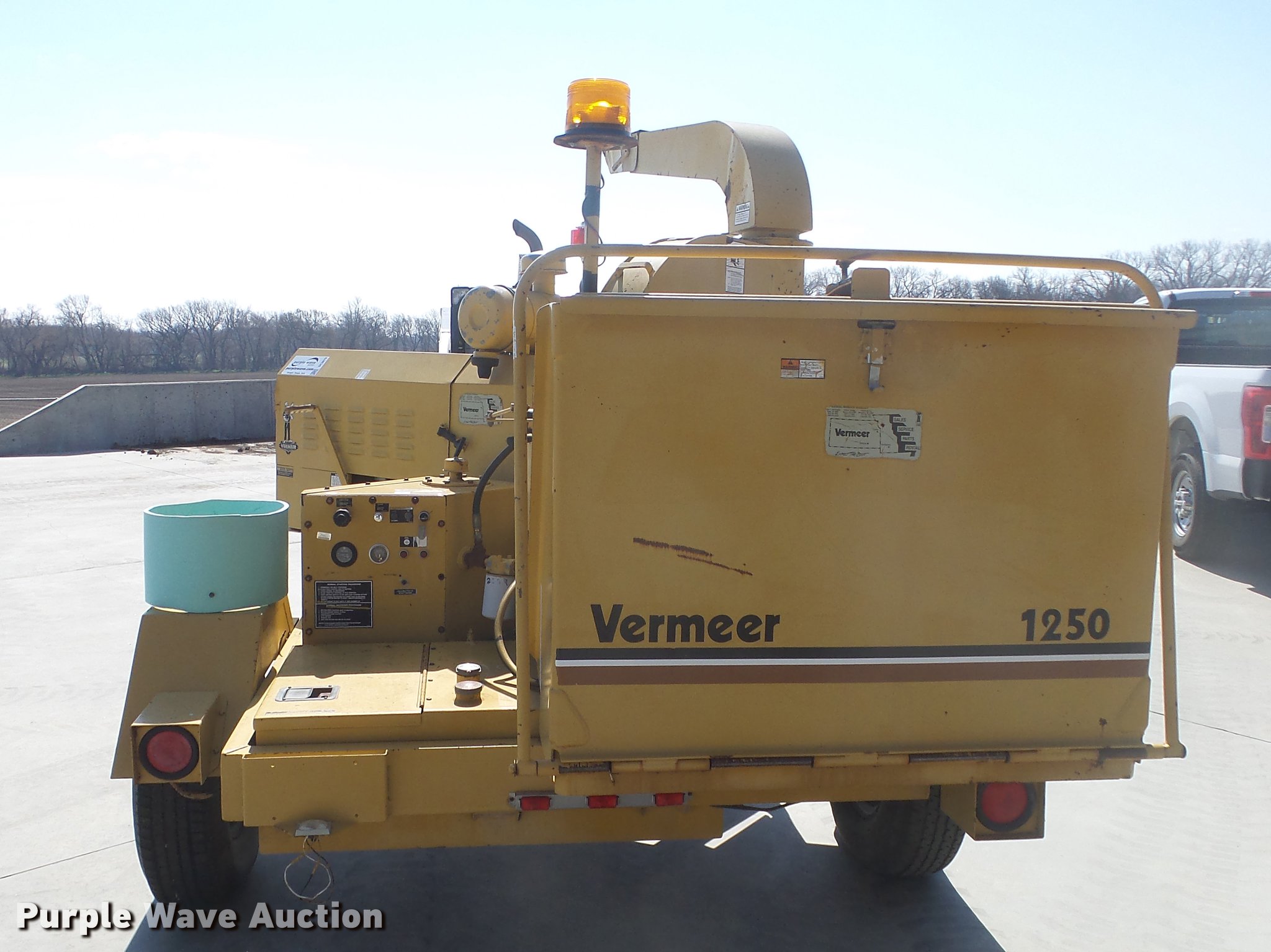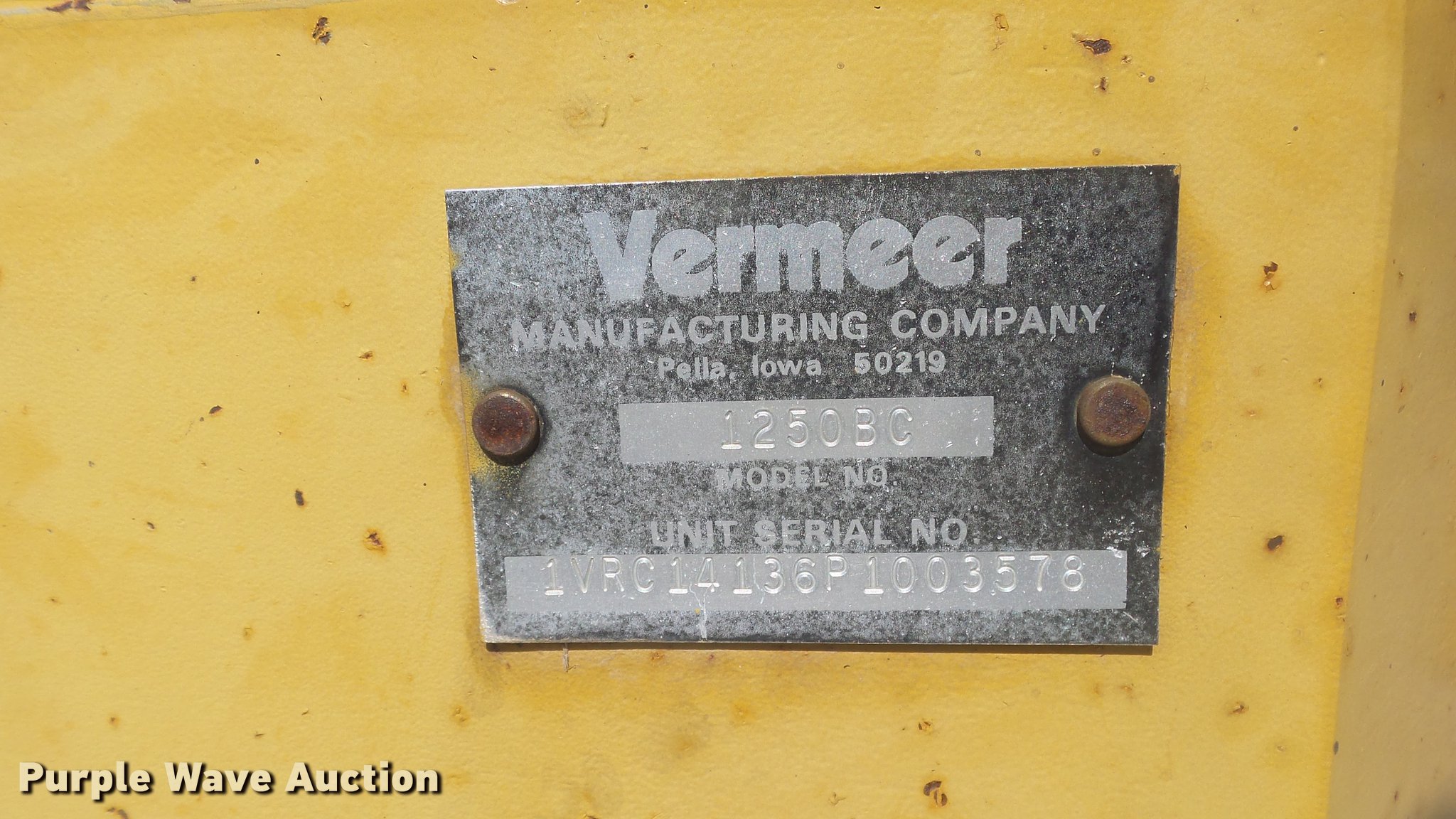1993 Vermeer BC1250 wood chipper. 1,122 hours on meter, Ford six cylinder gas engine, Auto feed system, Ball hitch, 235/85R16 tires. This is worksite support equipment and will not come with a title. Transfer of ownership documentation will be a bill of sale. 1VRC14136P1003578. City of Lindsborg. Lindsborg, KS 67456