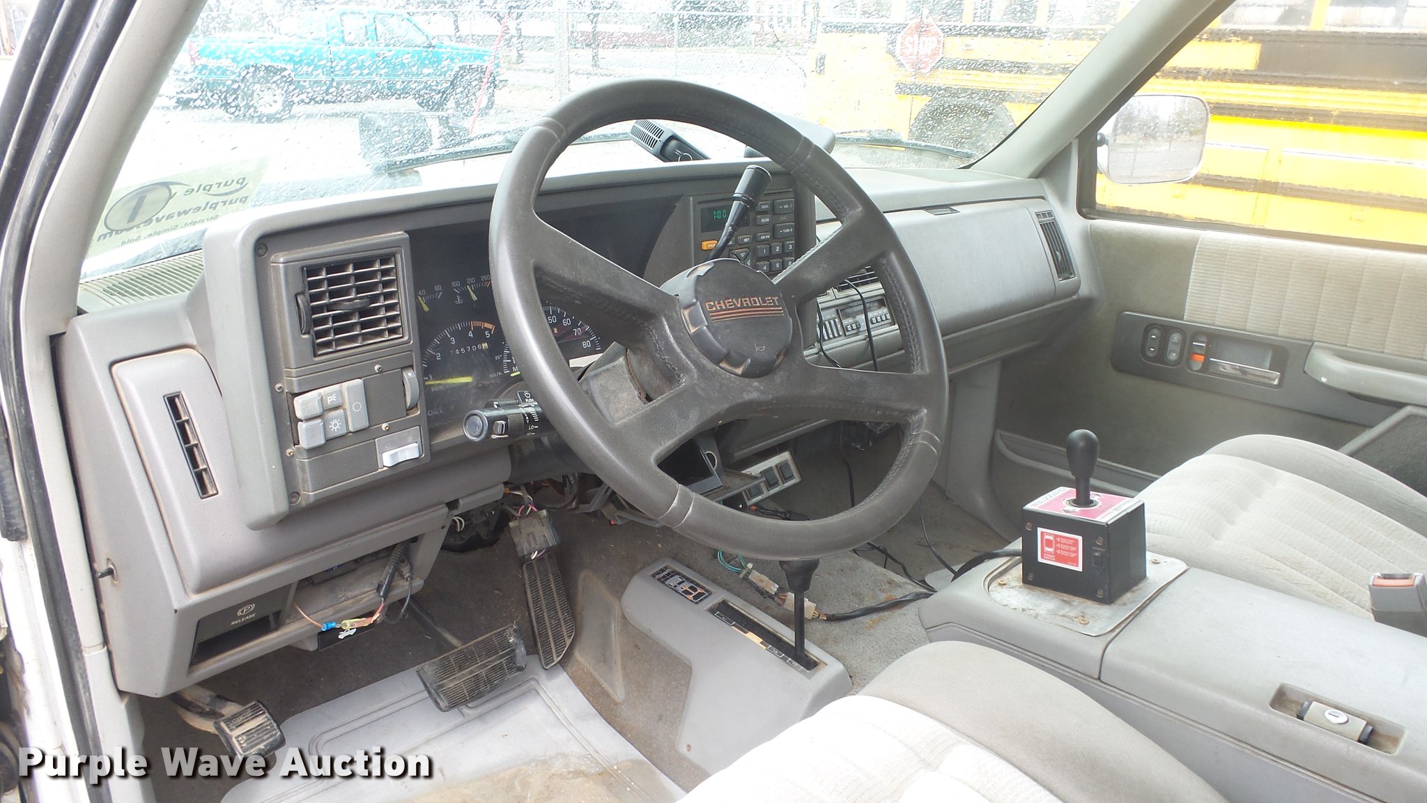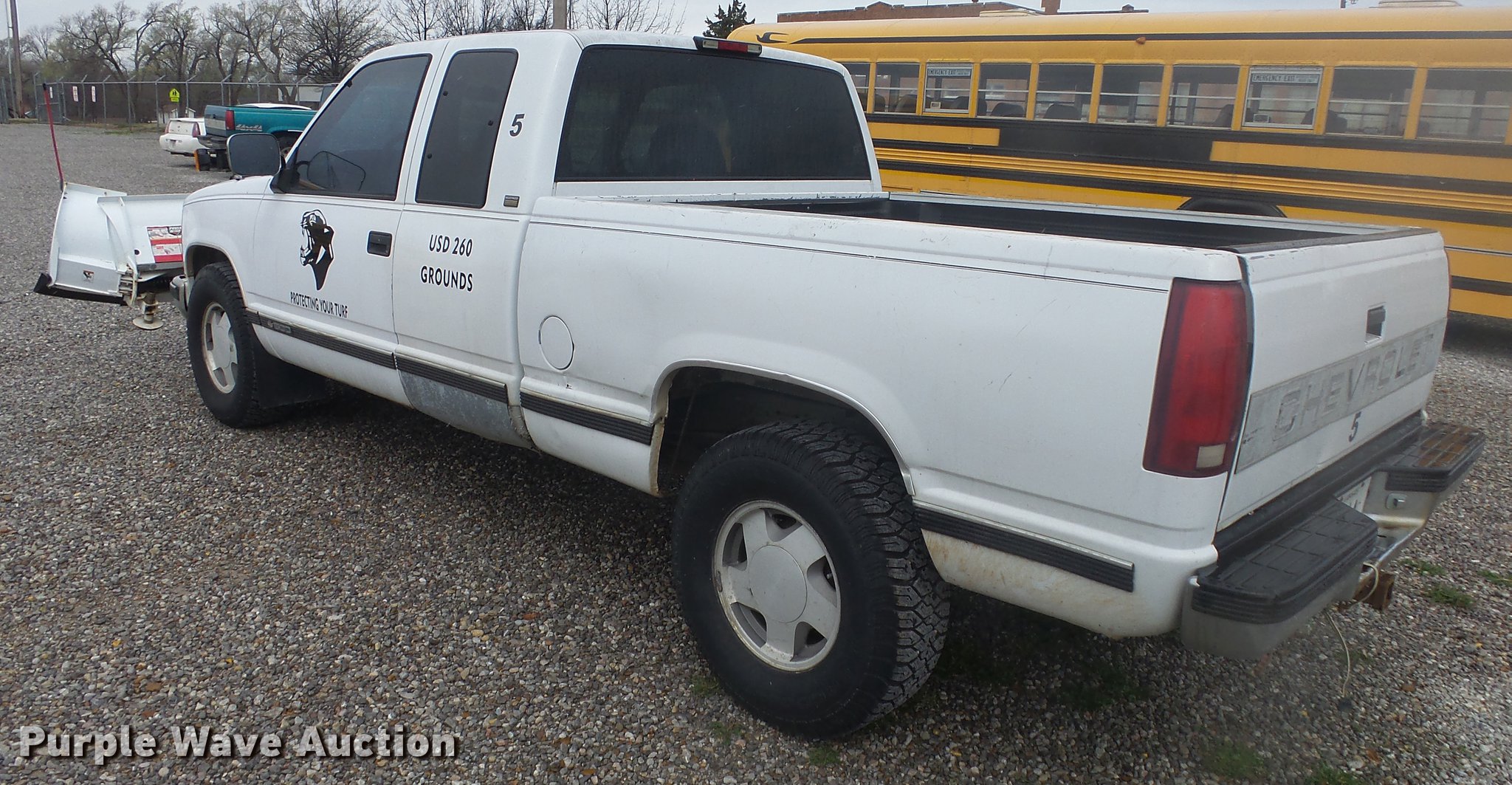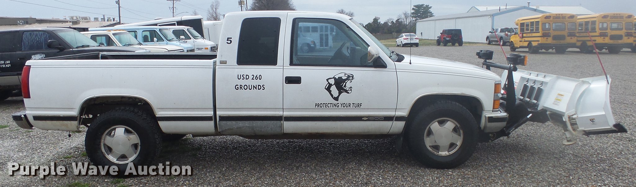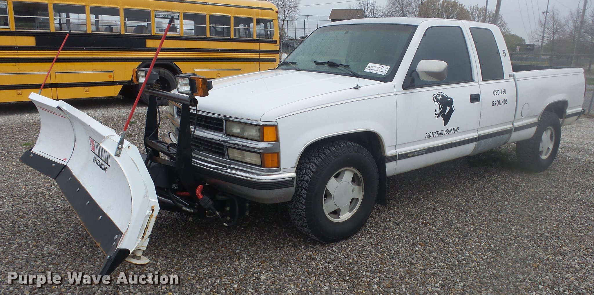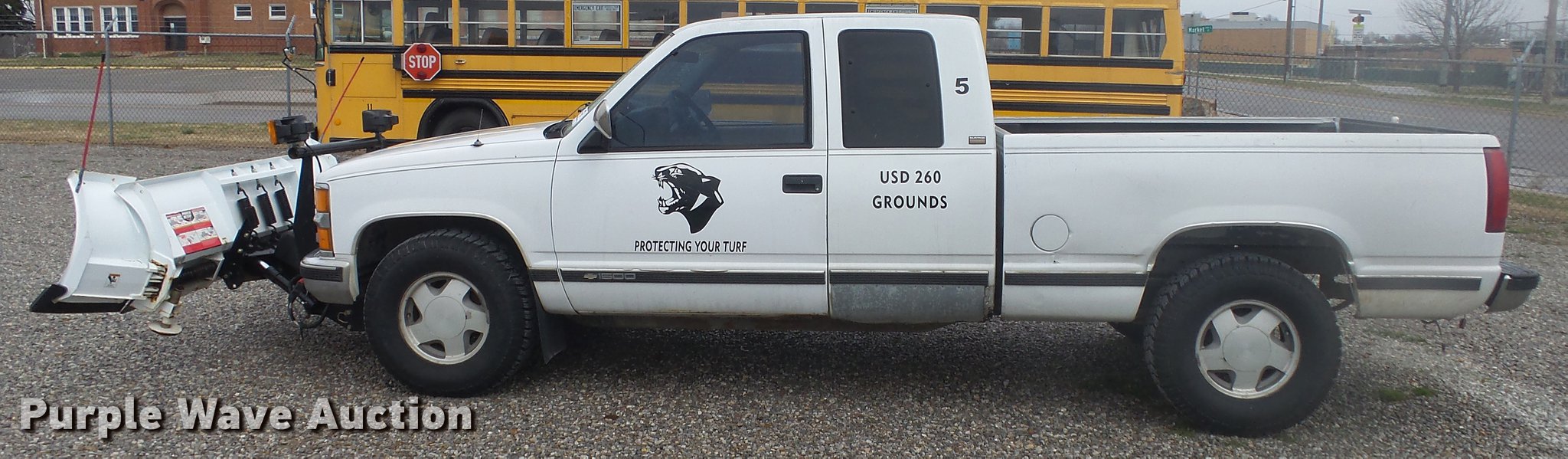 Purple Wave is selling a used 1/2 Ton Pickup or Van in Kansas. This item is a 1994 Chevrolet 1500 Ext. Cab pickup truck with the following: 145,706 miles on odometer, 5.7L V8 OHV 16V gas engine, Automatic transmission, Four wheel drive, AC and heat, AM/FM/cassette, Power windows and locks, Cloth interior, In-cab controls, Front tow hooks, Blizzar snow plow, 7'W, Lights, Receiver hitch, Trailer wiring, 265/75R16 tires, Transmission slips, No exhaust, Non-operational AC and heat, Intermittent snow plow issues, Passenger window inoperable, Blown cylinder head gasket