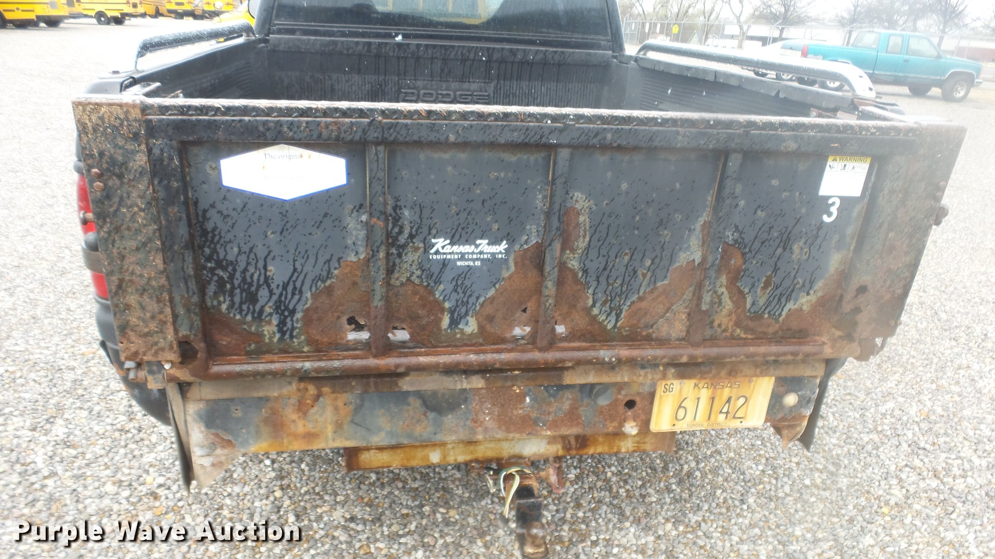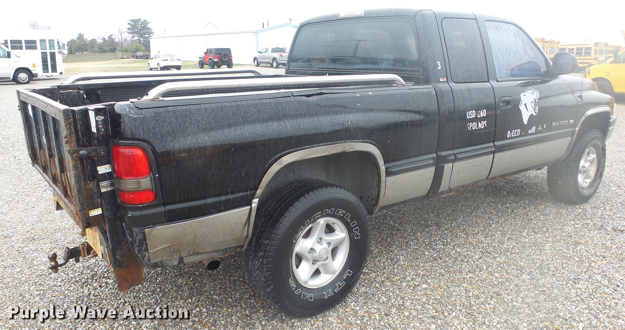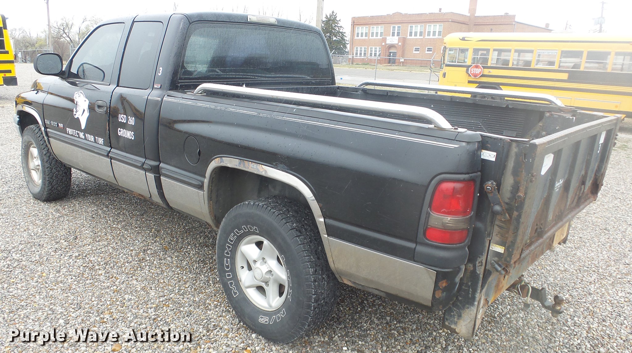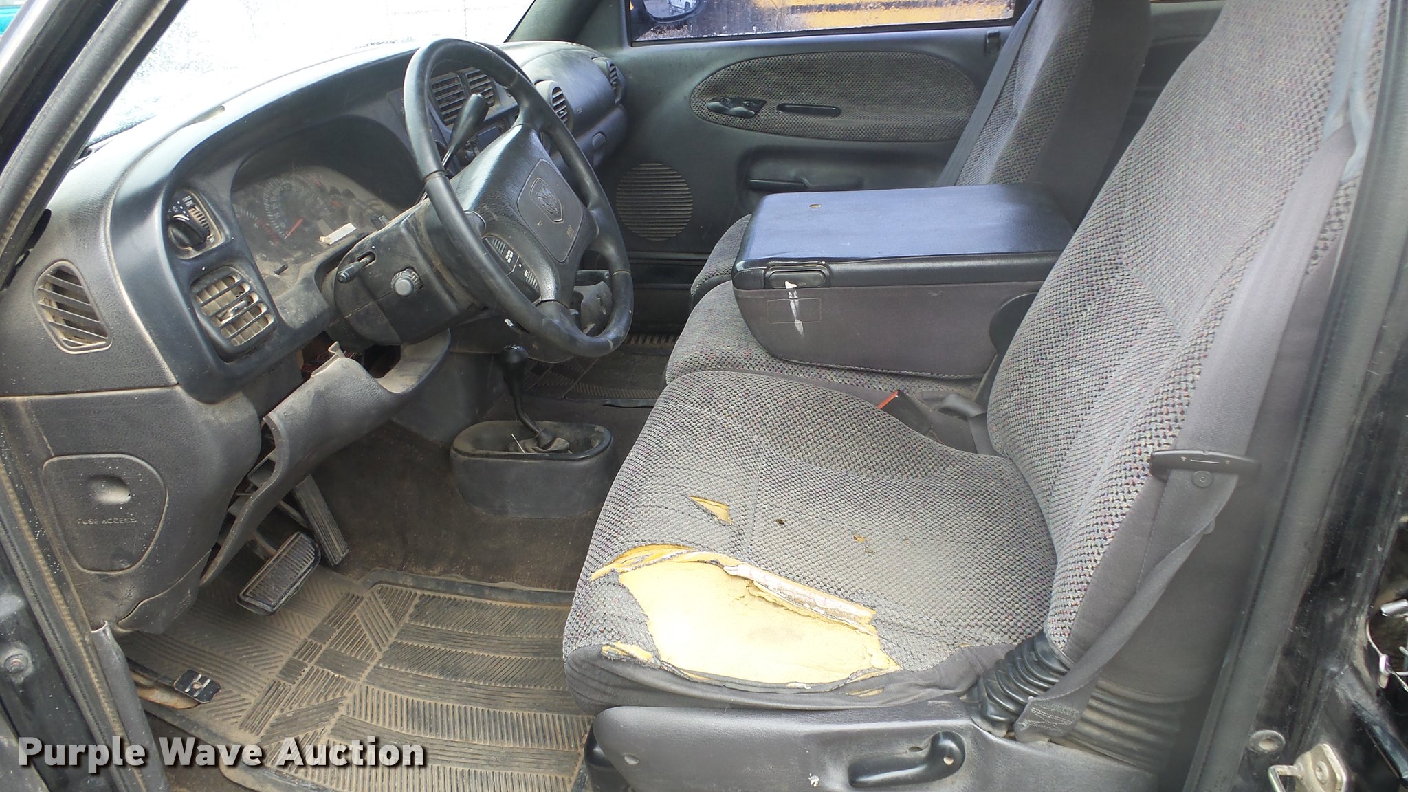 Purple Wave is selling a used 1/2 Ton Pickup or Van in Kansas. This item is a 1999 Dodge Ram 1500 Quad Cab pickup truck with the following: 157,577 miles on odometer, 5.9L V8 OHV 16V gas engine, Automatic transmission, Four wheel drive, AC and heat, Tilt, Cruise, AM/FM/cassette, Power windows and locks, Cloth interior, Tommy Gate end gate lift, Model 60-1040, Receiver hitch, 285/75R16 tires, Non-operational four wheel drive