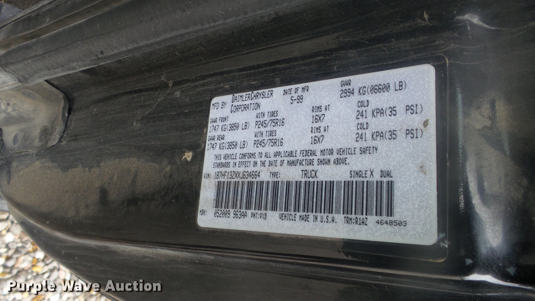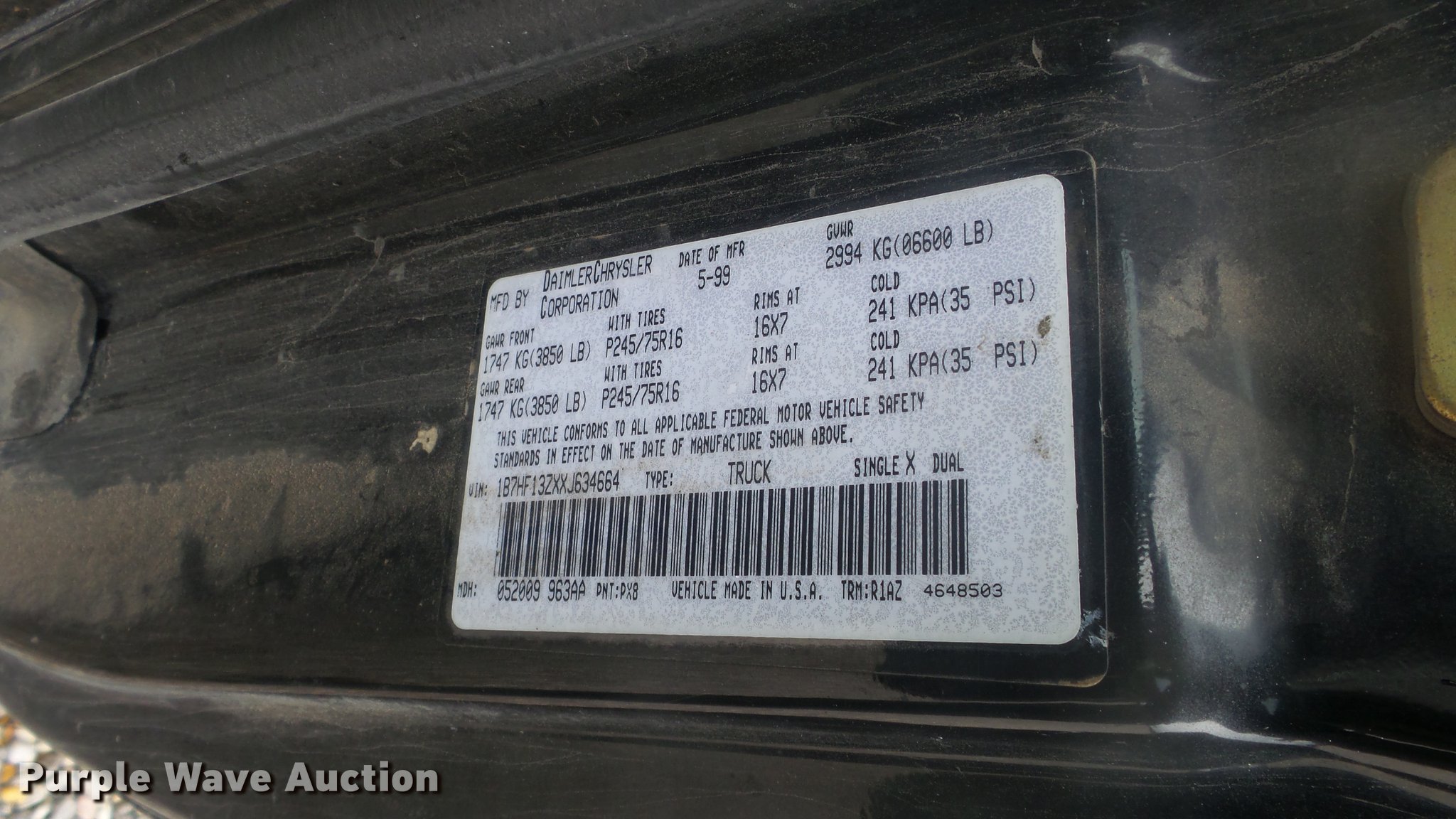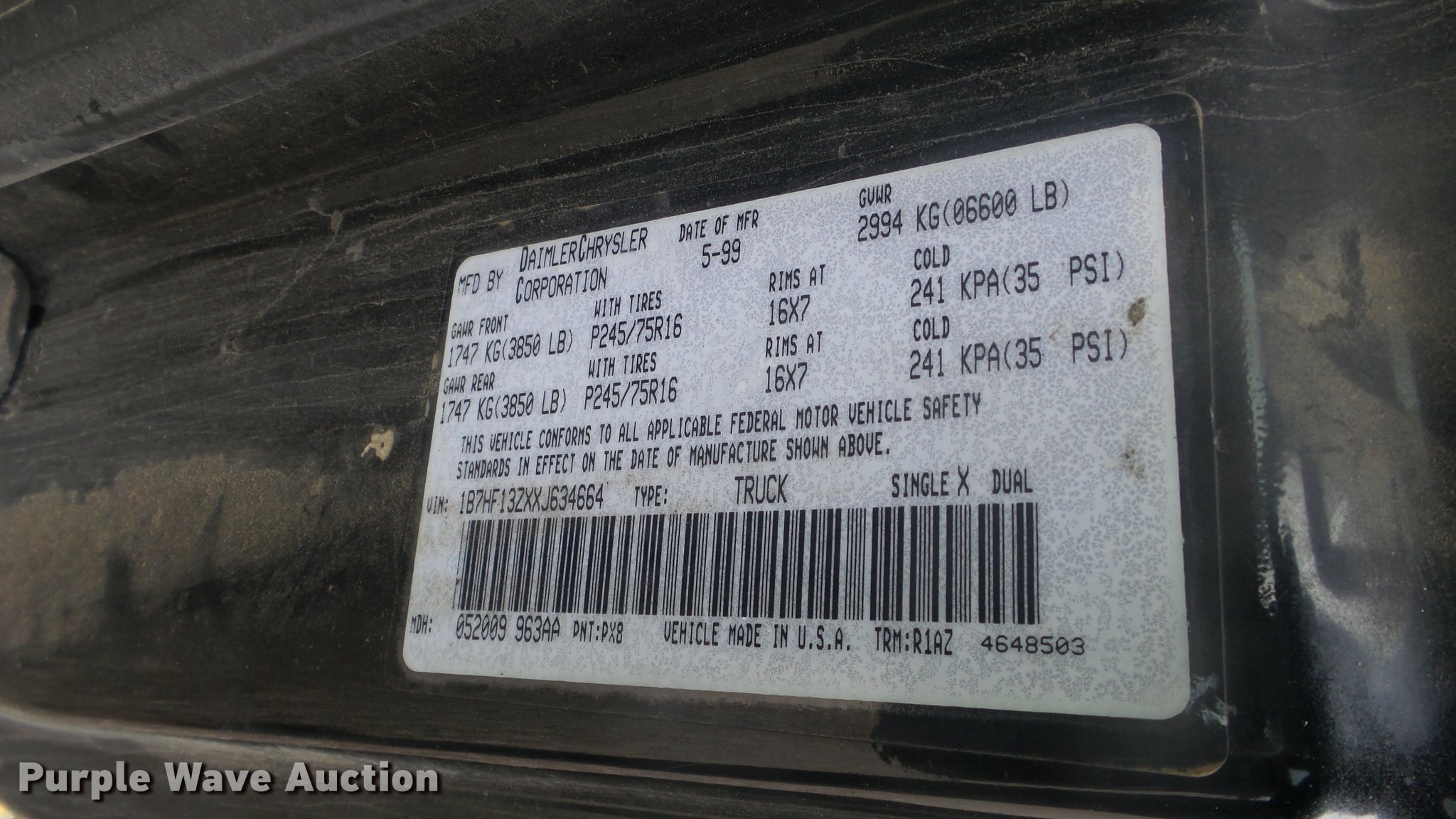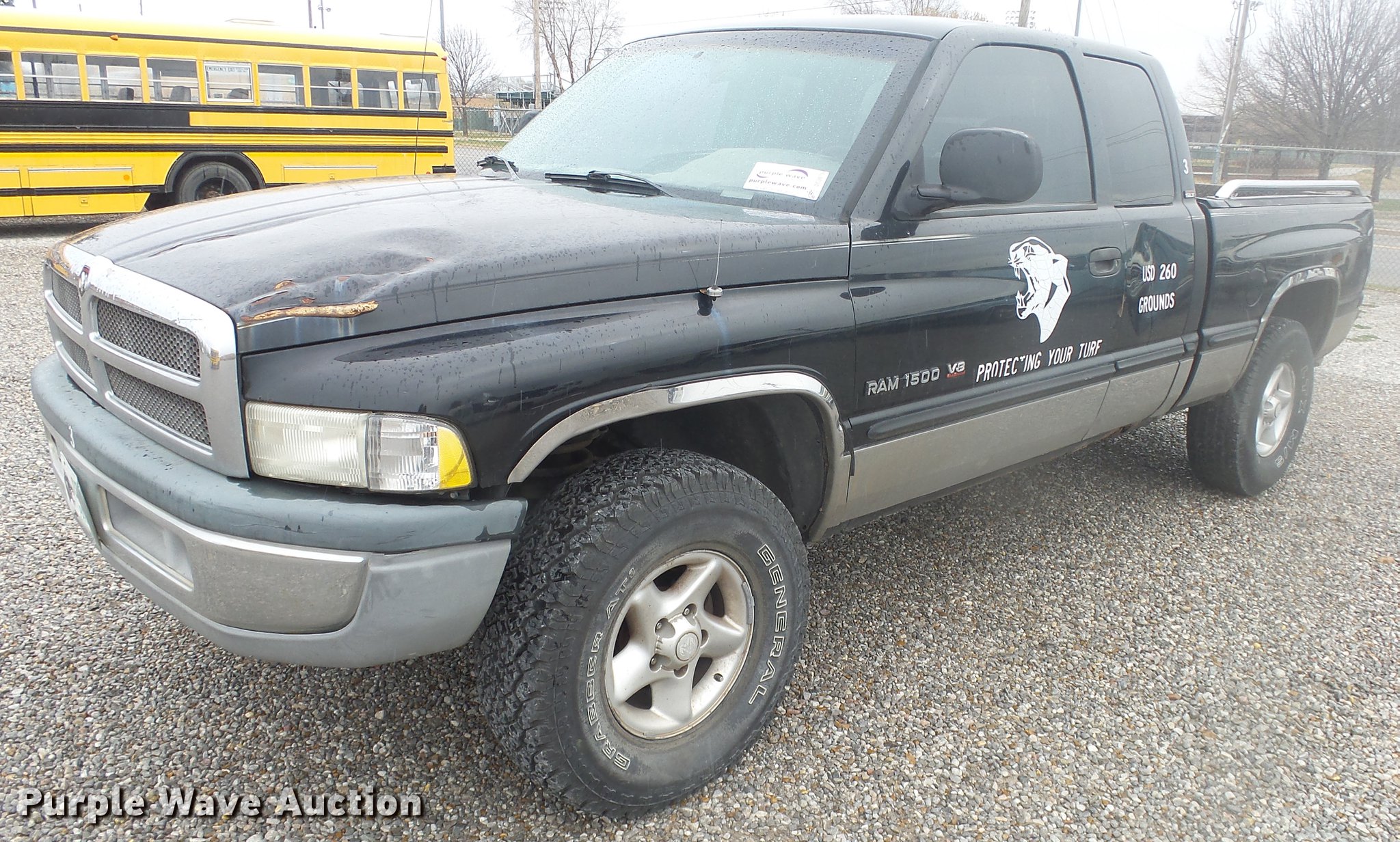 Purple Wave is selling a used 1/2 Ton Pickup or Van in Kansas. This item is a 1999 Dodge Ram 1500 Quad Cab pickup truck with the following: 157,577 miles on odometer, 5.9L V8 OHV 16V gas engine, Automatic transmission, Four wheel drive, AC and heat, Tilt, Cruise, AM/FM/cassette, Power windows and locks, Cloth interior, Tommy Gate end gate lift, Model 60-1040, Receiver hitch, 285/75R16 tires, Non-operational four wheel drive