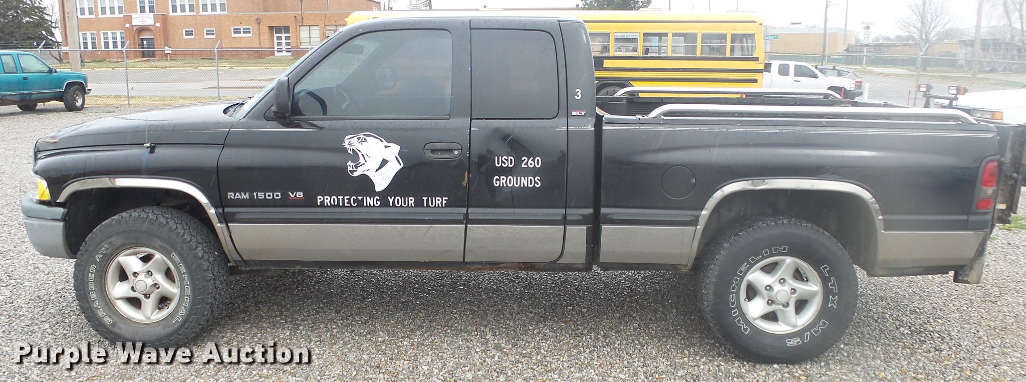 1999 Dodge Ram 1500 Quad Cab pickup truck. 157,577 miles on odometer, 5.9L V8 OHV 16V gas engine, Automatic transmission, Four wheel drive, AC and heat, Tilt, Cruise, AM/FM/cassette, Power windows and locks, Cloth interior, Tommy Gate end gate lift Model 60-1040, Receiver hitch, 285/75R16 tires, Non-operational four wheel drive. Kansas title. 1B7HF13ZXXJ634664. Derby School District. 325 N Woodlawn Blvd. Derby, KS 67037