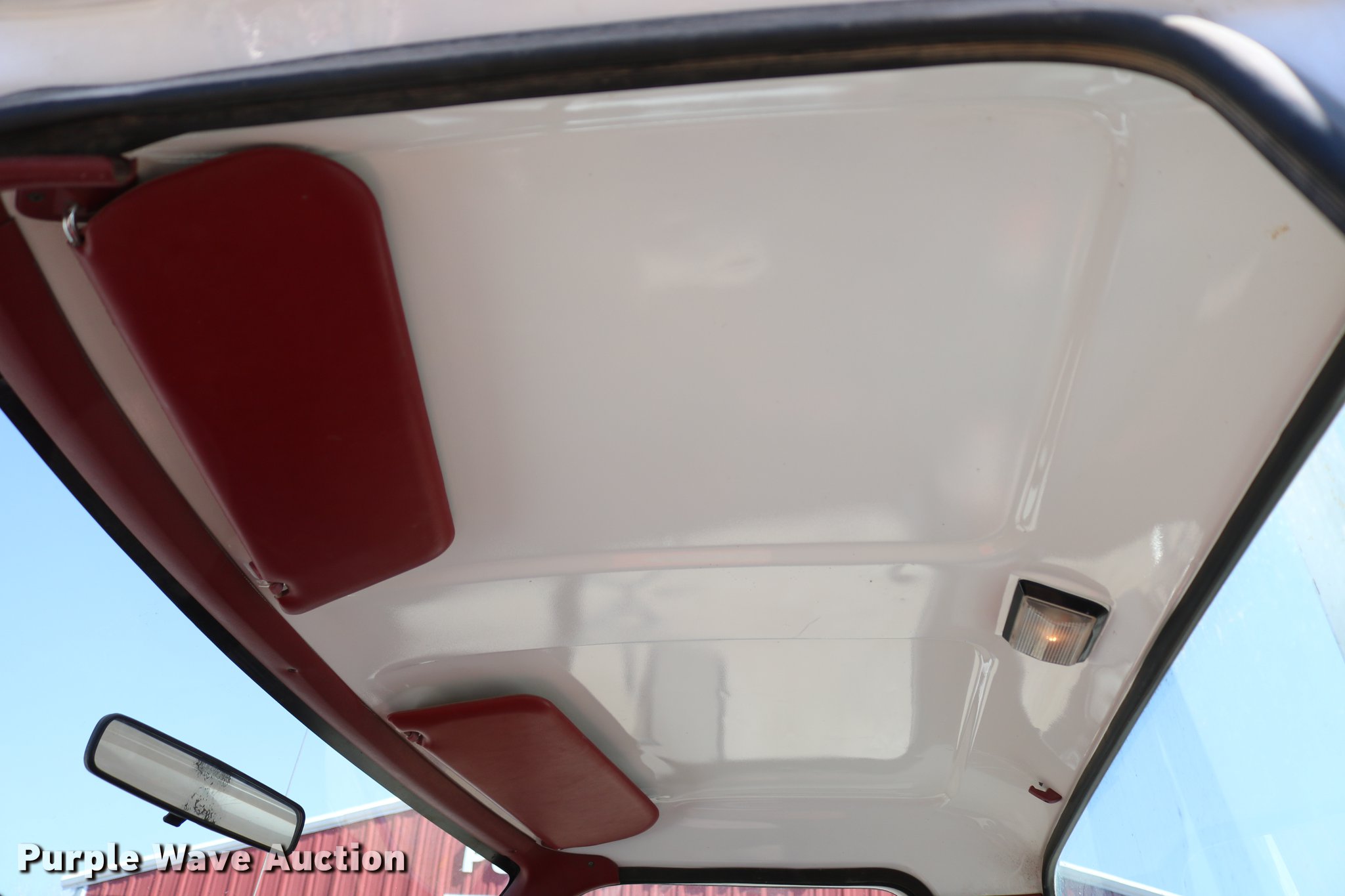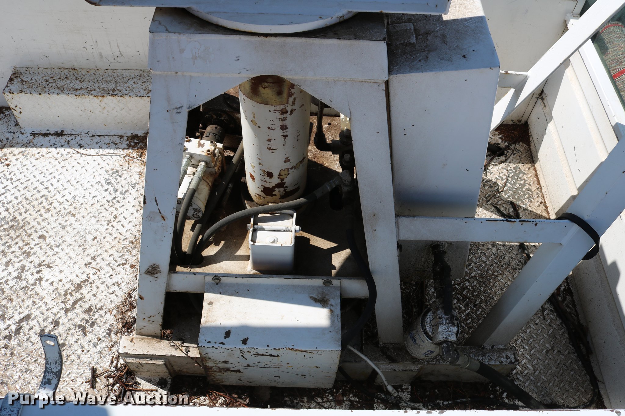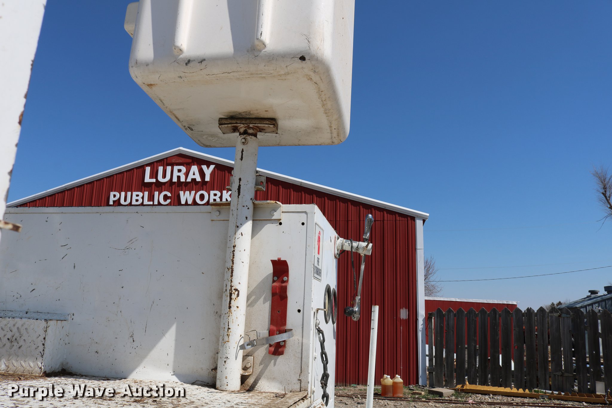 1989 Ford F450 Super Duty bucket truck. 103,504 miles on odometer, 7.5L V8 gas engine, Five speed manual transmission, Single axle, AC and heat, PTO, Stahl service bed 9'L, Shelving, Serial 30-1335, Versalift SHV28PT boom 28' boom length, 300 lbs max lift capacity, Man basket, 33' max lift height, Ground and platform boom controls, Boom rotation, Insulated boom, Serial 48254, Single fuel tank, Spring suspension, Hydraulic brakes, 137" wheelbase, 235/85R16 tires, GVWR 14,500 lbs, Leveling boom sprocket bent, Non-operational AC. Kansas title. 2FDLF47GXKCA76029. City Shop. 505 N Main St. Luray, KS 67649