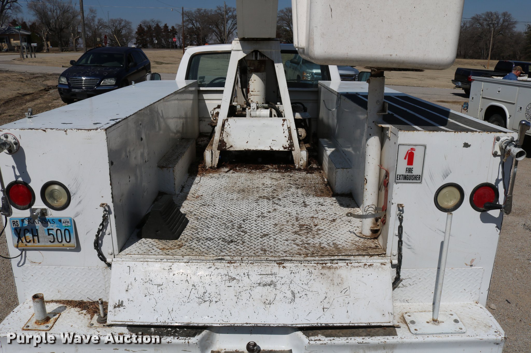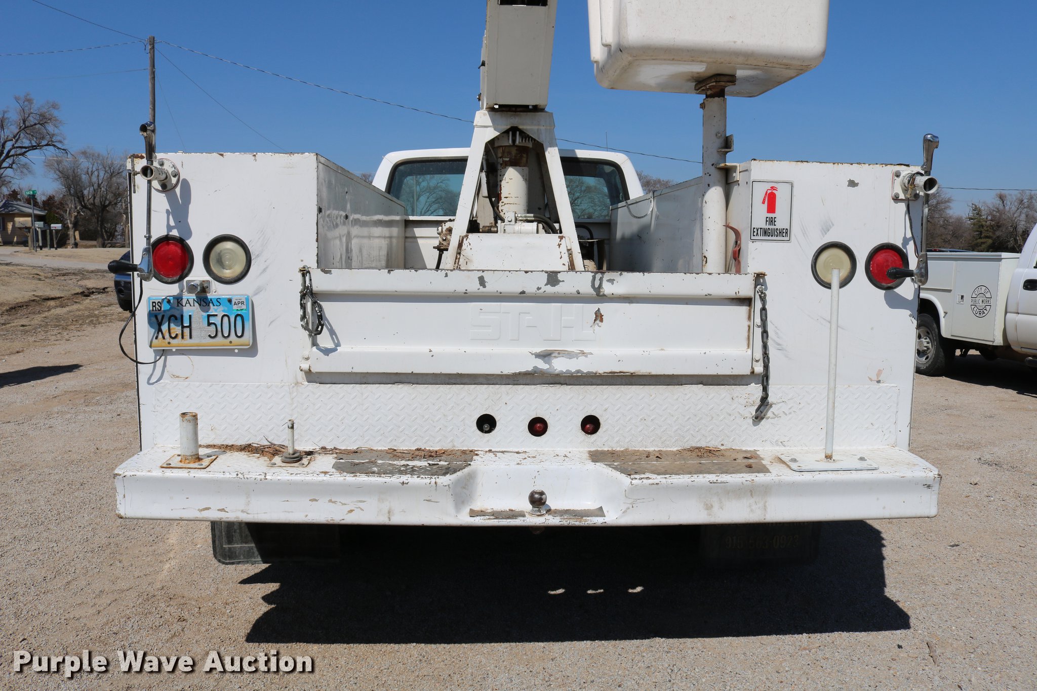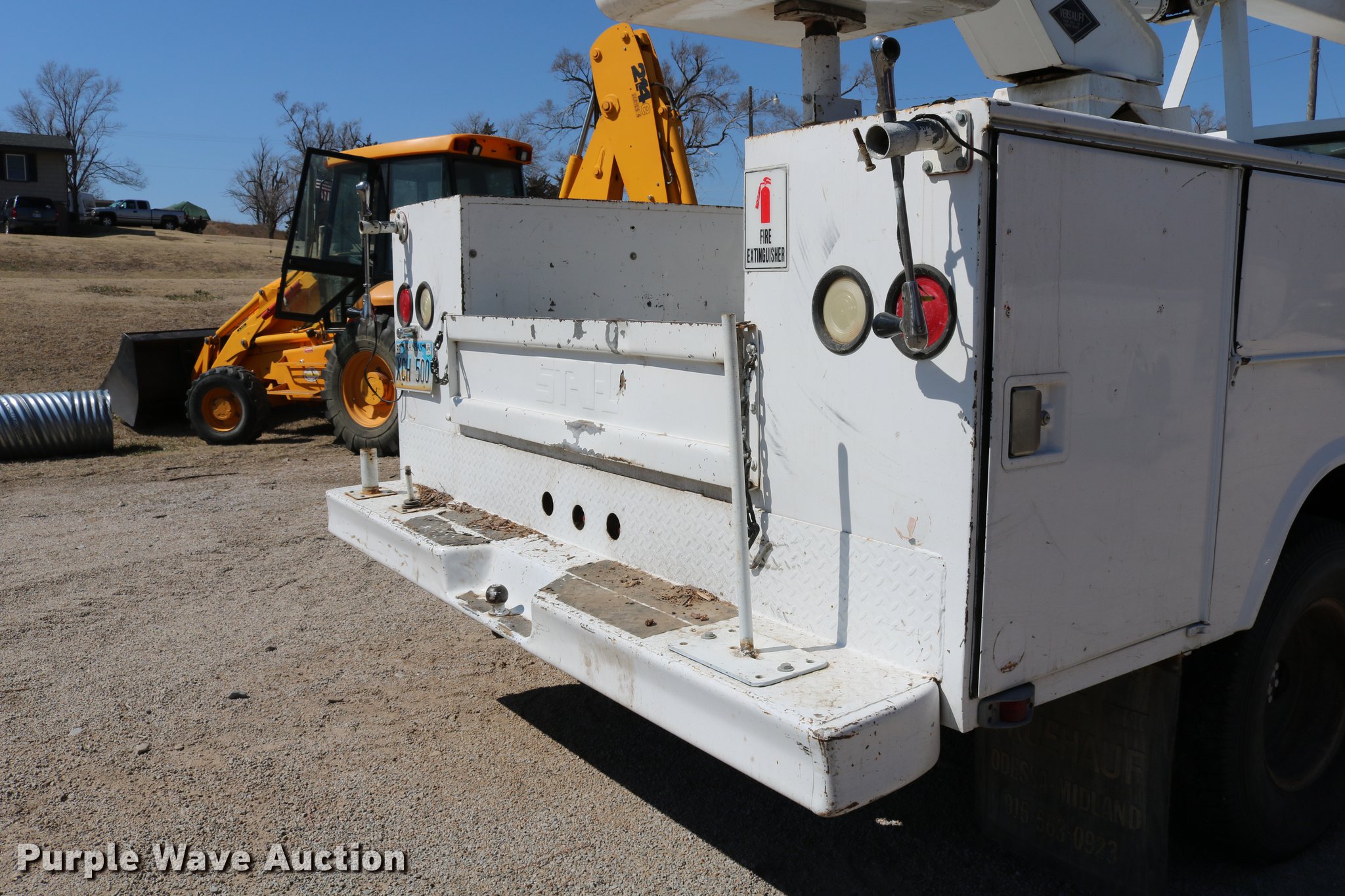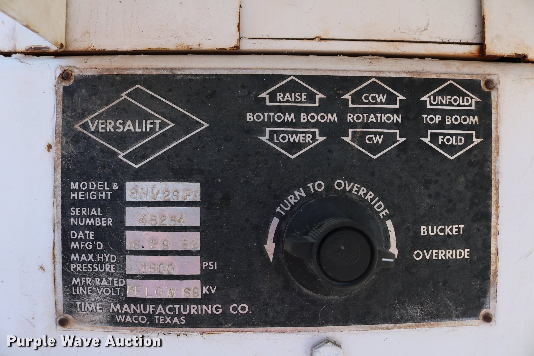 Purple Wave is selling a used Bucket Truck in Kansas. This item is a 1989 Ford F450 Super Duty bucket truck with the following: 103,504 miles on odometer, 7.5L V8 gas engine, Five speed manual transmission, Single axle, AC and heat, PTO, Stahl service bed, 9'L, Shelving, Serial 30-1335, Versalift SHV28PT boom, 28' boom length, 300 lbs max lift capacity, Man basket, 33' max lift height, Ground and platform boom controls, Boom rotation, Insulated boom, Serial 48254, Single fuel tank, Spring suspension, Hydraulic brakes, 137" wheelbase, 235/85R16 tires, GVWR 14,500 lbs, Leveling boom sprocket bent, Non-operational AC