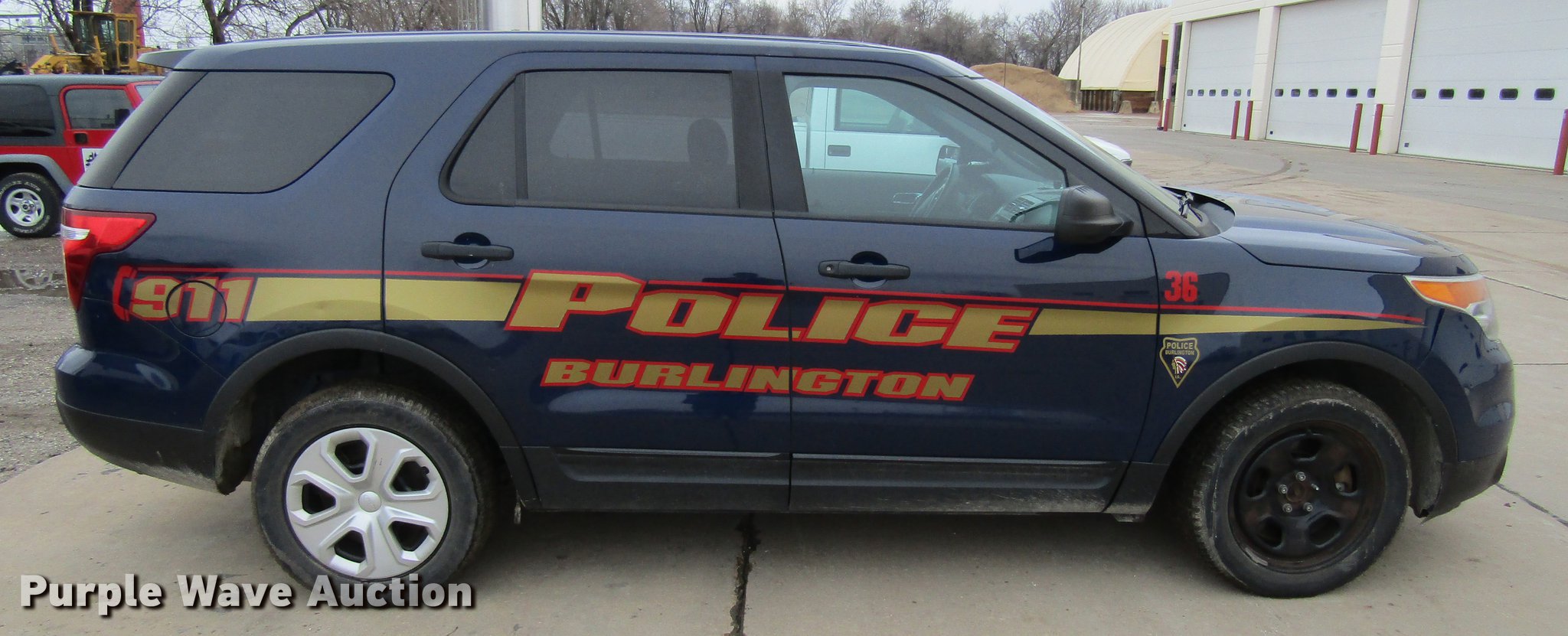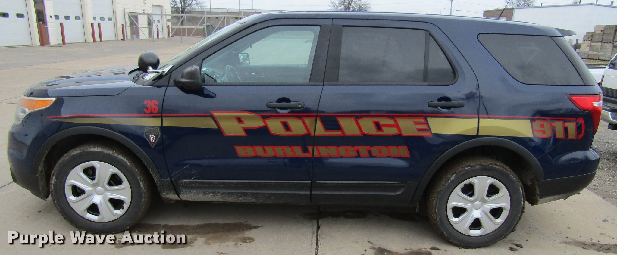 2013 Ford Explorer Police Interceptor SUV. 143,994 miles on odometer, 3.7L V6 DOHC 24V gas engine, Automatic transmission, AC and heat, Tilt, Cruise, AM/FM/CD, Power windows, locks, mirrors, and seat, Cloth interior, Spotlight, Rear tow hook, 245/55R18 tires, Passenger seat headrest missing, Center console missing. Iowa title. 1FM5K8AR1DGC40727. City of Burlington. 3510 Division St. Burlington, IA 52601