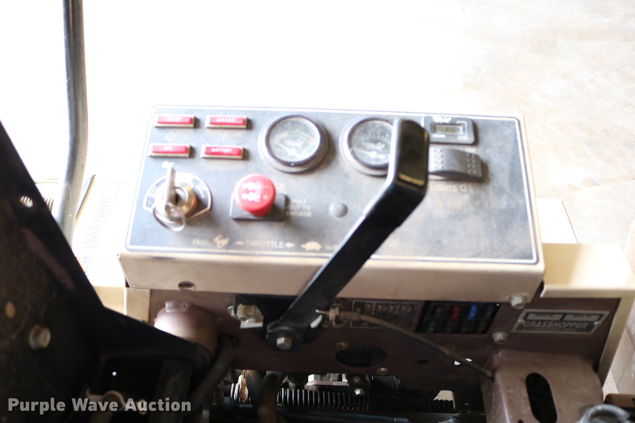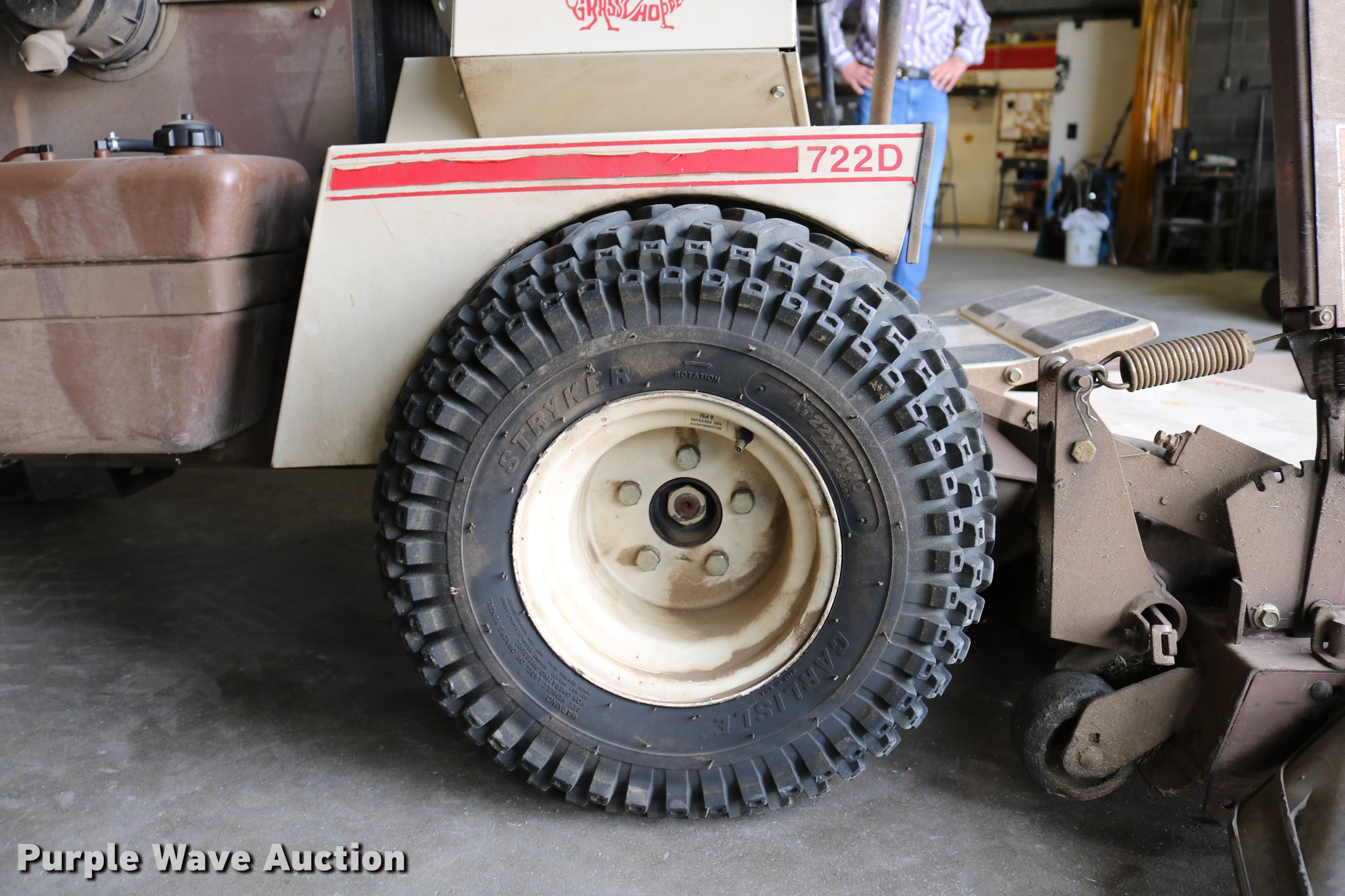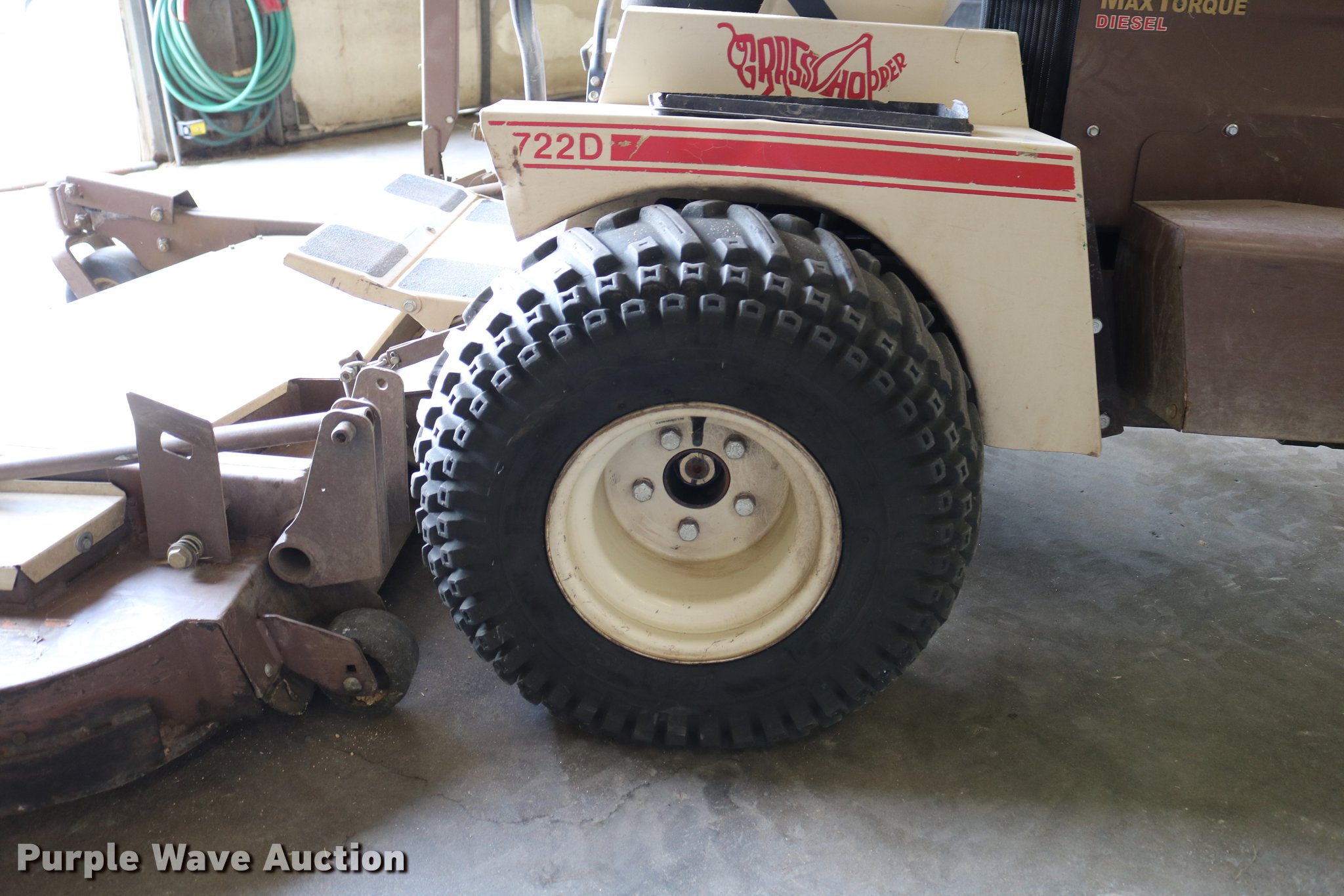 Purple Wave is selling a used Commercial Turf Mower in Kansas. This item is a Grasshopper 722D2 ZTR lawn mower with the following: 2,373 hours on meter, 61" cut, Kubota D902 three cylinder diesel engine, 5D2479, Hydrostatic transmission, Electric start, Electric over hydraulic deck lift, 13x6.50-6 front tires, 22x11-10 rear tires, Work lights inoperable, Serial 5520302
