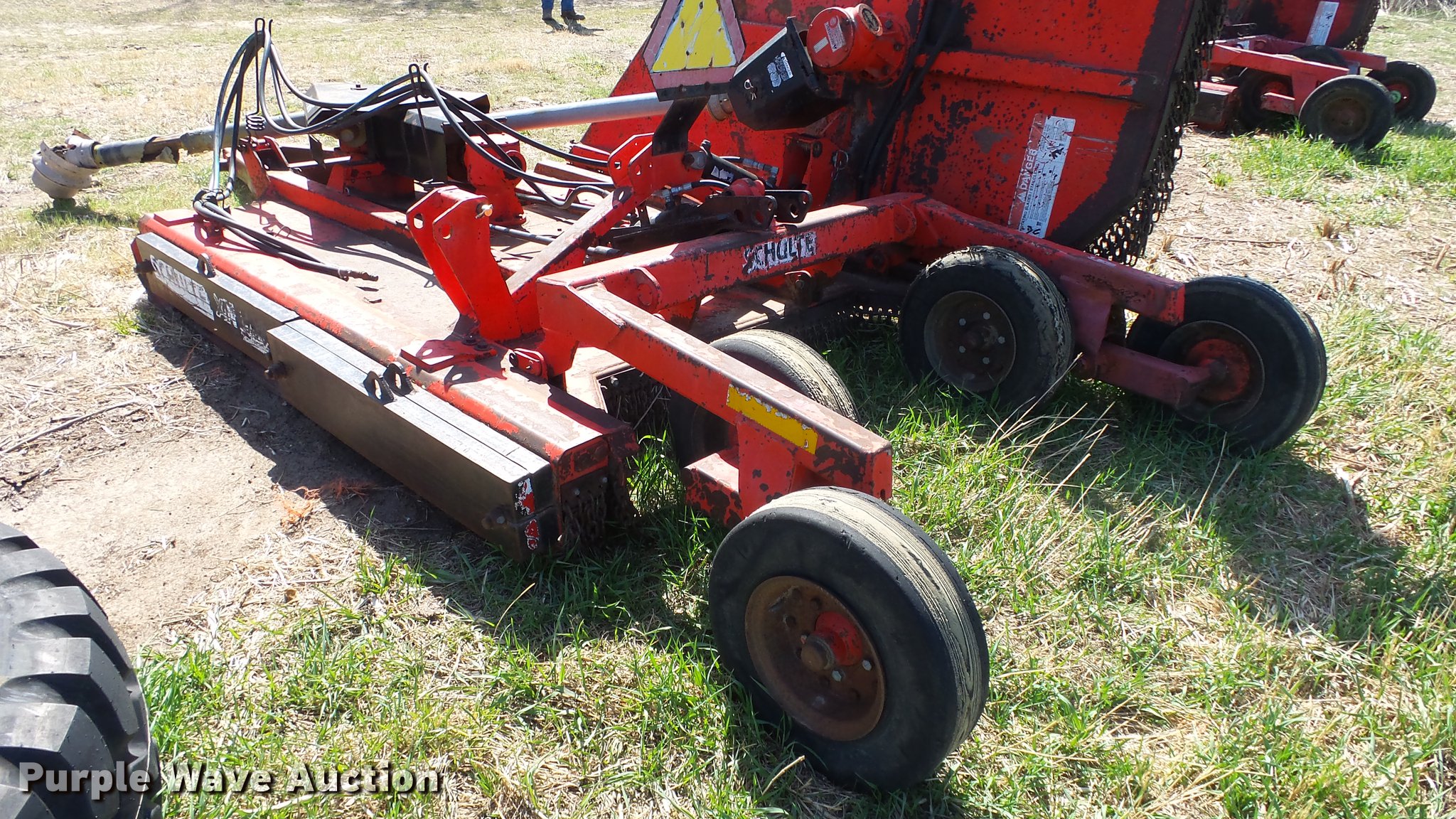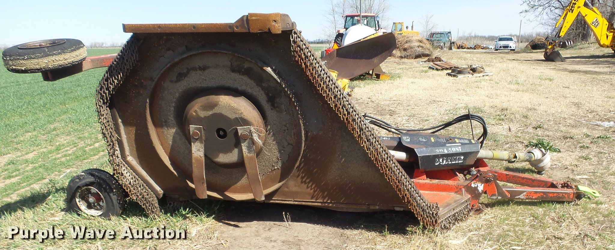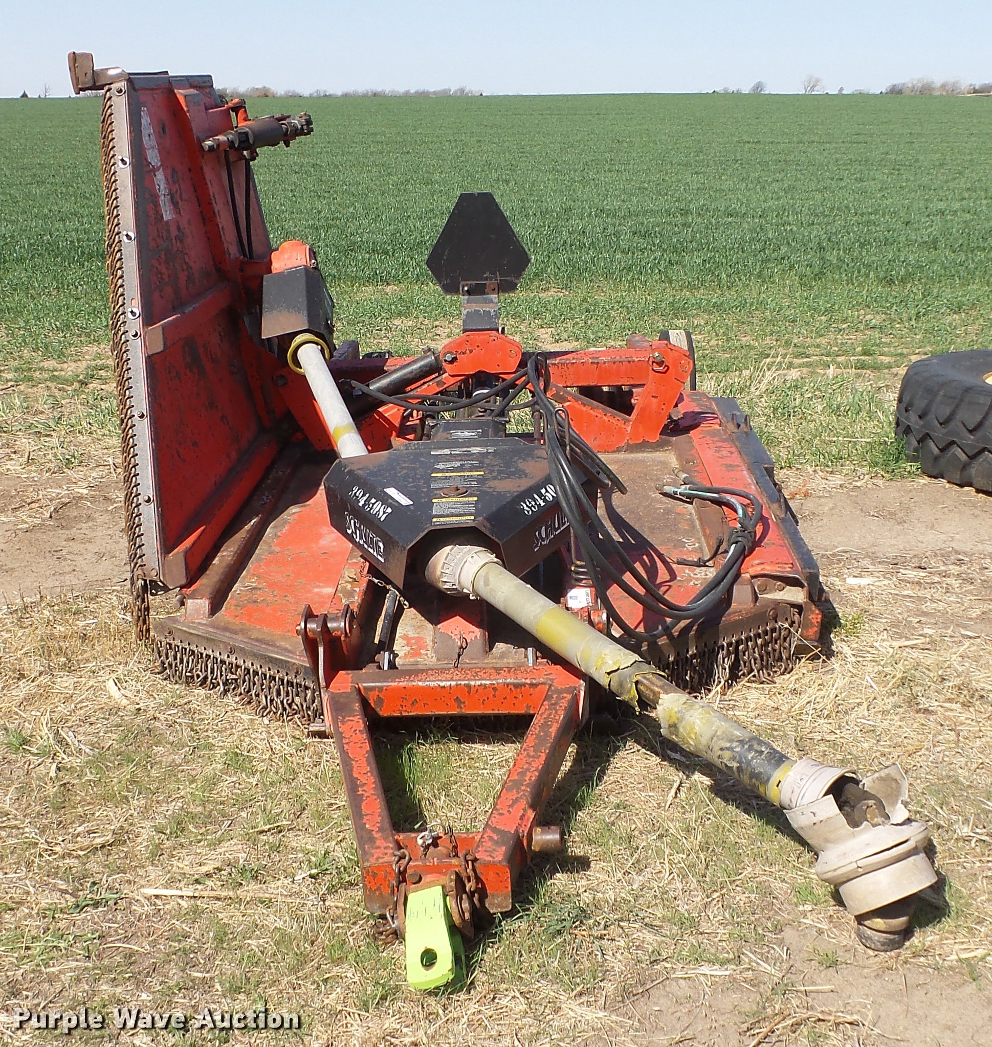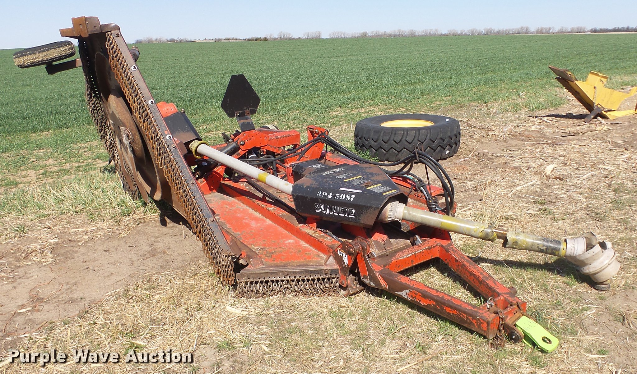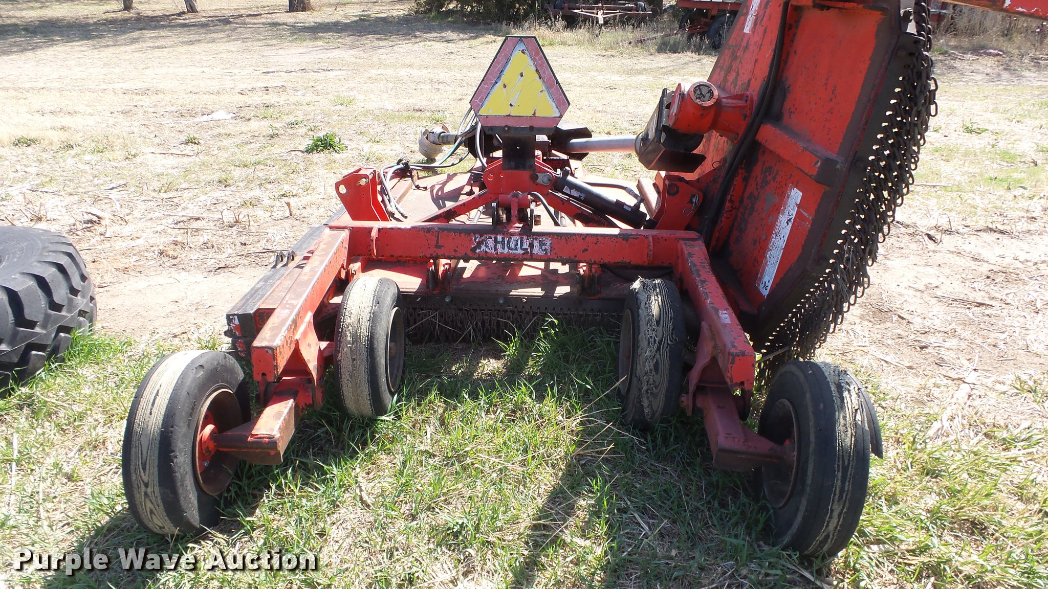 Purple Wave is selling a used Mower, Cutter, Shredder in Kansas. This item is a Schulte XH1000 rotary mower with the following: 10'W, Chain deflectors, Hydraulic lift and fold, 540 PTO, Pin hitch, Tires damaged