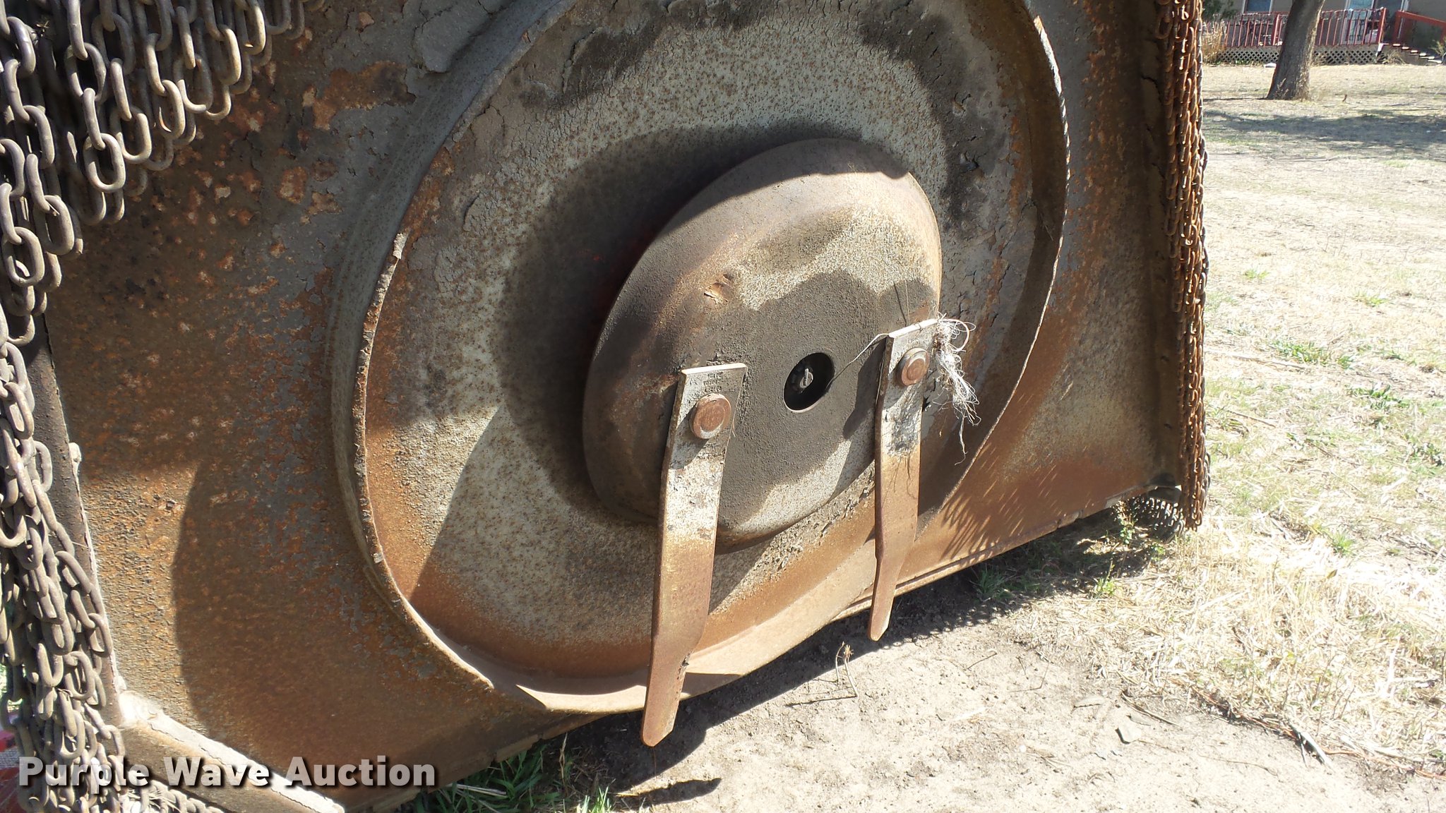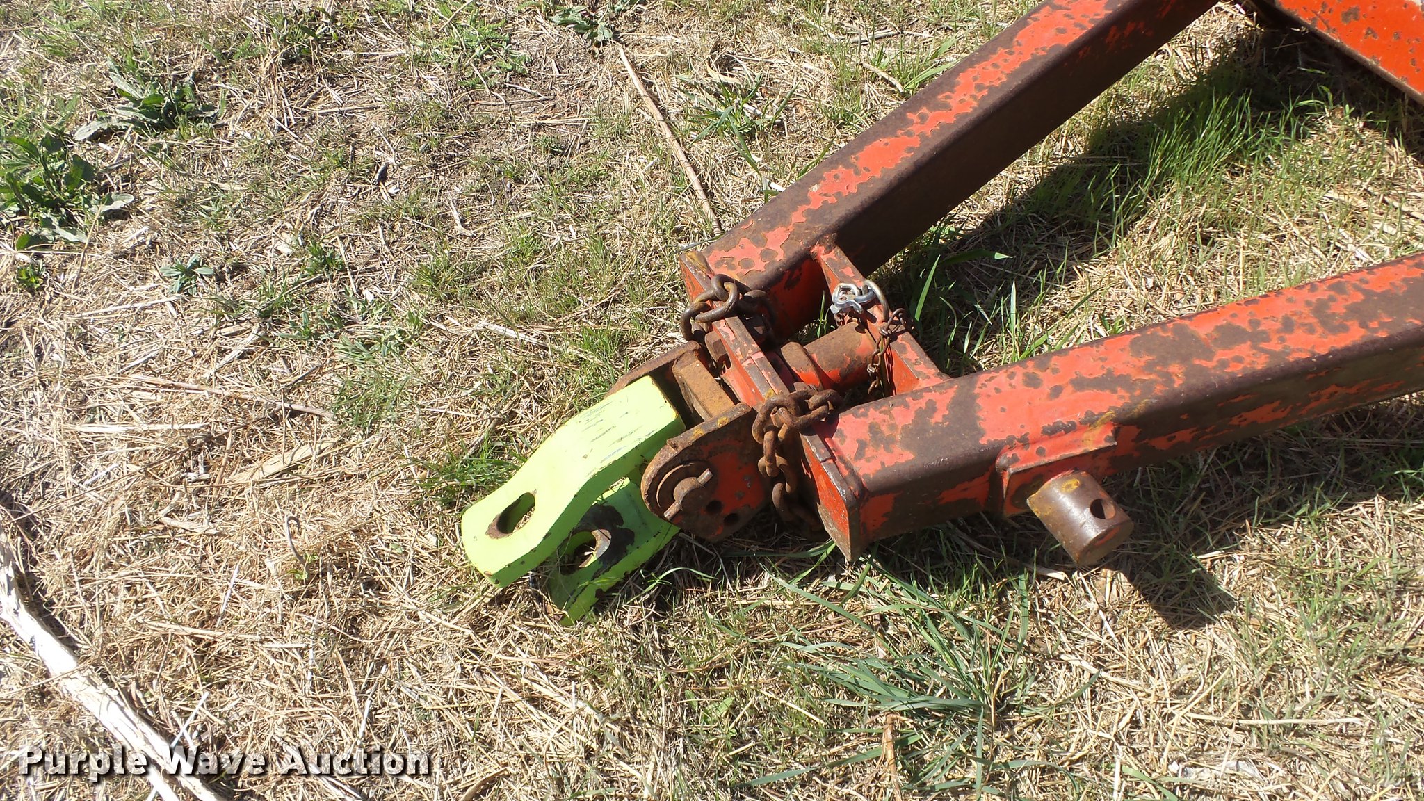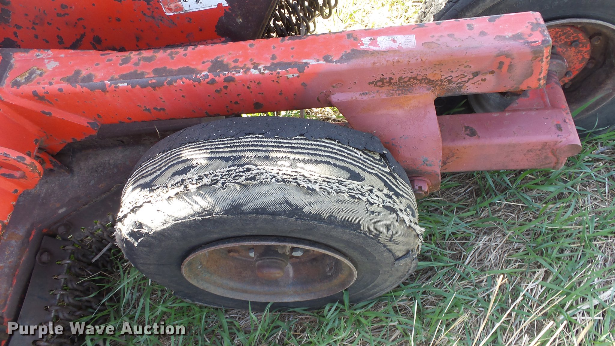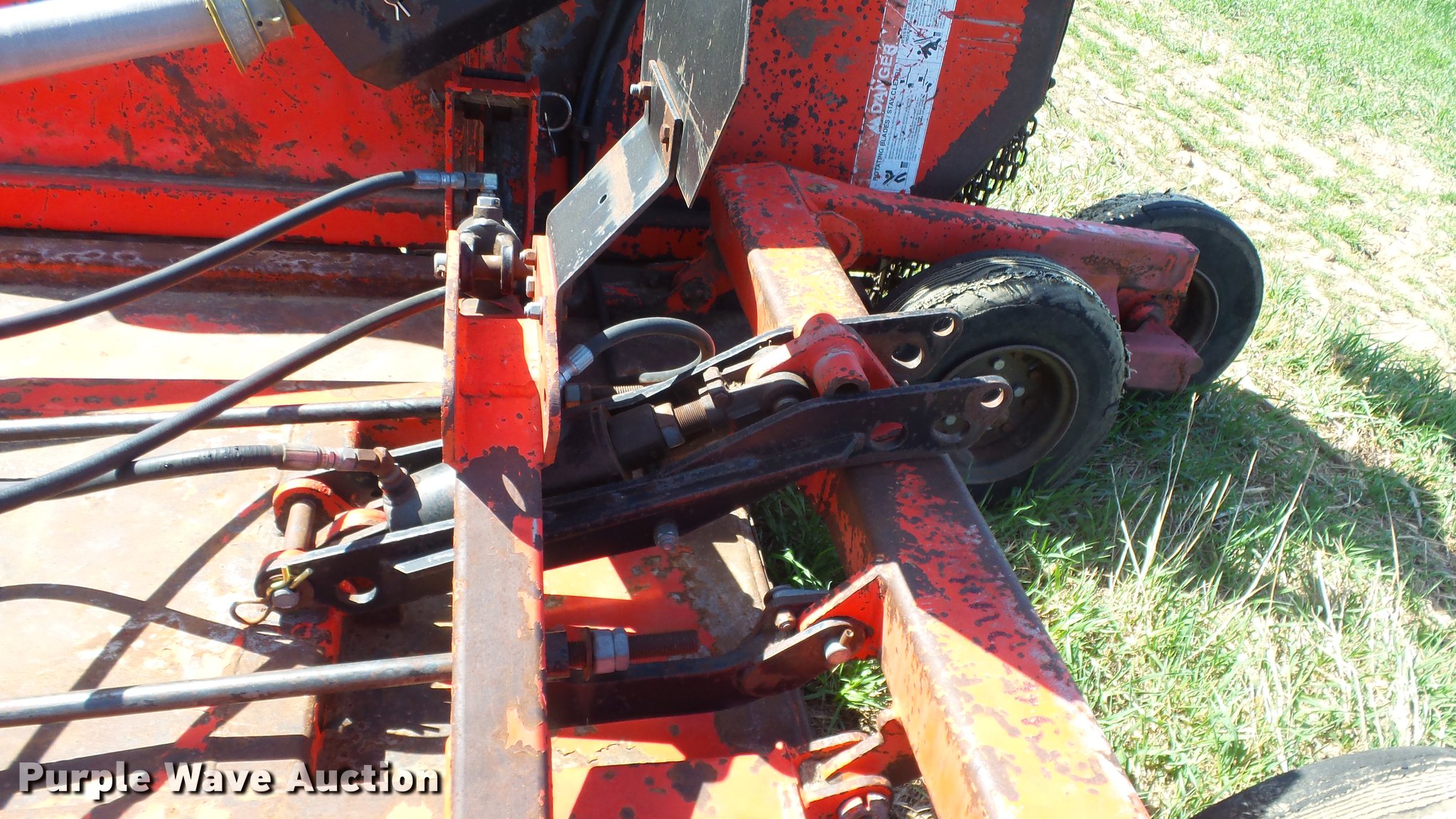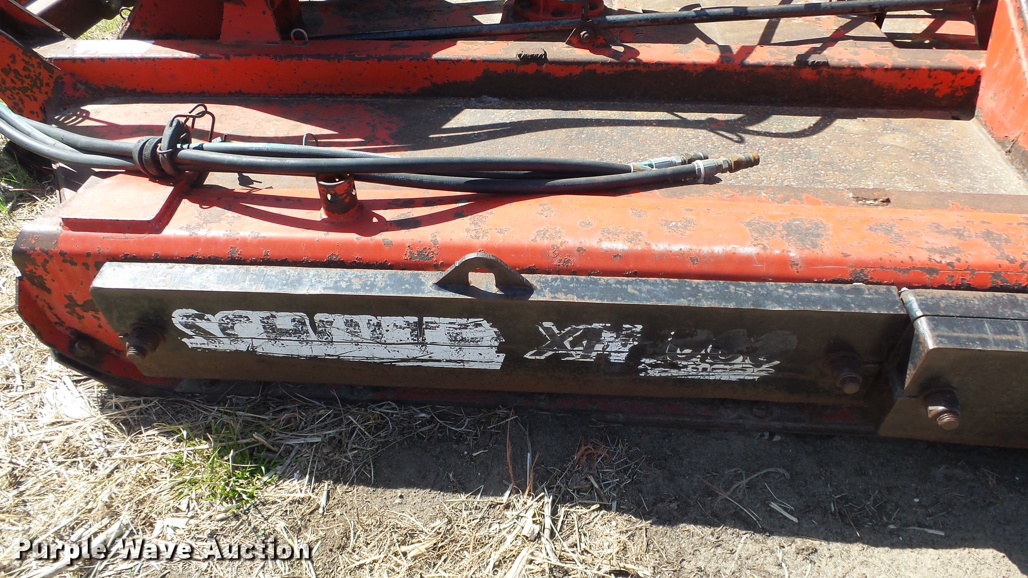 Purple Wave is selling a used Mower, Cutter, Shredder in Kansas. This item is a Schulte XH1000 rotary mower with the following: 10'W, Chain deflectors, Hydraulic lift and fold, 540 PTO, Pin hitch, Tires damaged