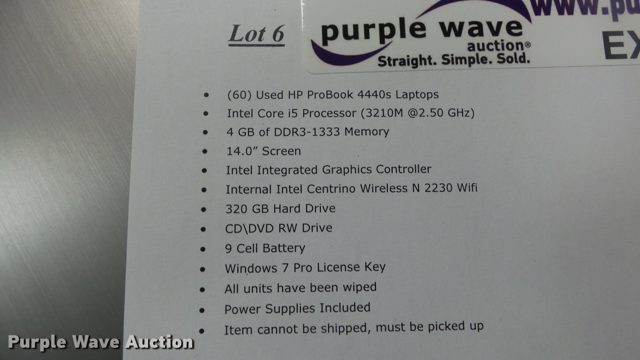 Purple Wave is selling a used Computers in Kansas. This item is a (60) HP ProBook 4440 laptops with the following: Intel Core i5 processors, 3210M at 2.50 GHz, 4 GB of DDR3-1333 RAM, 14" screen, Intel integrated graphics controller, Internal Intel Centrino Wireless-N 2230 wireless card, 320 GB hard drive, CD/DVD-RW drive, Nine cell battery, All units have been wiped, Power supplies