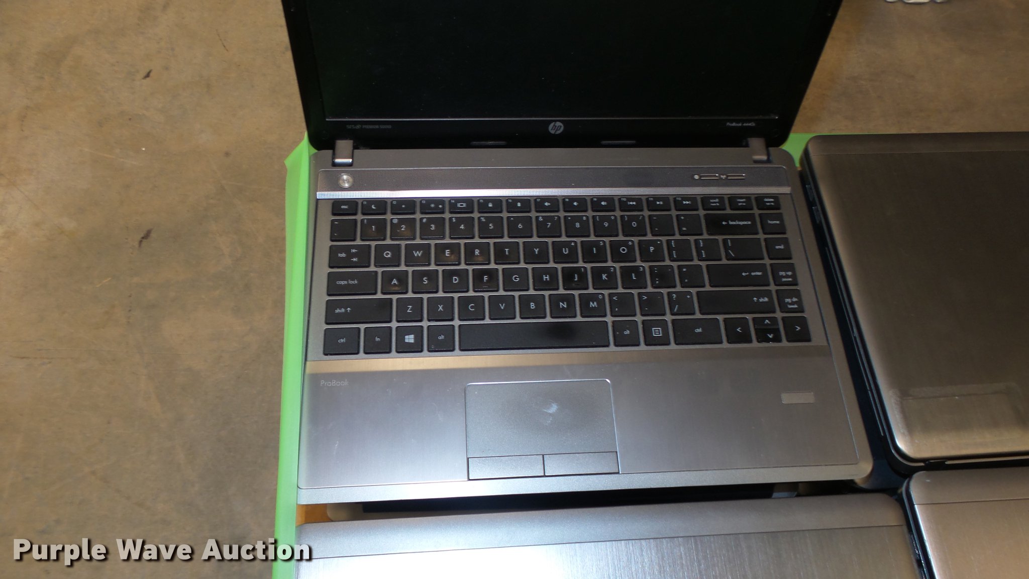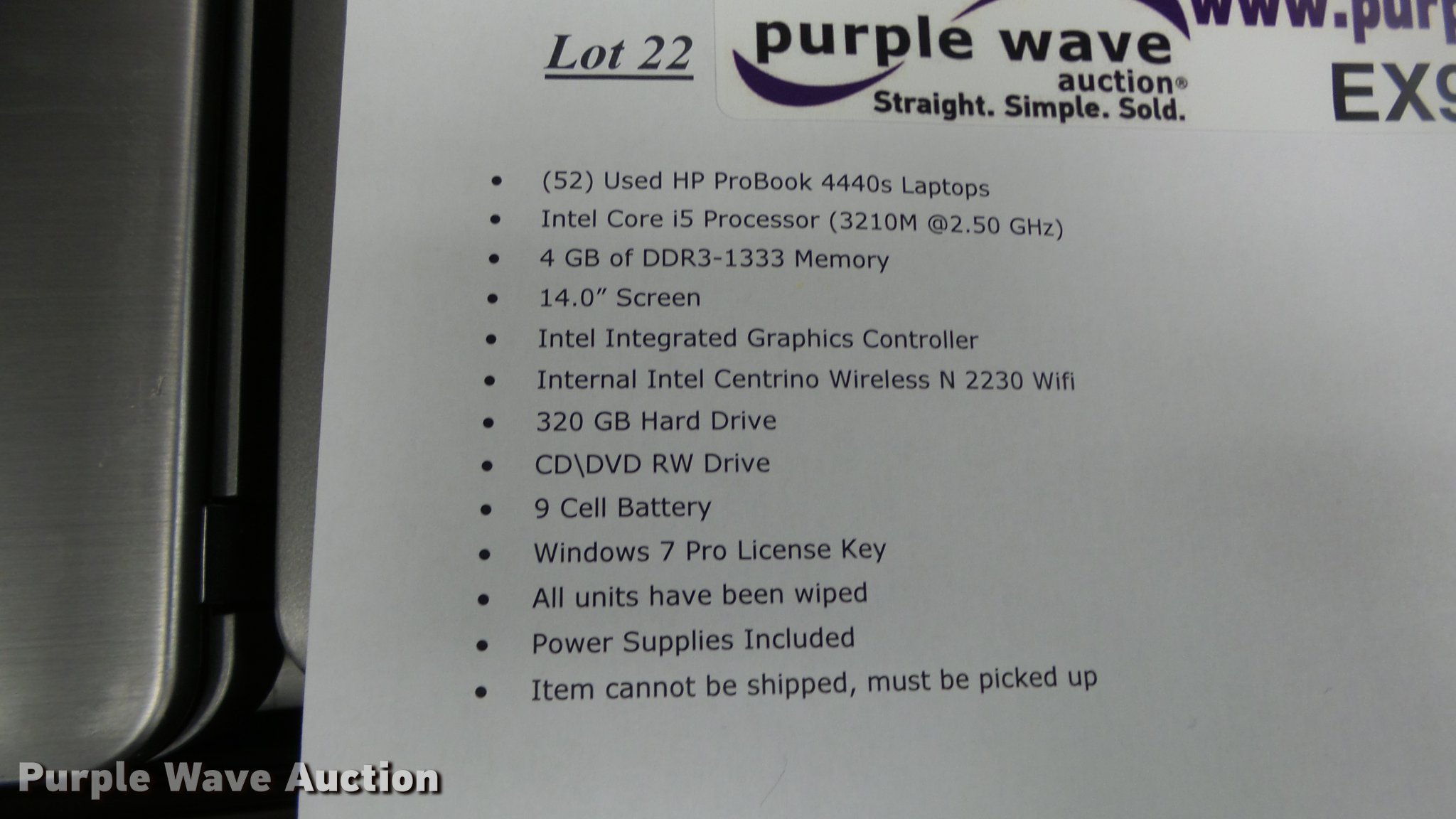 Purple Wave is selling a used Computers in Kansas. This item is a (52) HP ProBook 4440 laptops with the following: Intel Core i5 processors, 3210M at 2.50 GHz, 4 GB or DDR3-1333 RAM, 14" screen, Intel integrated graphics controller, Internal Intel Centrino Wireless-N 2230 wireless card, 320 GB hard drive, CD/DVD-RW drive, Nine cell battery, All unit have been wiped, Power supplies