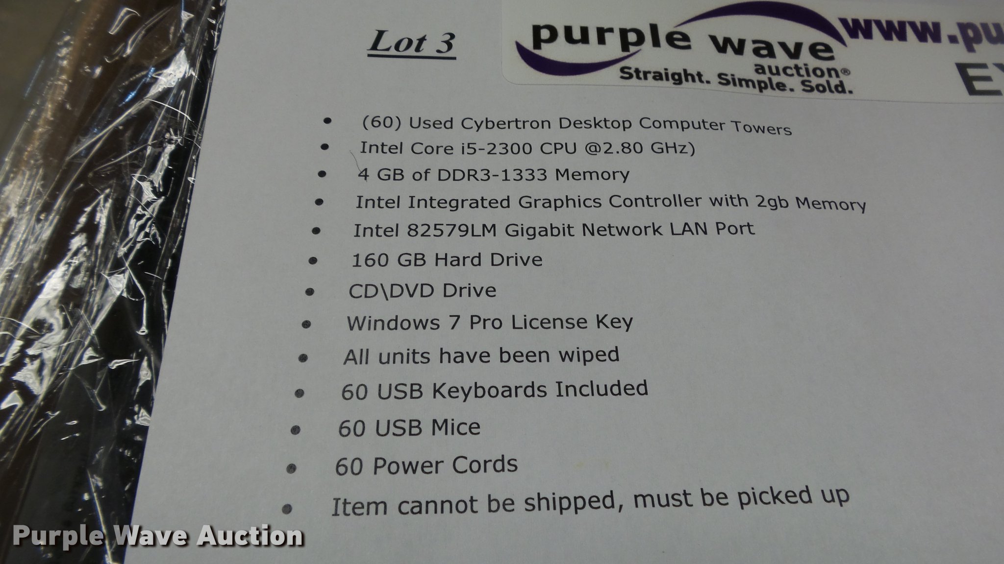 Purple Wave is selling a used Computers in Kansas. This item is a (60) Cybertron CPU's with the following: Intel Core i5-2300 CPU, 4 GB DDR3-1333 memeory, Intel integrated graphics controller, 2 GB memory, Intel 82579LM Gigabit network Lan port, 160 GB HDD, Optical drive, Hard drives wiped, (60) keyboards, (60) mice, Power cords