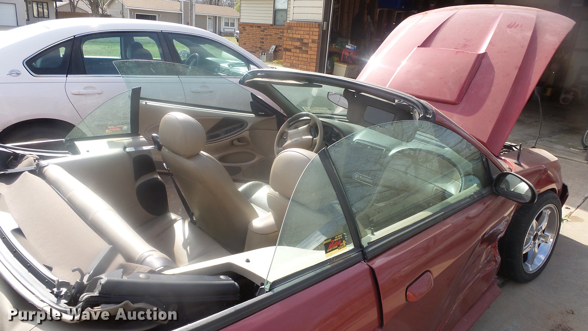 Purple Wave is selling a used Passenger Vehicle in Kansas. This item is a 2003 Ford Mustang GT convertible with the following: 98,841 miles on odometer, 4.6L V8 SOHC 16V gas engine, Automatic transmission, AC and heat, Tilt, Cruise, AM/FM/CD, Power windows, locks, and mirrors, Leather interior, 245/45ZR17 tires, Cracked windshield