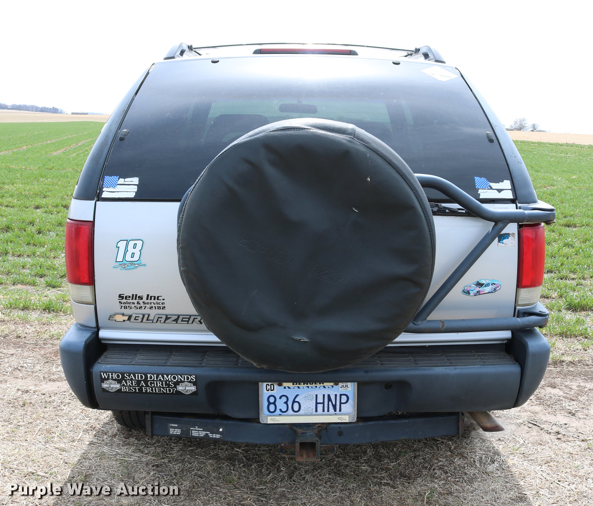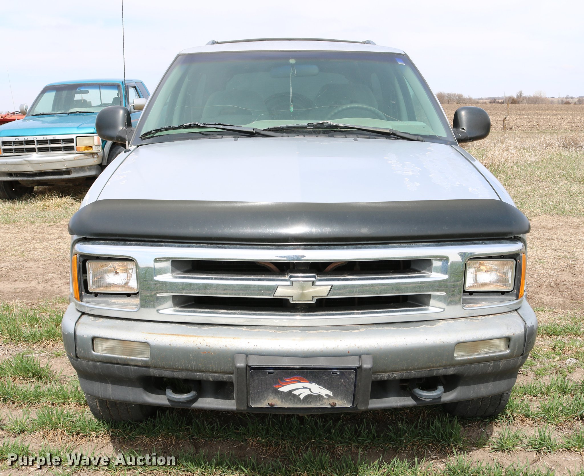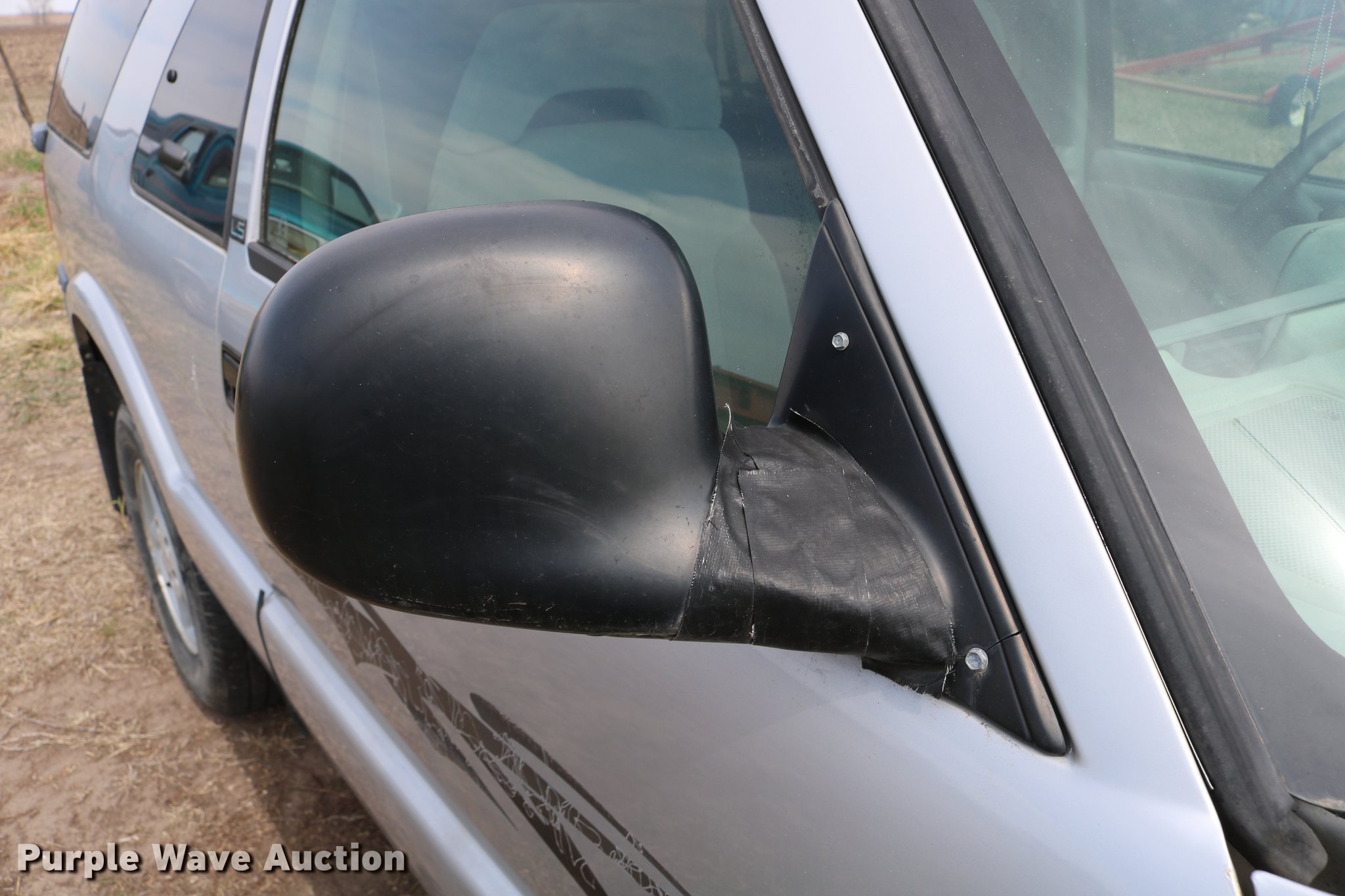 Purple Wave is selling a used Passenger Vehicle in Kansas. This item is a 1996 Chevrolet Blazer LS SUV with the following: 144,336 miles on odometer, 4.3L V6 OHV 12V gas engine, Automatic transmission, Four wheel drive, AC and heat, Tilt, Cruise, AM/FM/CD, Power windows, locks, mirrors, and seat, Cloth interior, Front tow hooks, Receiver hitch, 235/70R15 tires, Cracked windshield, Hail damage, Mirrors broken, Passenger door panel pieces missing