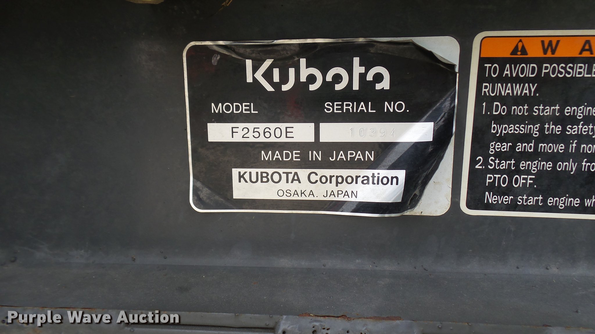 Purple Wave is selling a used Commercial Turf Mower in Missouri. This item is a Kubota F2560E lawn mower with the following: 1,148 hours on meter, 60" cut, Kubota three cylinder diesel engine, 25 HP, Hydrostatic transmission, ROPS, Hydraulic deck lift, 23-10.50-12 front tires, 16x6.50-8 rear tires, Serial 10394
