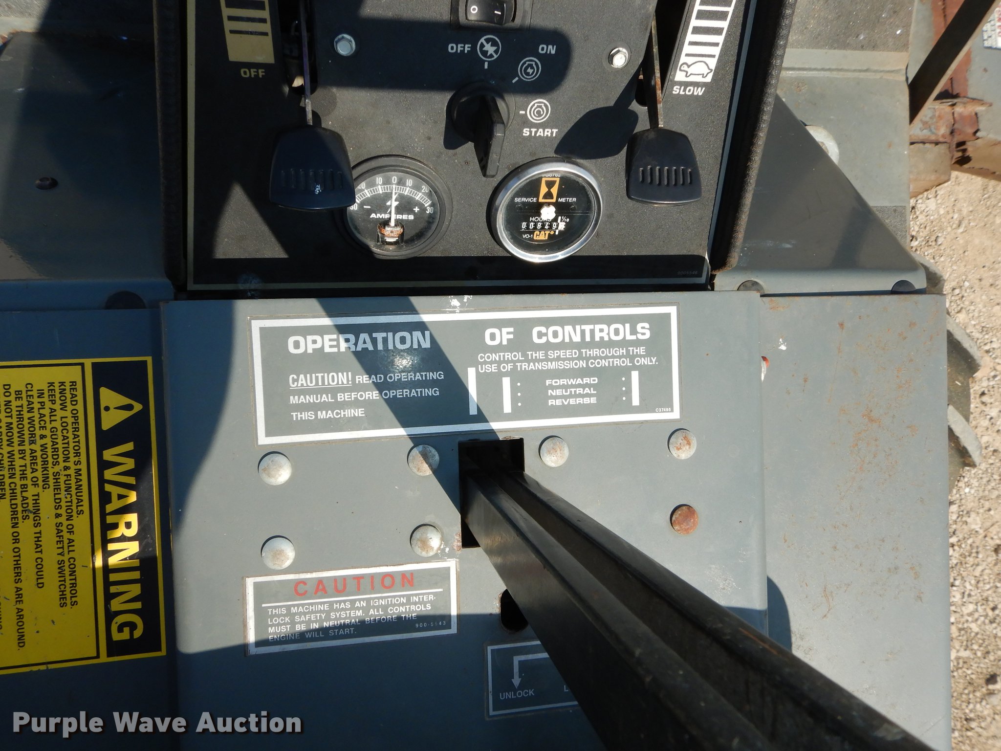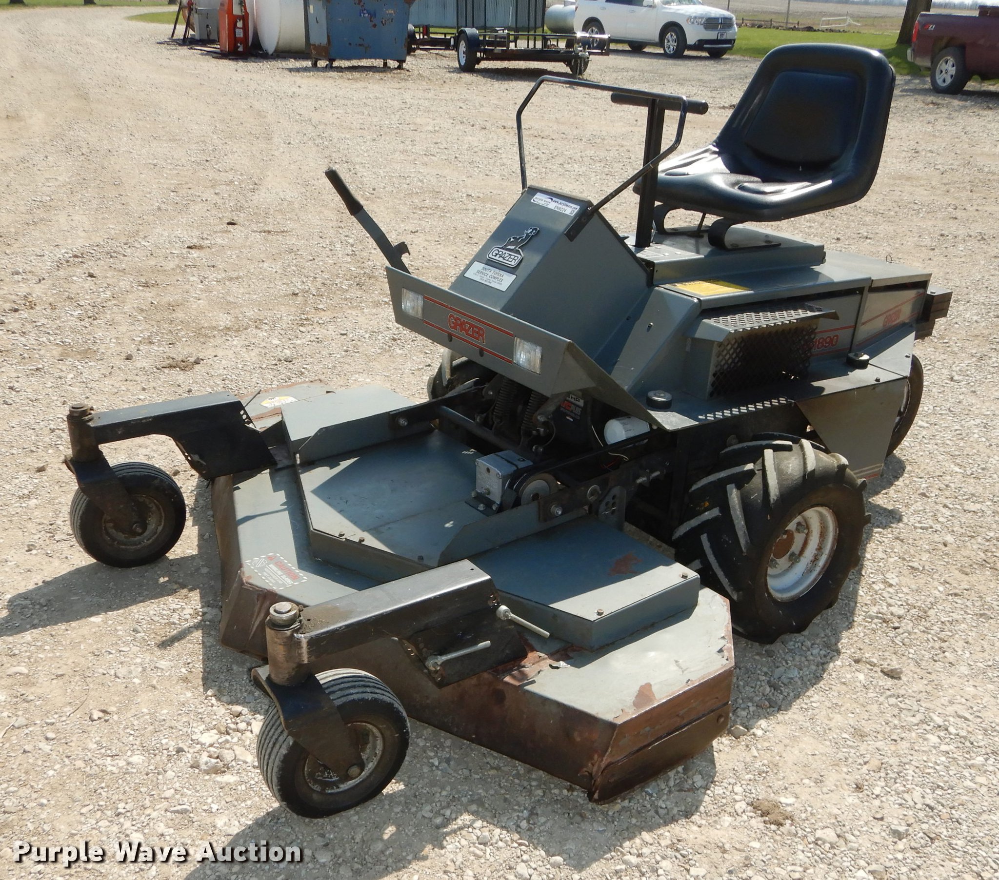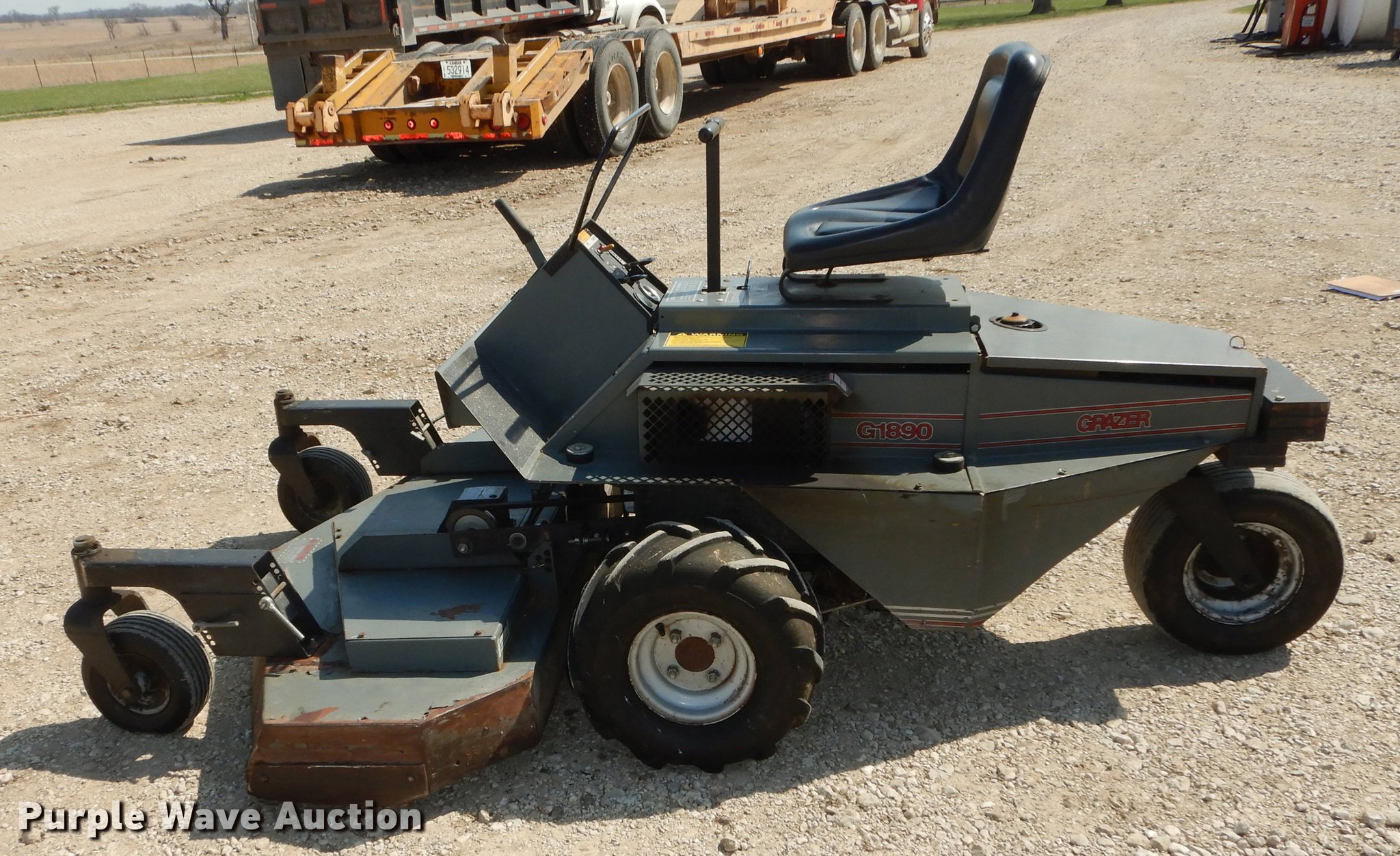 Purple Wave is selling a used Commercial Turf Mower in Kansas. This item is a 1995 Grazer G1890 ZTR lawn mower with the following: Approx. 1,100 to 1,200 hours, Hour meter inoperable, 62" cut, Briggs & Stratton 18 HP gas engine, Headlights, 11x4.00-5 deck tires, 18x9.50-8 front tires, 16x6.50-8 rear tires, Serial 953409017