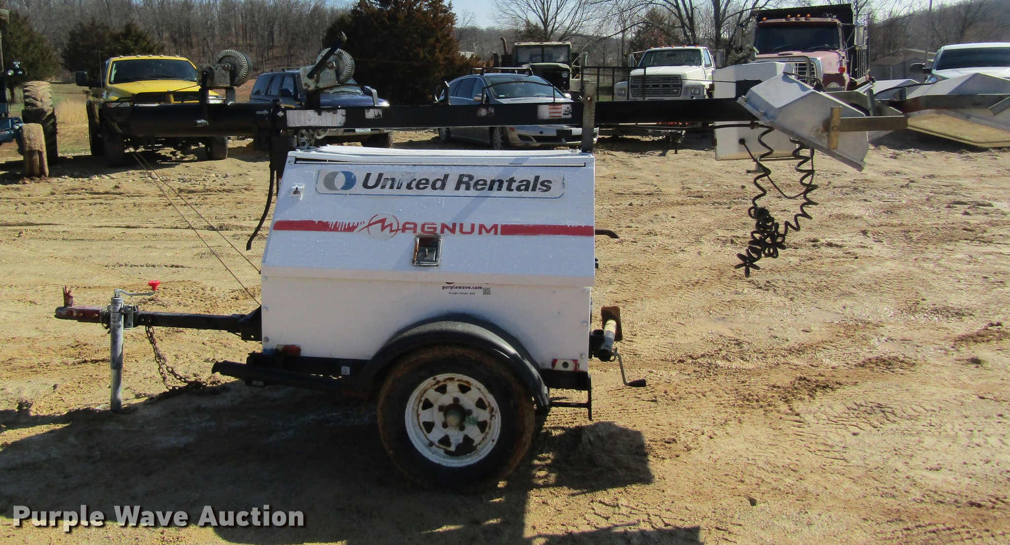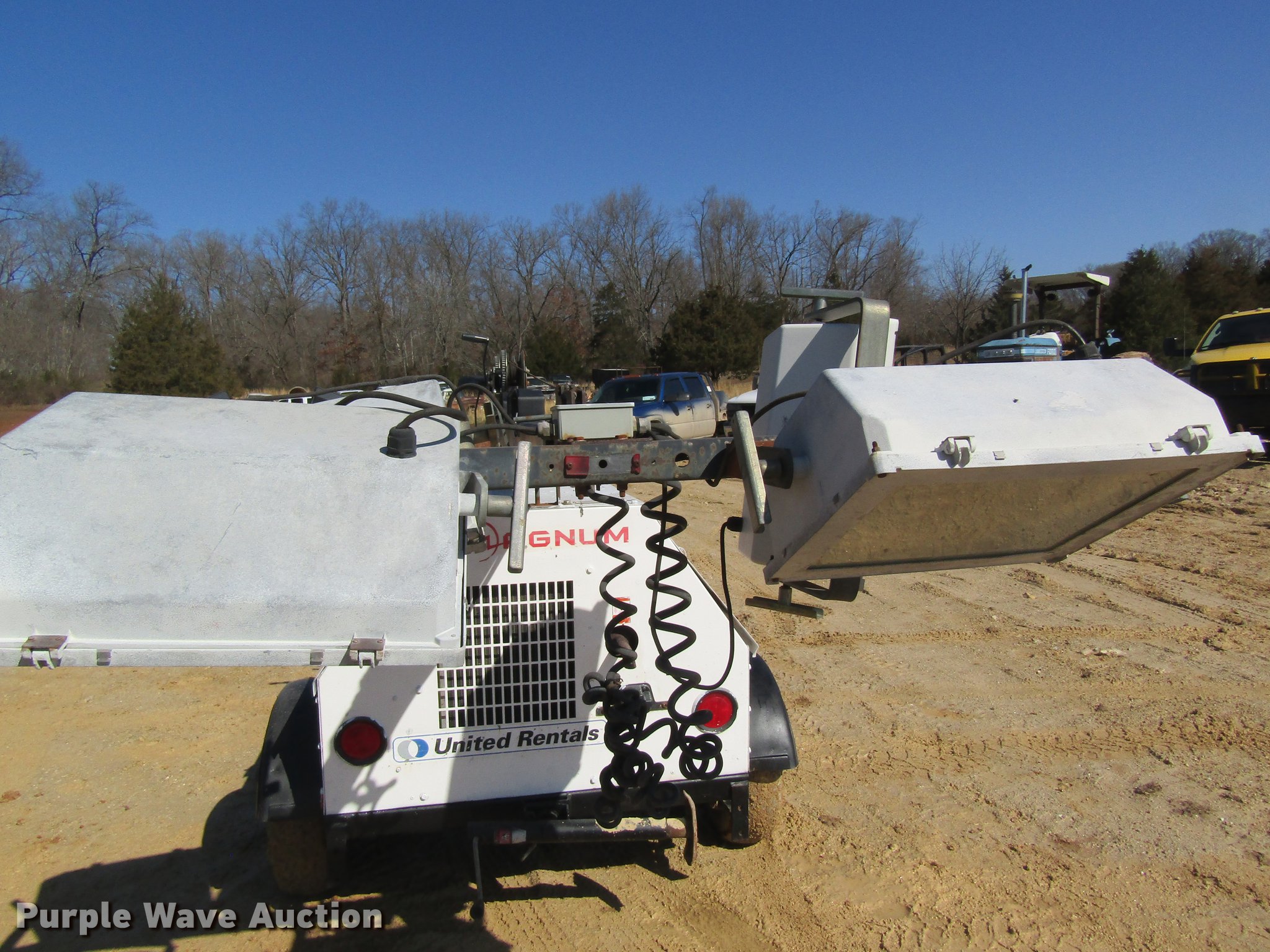 Purple Wave is selling a used Light Plant in Missouri. This item is a Magnum MLT4060MMH light plant with the following: 1,308 hours on meter, Kubota three cylinder diesel engine, Synchronous 201CSA5411 generator, 6,000 watts, 120/240V, 50/25 amps, (4) bulbs, Manual tower hoist, Stabilizers, 2" ball hitch, 175/80D13 tires, Serial 071155
