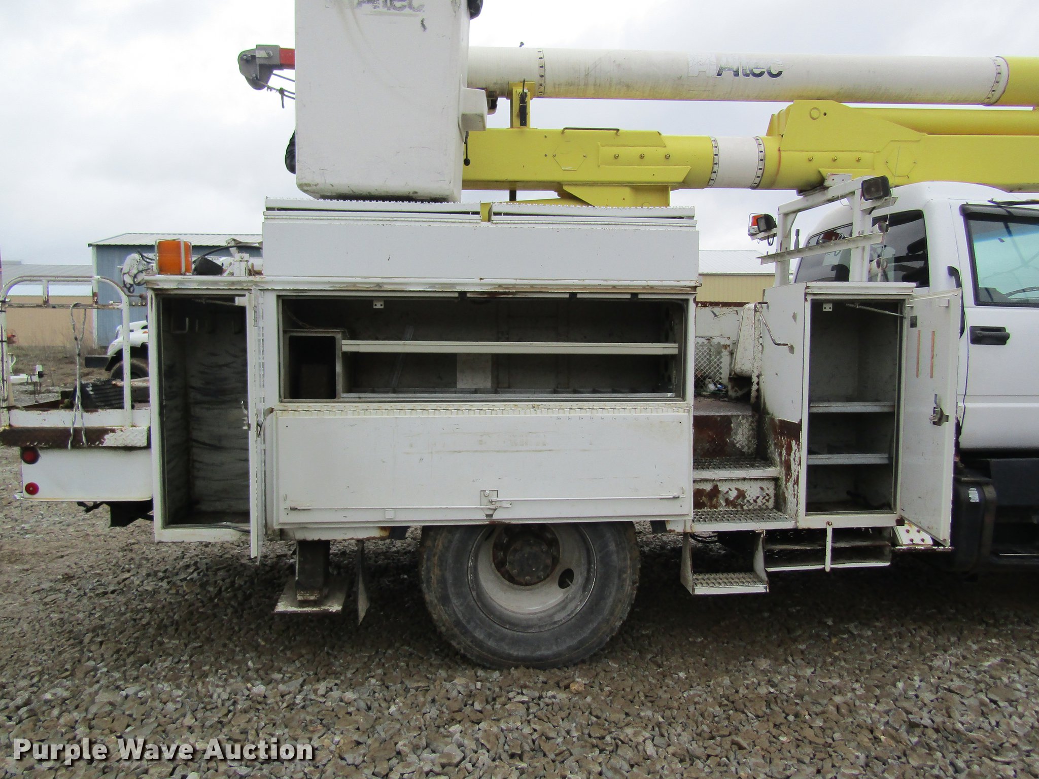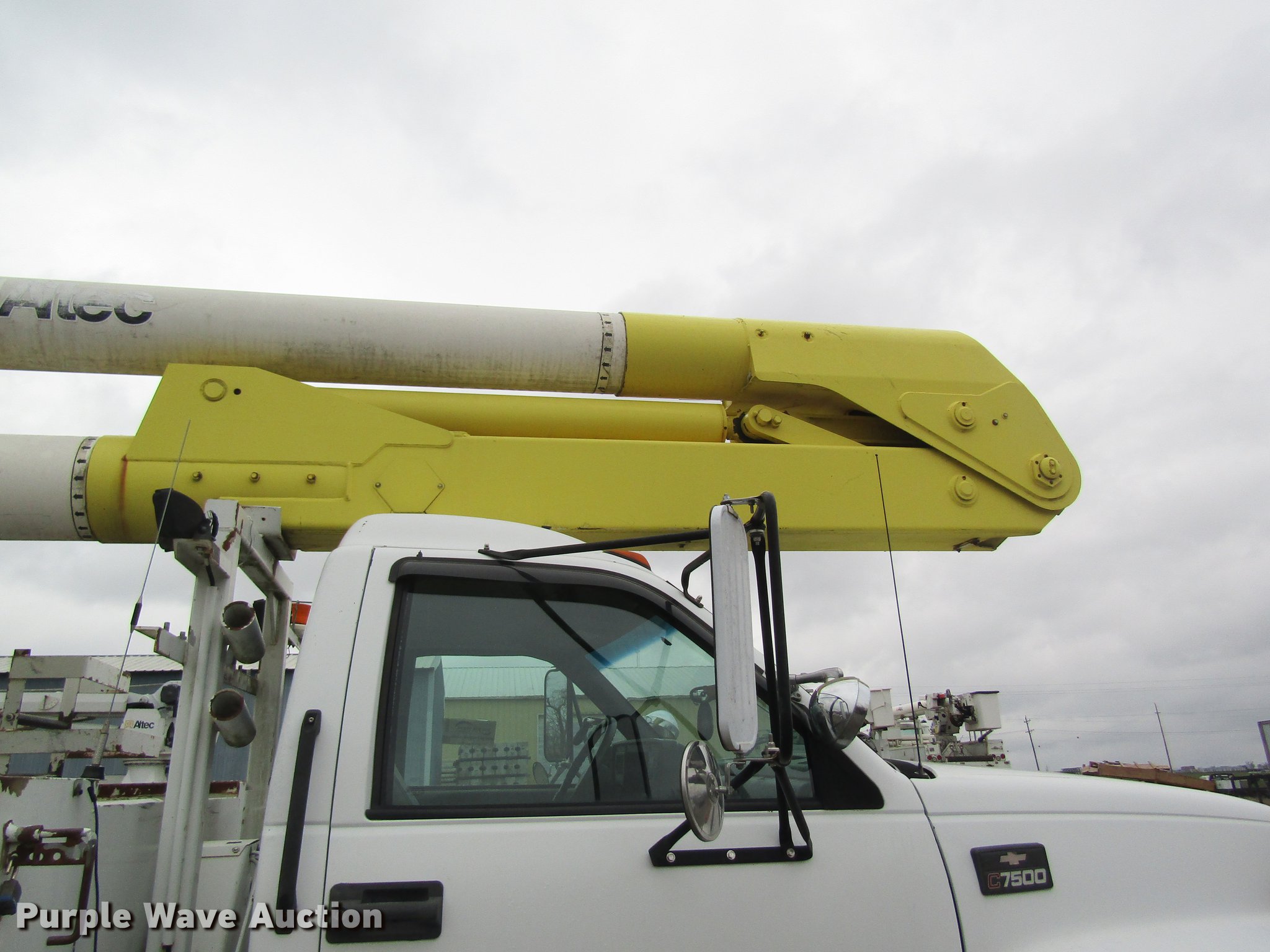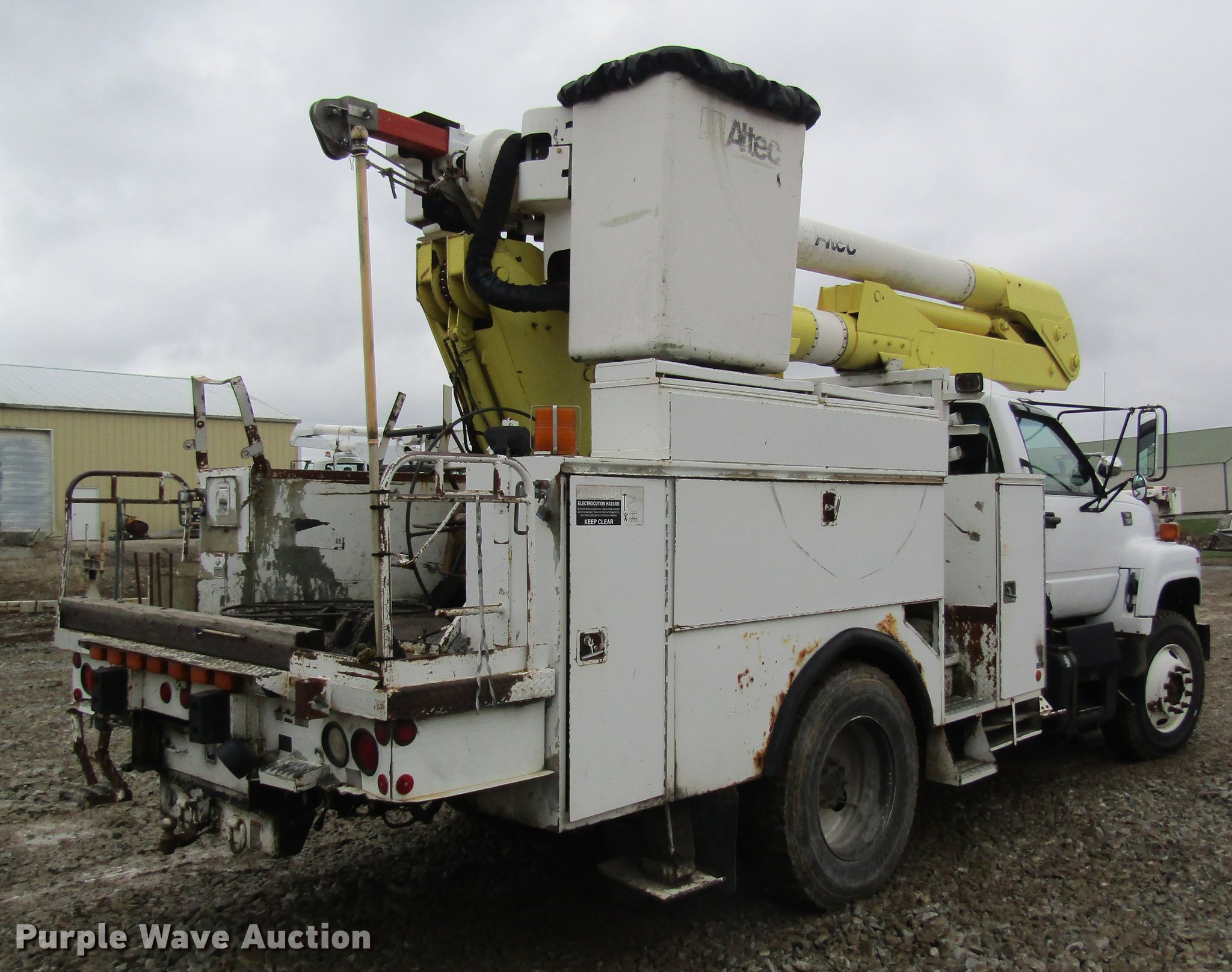 Purple Wave is selling a used Bucket Truck in Missouri. This item is a 2001 Chevrolet C7500 bucket truck with the following: 183,247 miles on odometer, 13,422 hours on meter, Caterpillar 3126 7.2L L6 turbo diesel engine, Automatic transmission, Single axle, Heat, AM/FM, Suspension seat, Beacon light, PTO, Front tow hooks, Altec 13.5'L utility bed, Shelving, Serial 47-24961, Altec A0442 boom, 400 lbs maximum lift capacity, 42' maximum lift height, Man basket, Ground and platform controls, Articulating boom, Rope material handler, (4) outriggers, Serial 0201BD0454, Dual fuel tanks, Pintle hitch, Trailer wiring, Spring suspension, Air brakes, 11R22.5 tires, GVWR 33,000 lbs, View aerial device test report