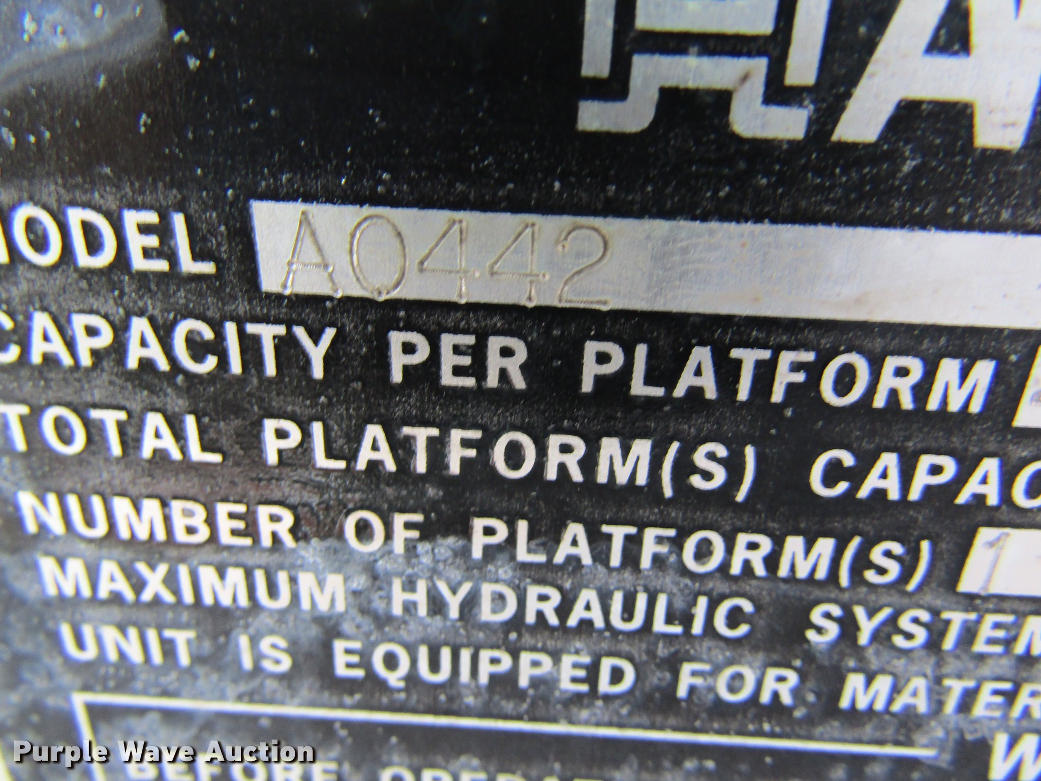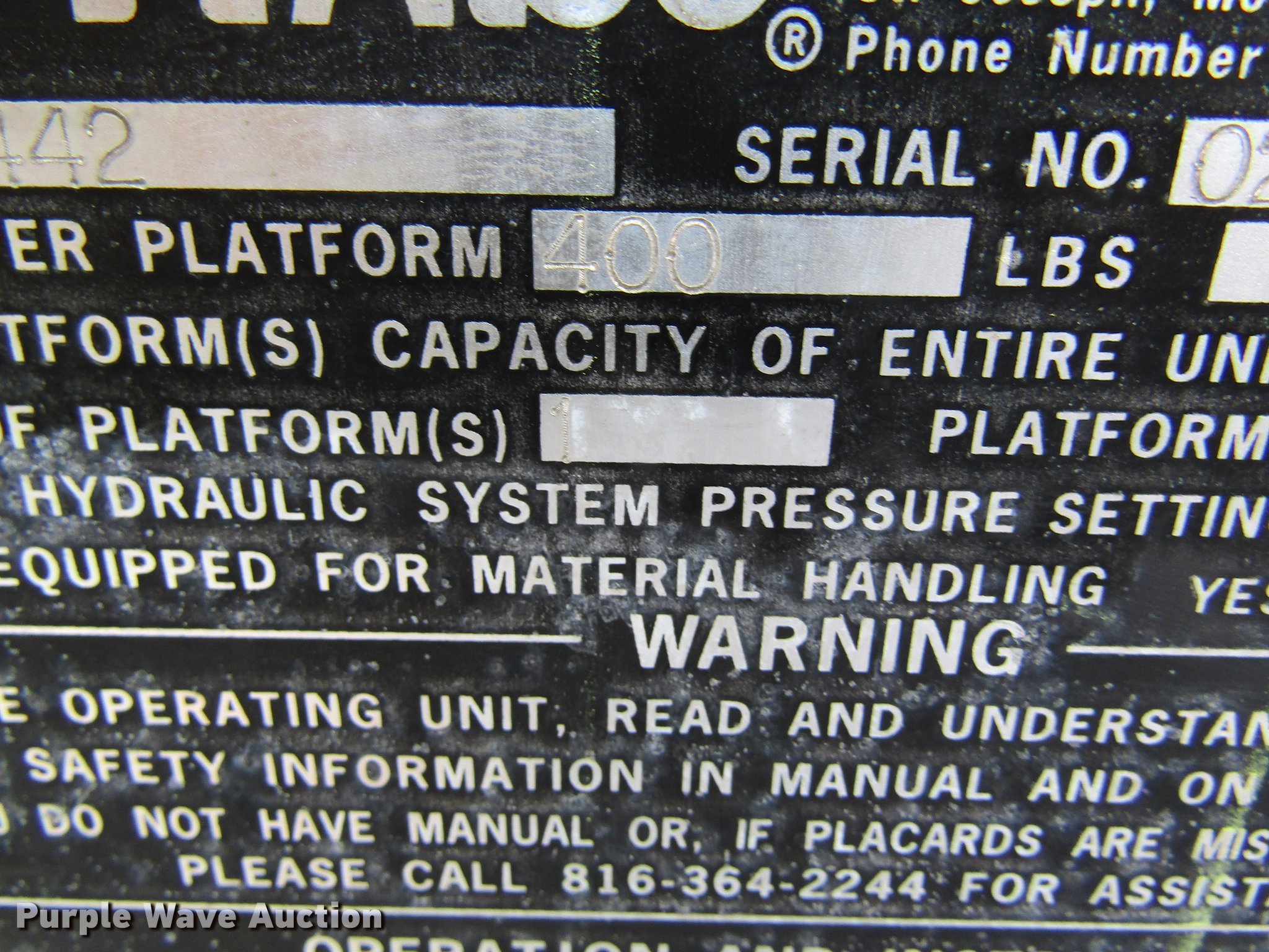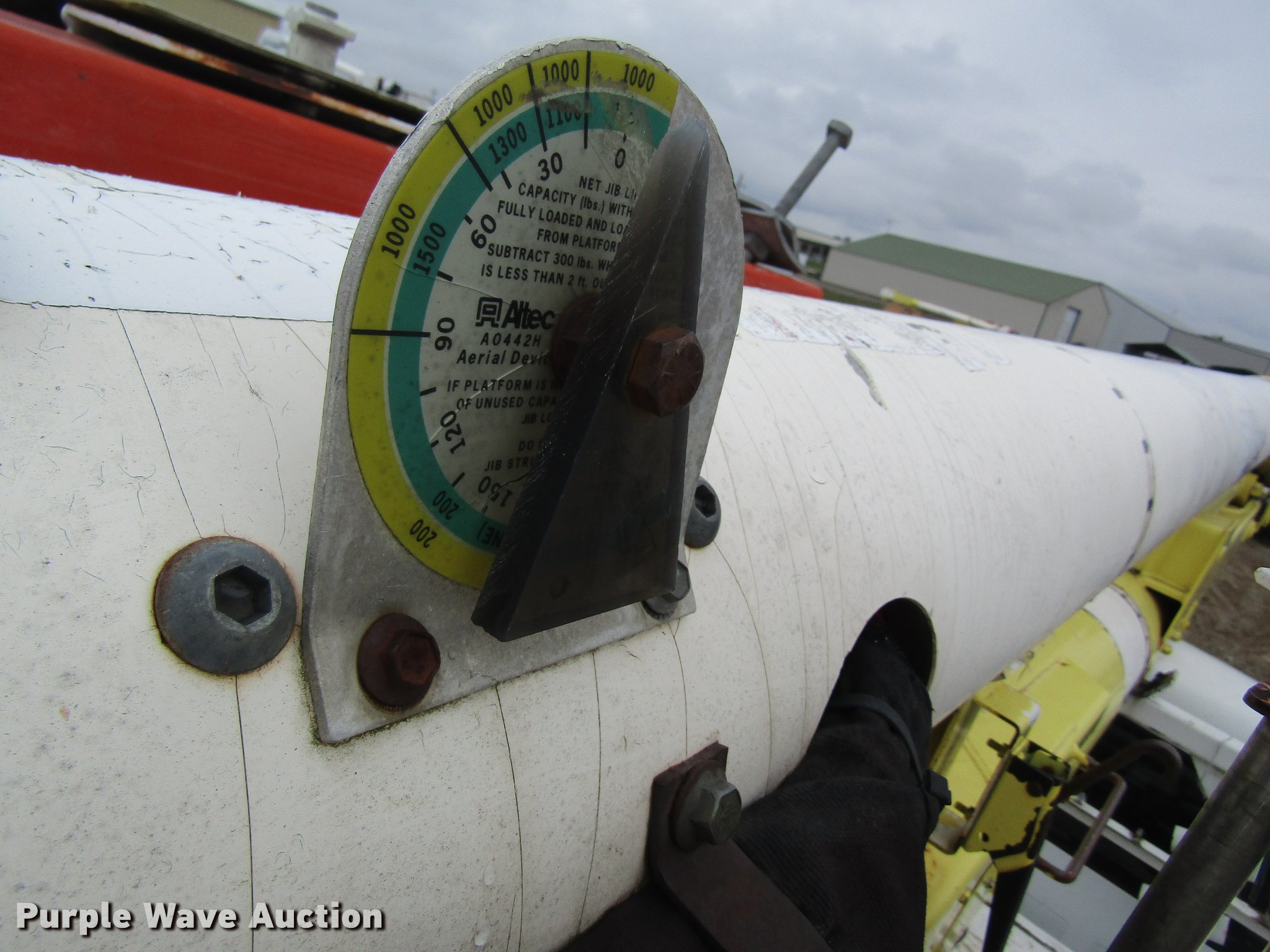 Purple Wave is selling a used Bucket Truck in Missouri. This item is a 2001 Chevrolet C7500 bucket truck with the following: 183,247 miles on odometer, 13,422 hours on meter, Caterpillar 3126 7.2L L6 turbo diesel engine, Automatic transmission, Single axle, Heat, AM/FM, Suspension seat, Beacon light, PTO, Front tow hooks, Altec 13.5'L utility bed, Shelving, Serial 47-24961, Altec A0442 boom, 400 lbs maximum lift capacity, 42' maximum lift height, Man basket, Ground and platform controls, Articulating boom, Rope material handler, (4) outriggers, Serial 0201BD0454, Dual fuel tanks, Pintle hitch, Trailer wiring, Spring suspension, Air brakes, 11R22.5 tires, GVWR 33,000 lbs, View aerial device test report