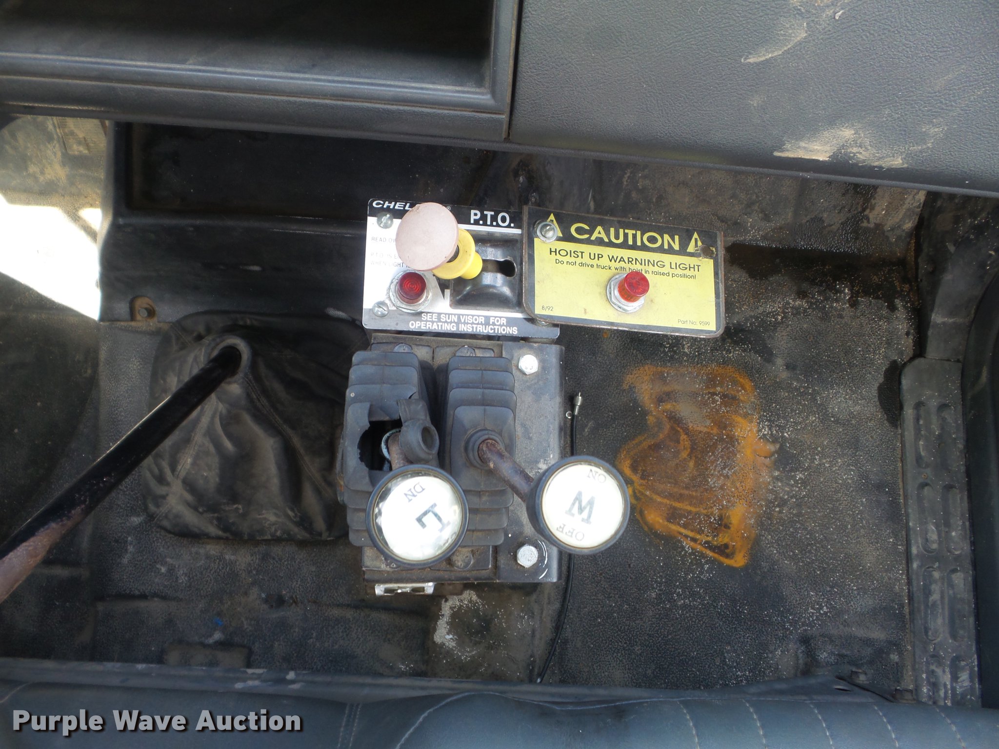Purple Wave is selling a used Rollback or Tow Truck in Illinois. This item is a 1999 GMC C7500 roll-off container truck with the following: 39,719 miles on odometer, Caterpillar 3126 7.2L L6 turbo diesel engine, 210 HP, Serial 7AS56007, Six speed manual transmission, Single axle, AC and heat, AM/FM, PTO, Backup alarm, Front tow hooks, Galbreath U3-0R-156 roll-off bed, 18' maximum container length capacity, 30,000 lbs maximum capacity, Dual cylinder cable hoist, Toolbox, Tarp, Dual fuel tanks, 233" wheelbase, Spring suspension, Air brakes, 11R22.5 tires, GVWR 32,000 lbs, 11R22.5 tires, Check engine light on, ABS light on, Hvac blower fan inoperable, Lift cylinder leak
