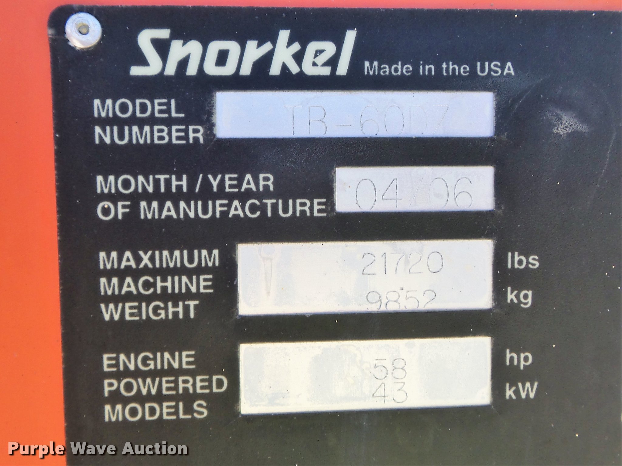 2006 Snorkel TB60 boom lift has sold in St. Louis, Missouri for $17600. Item DC7375 sold on May 3rd, 2018.