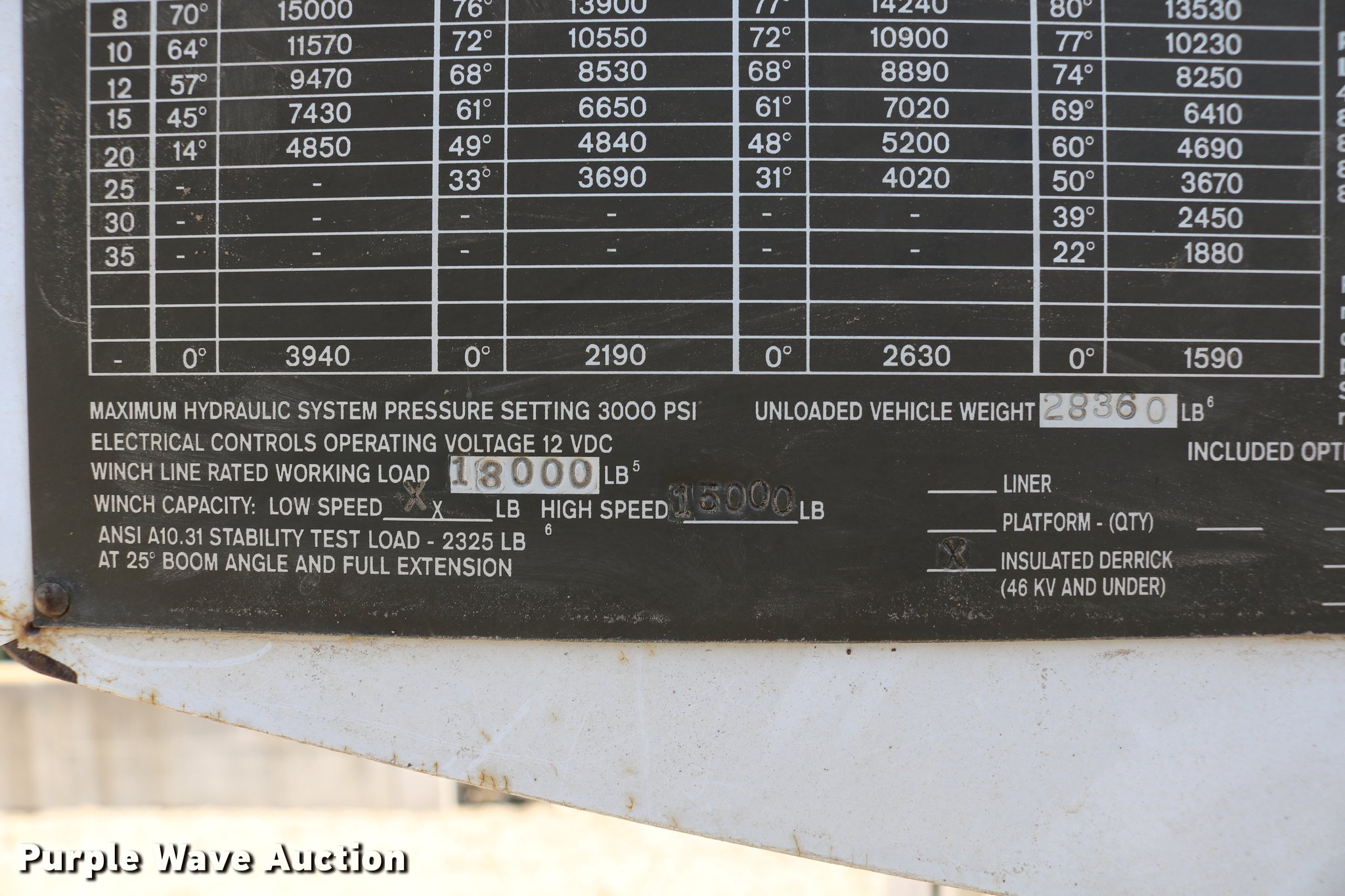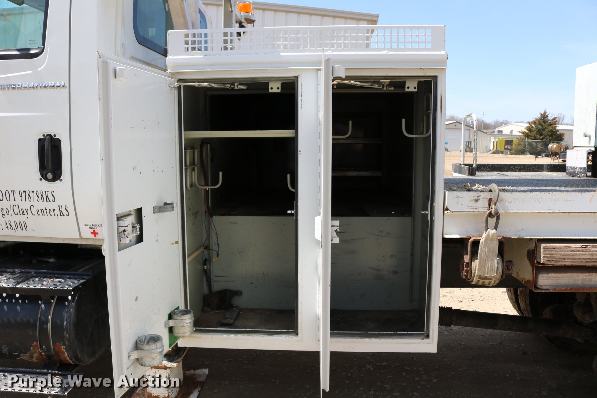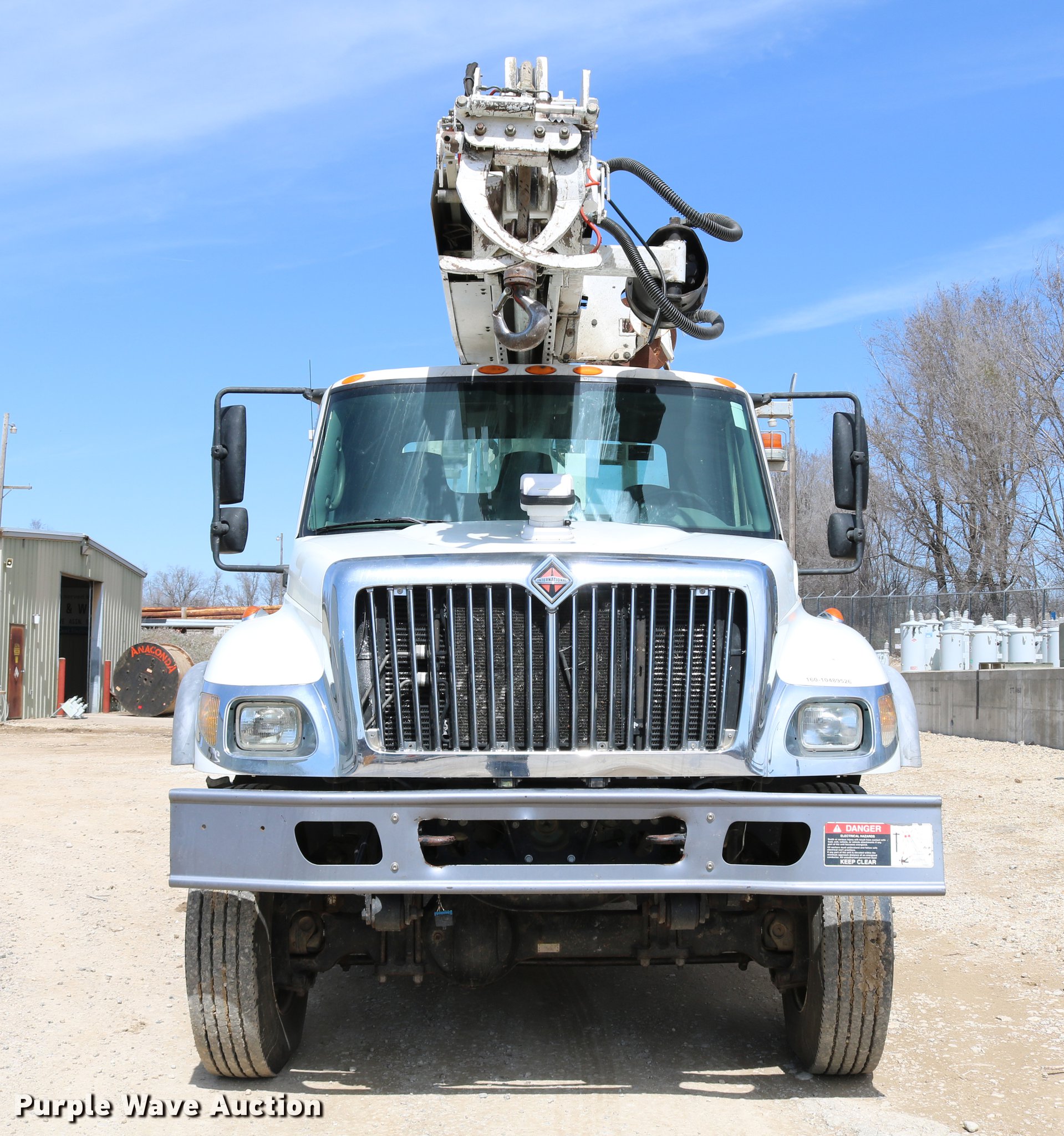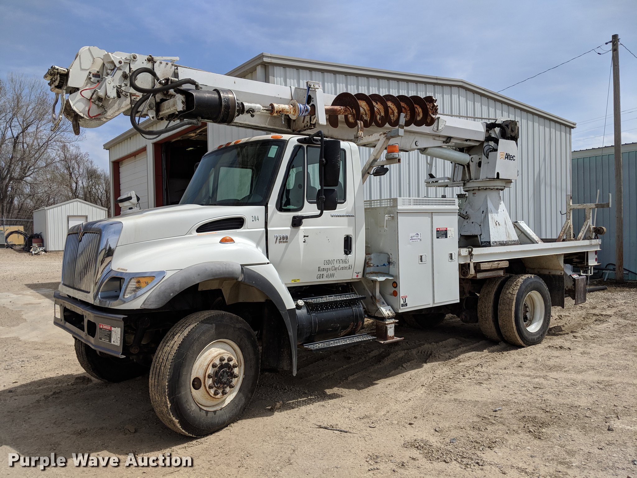 Purple Wave is selling a used Digger Derrick Truck in Kansas. This item is a 2007 International 7300 SFA digger derrick truck with the following: 82,262 miles on odometer, 7,643 hours on meter, 4,910 hours on quartz guage, International DT-466 7.6L L6 turbo diesel engine, Six speed manual transmission, Four wheel drive, Air suspension seat, Heat, Auxiliary controls, Backup alarm, Beacon light, PTO, Quick-connect power outlet, Altec service bed, 16'9"L, Shelving, Serial 106-10489526, 2008 Altec DM47TR boom, 47' max lift height, Platform controls, Boom rotation, Pole guide, Articulating, insulated, and telescopic boom, Rope material handler, (4) outriggers, 16" diameter auger, Certification valid through 01/18, Serial 0108DV3327, Pintle hitch, Single fuel tank, 495" wheelbase, Single axle, Spring suspension, Air brakes, 11R22.5 tires, GVWR 33,000 lbs