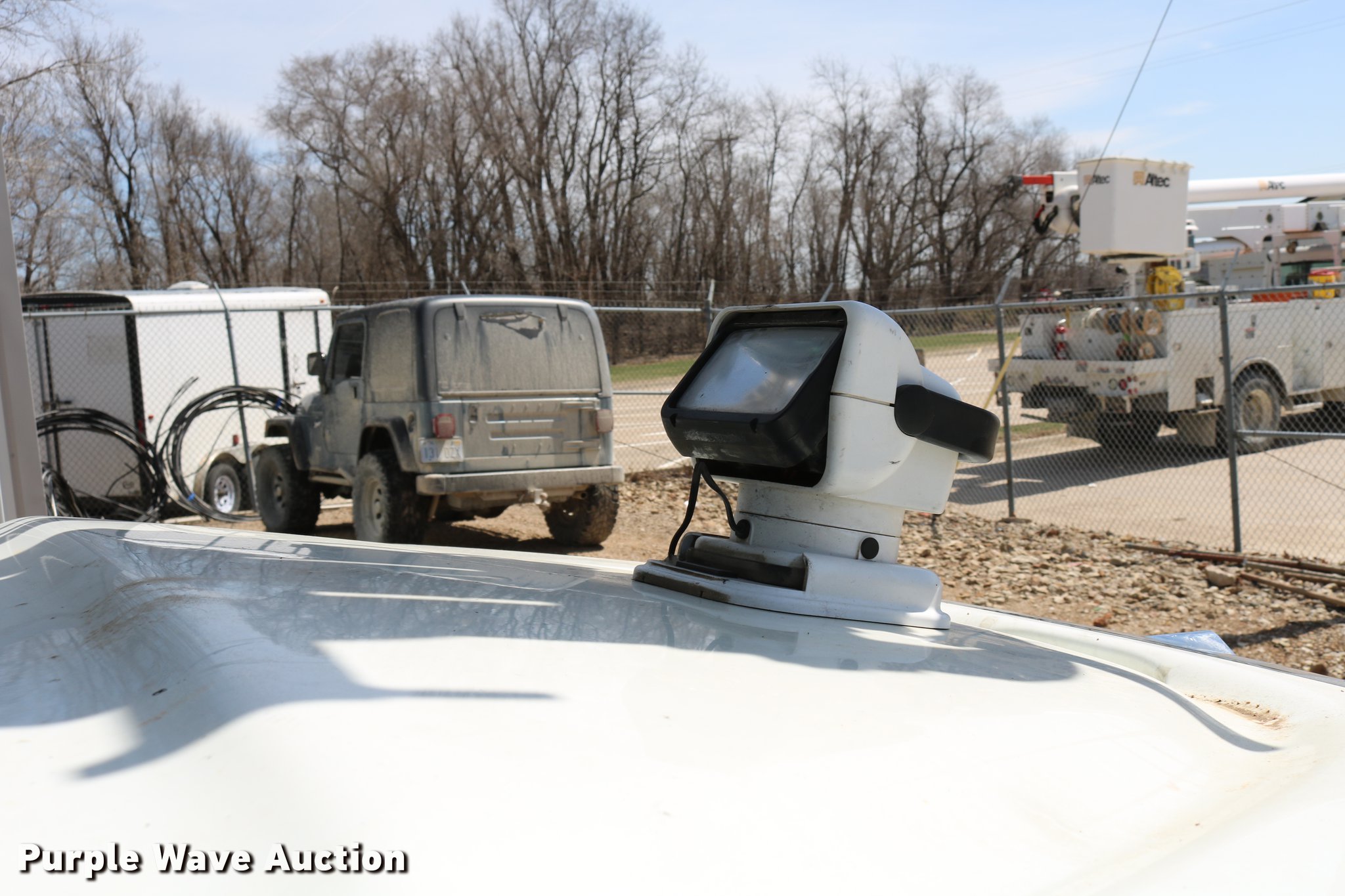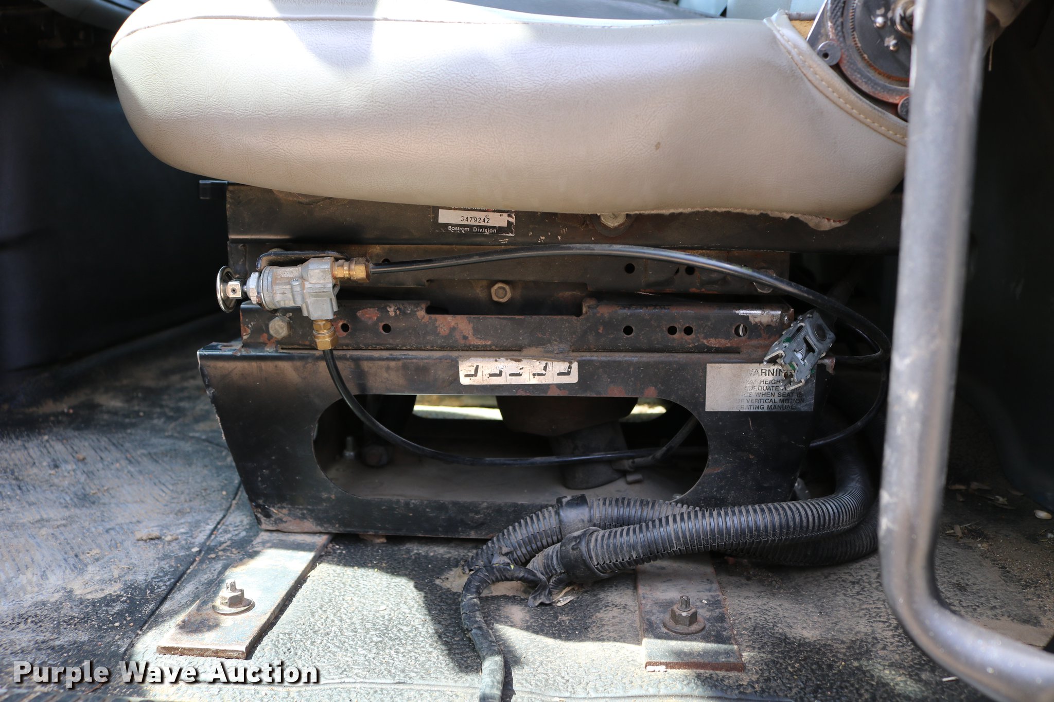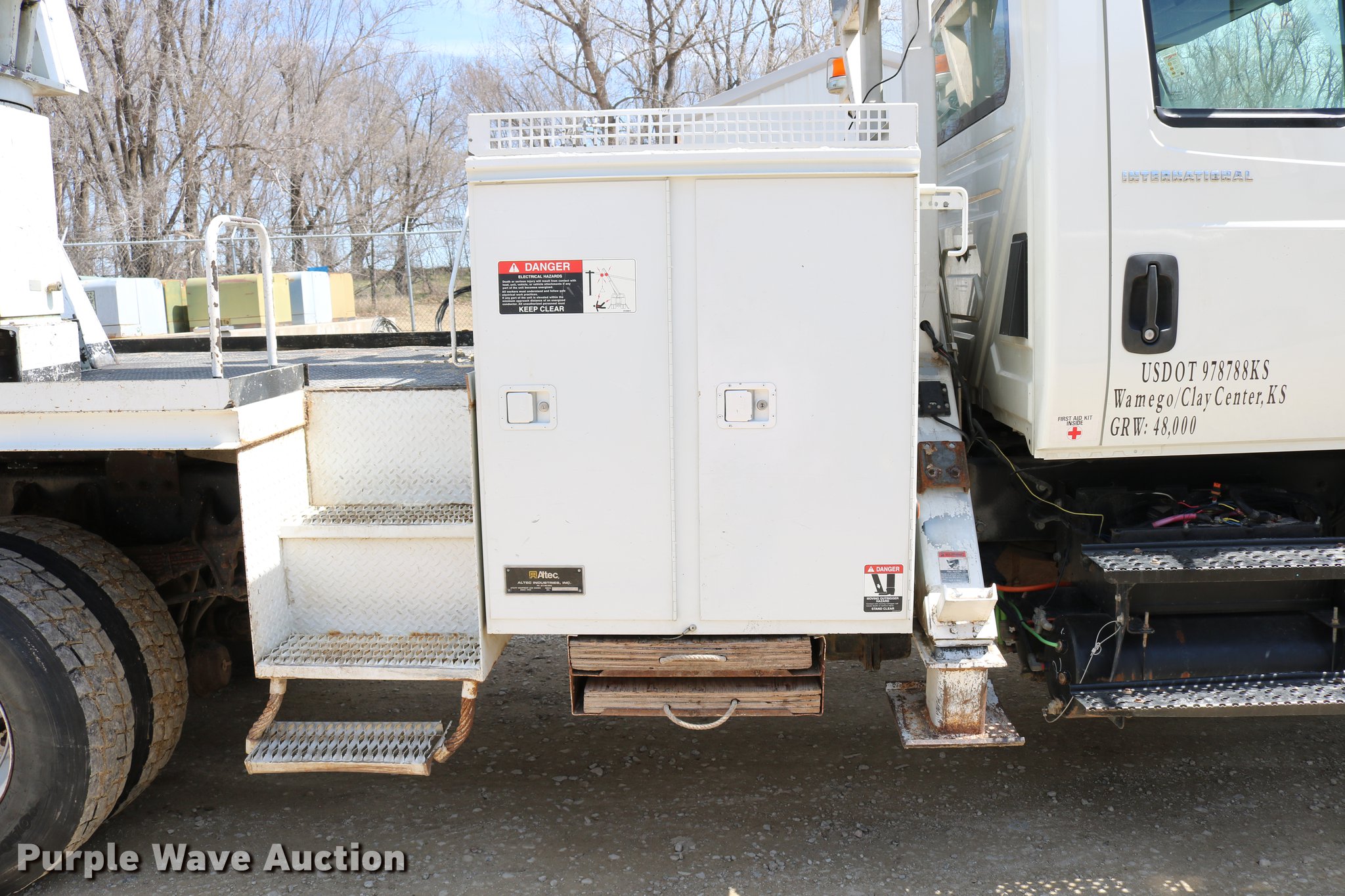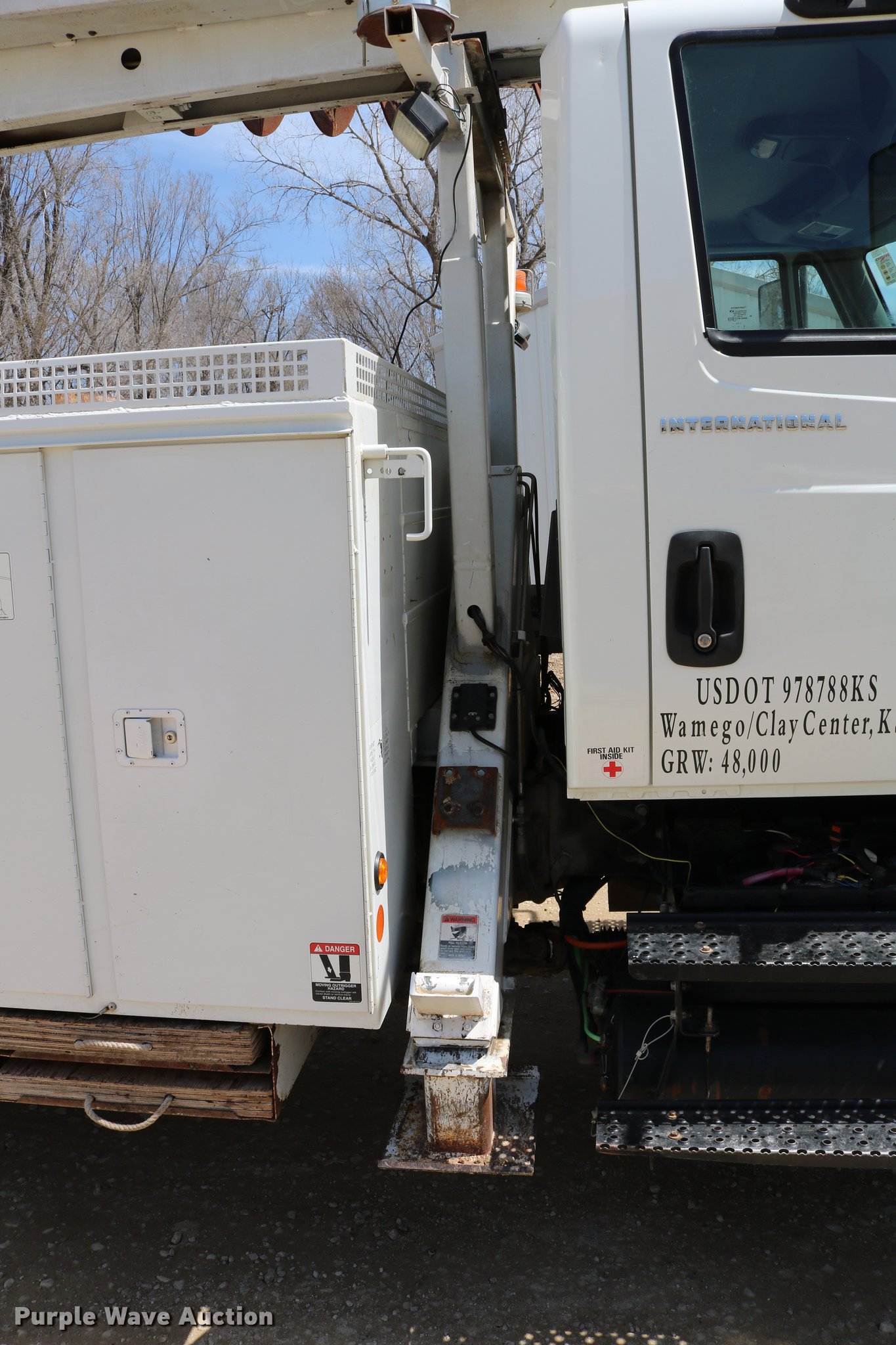 2007 International 7300 SFA digger derrick truck. 82,262 miles on odometer, 7,643 hours on meter, 4,910 hours on quartz guage, International DT-466 7.6L L6 turbo diesel engine, Six speed manual transmission, Four wheel drive, Air suspension seat, Heat, Auxiliary controls, Backup alarm, Beacon light, PTO, Quick-connect power outlet, Altec service bed 16'9"L, Shelving, Serial 106-10489526, 2008 Altec DM47TR boom 47' max lift height, Platform controls, Boom rotation, Pole guide, Articulating, insulated, and telescopic boom, Rope material handler, (4) outriggers, 16" diameter auger, Certification valid through 01/18, Serial 0108DV3327, Pintle hitch, Single fuel tank, 495" wheelbase, Single axle, Spring suspension, Air brakes, 11R22.5 tires, GVWR 33,000 lbs. Kansas title. 1HTWBAAN17J422080. Bluestem Electric Cooperative. 614 E Highway 24. Wamego, KS 66547