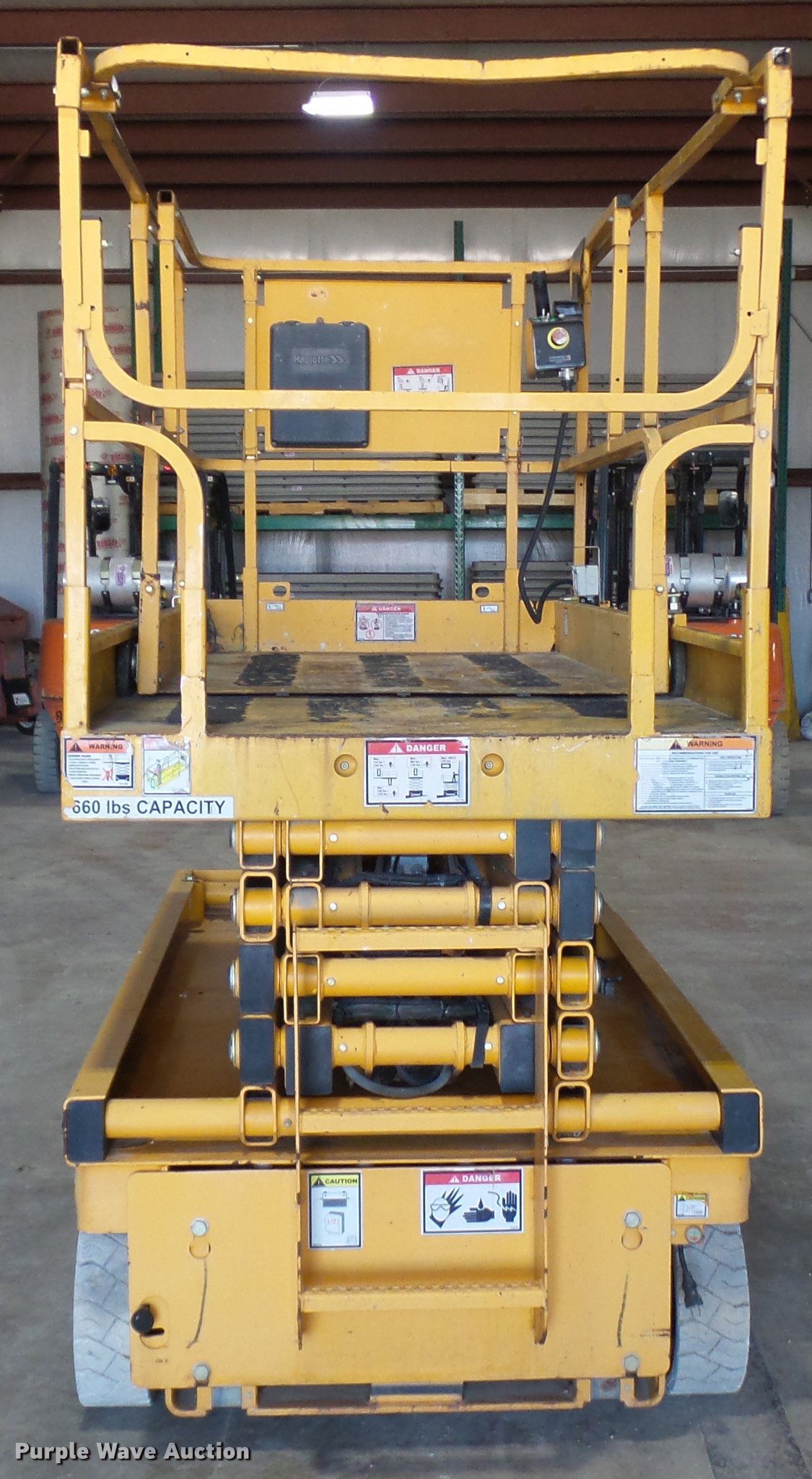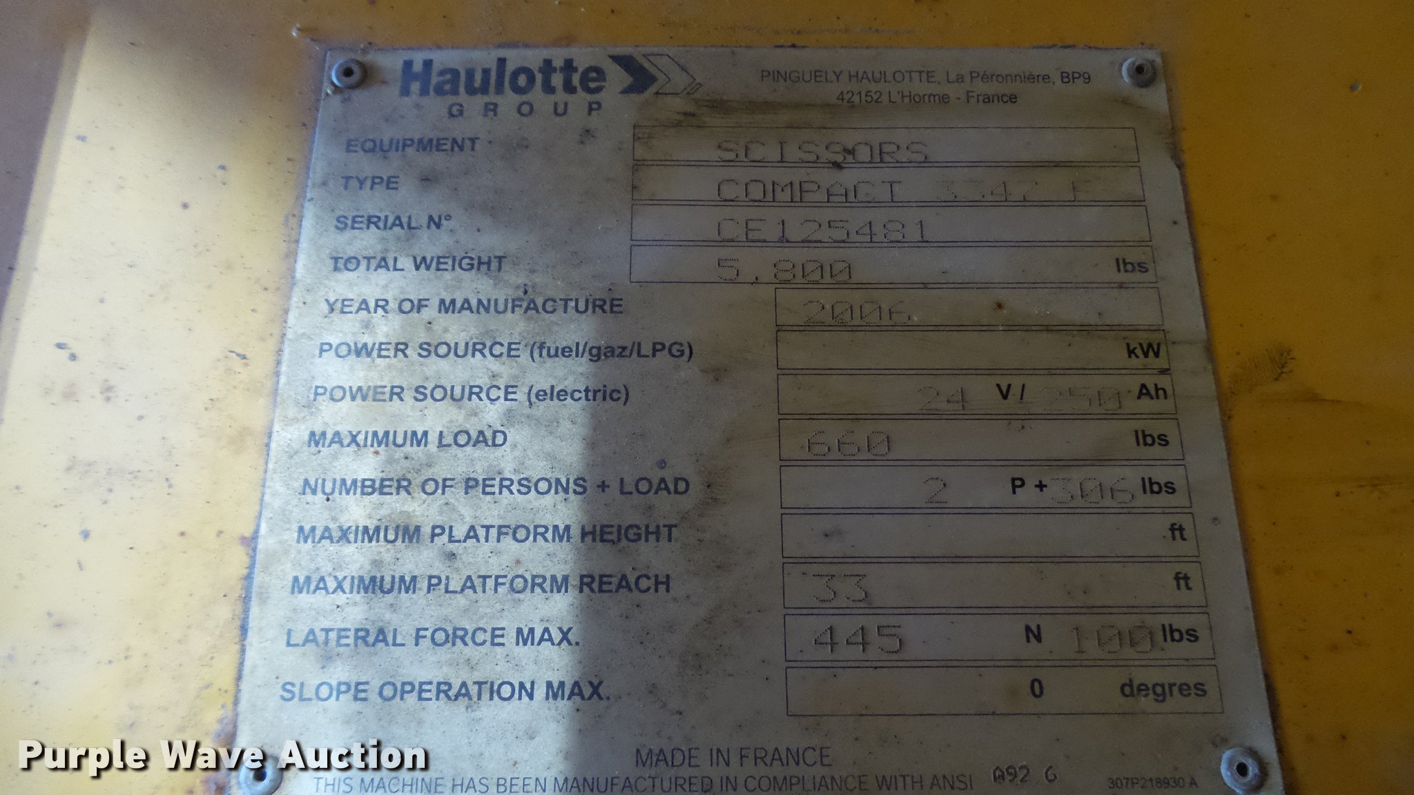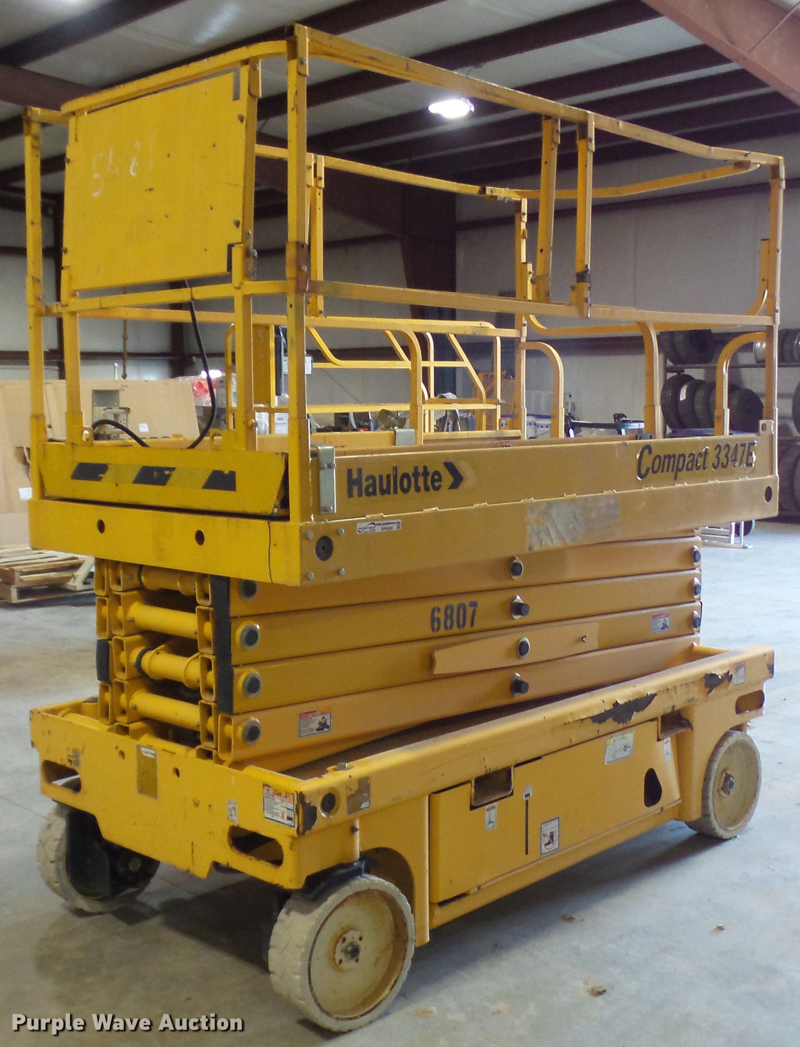 Purple Wave is selling a used Scissor or Vertical Lift in Missouri. This item is a 2006 Haulotte 3347E scissor lift with the following: 24V operation, 660 lbs maximum lift capacity, 33' maximum lift height, 46"W platform, Manual platform extensions, AC power outlet, Safety alarm, Pot hole protection, On-board charger, Side fork lift pockets, 15 x 5 non-marking tires, Serial CE125481