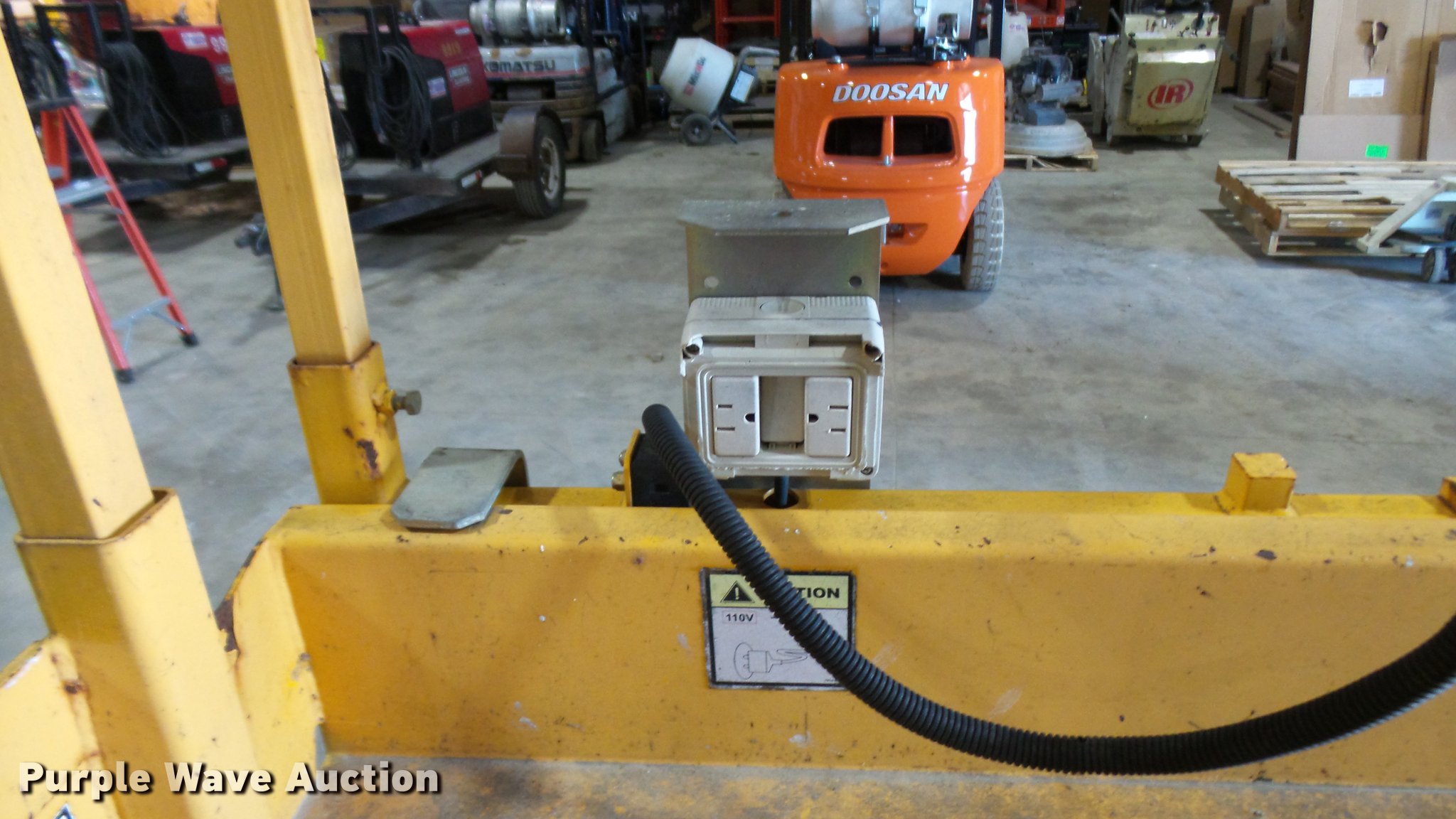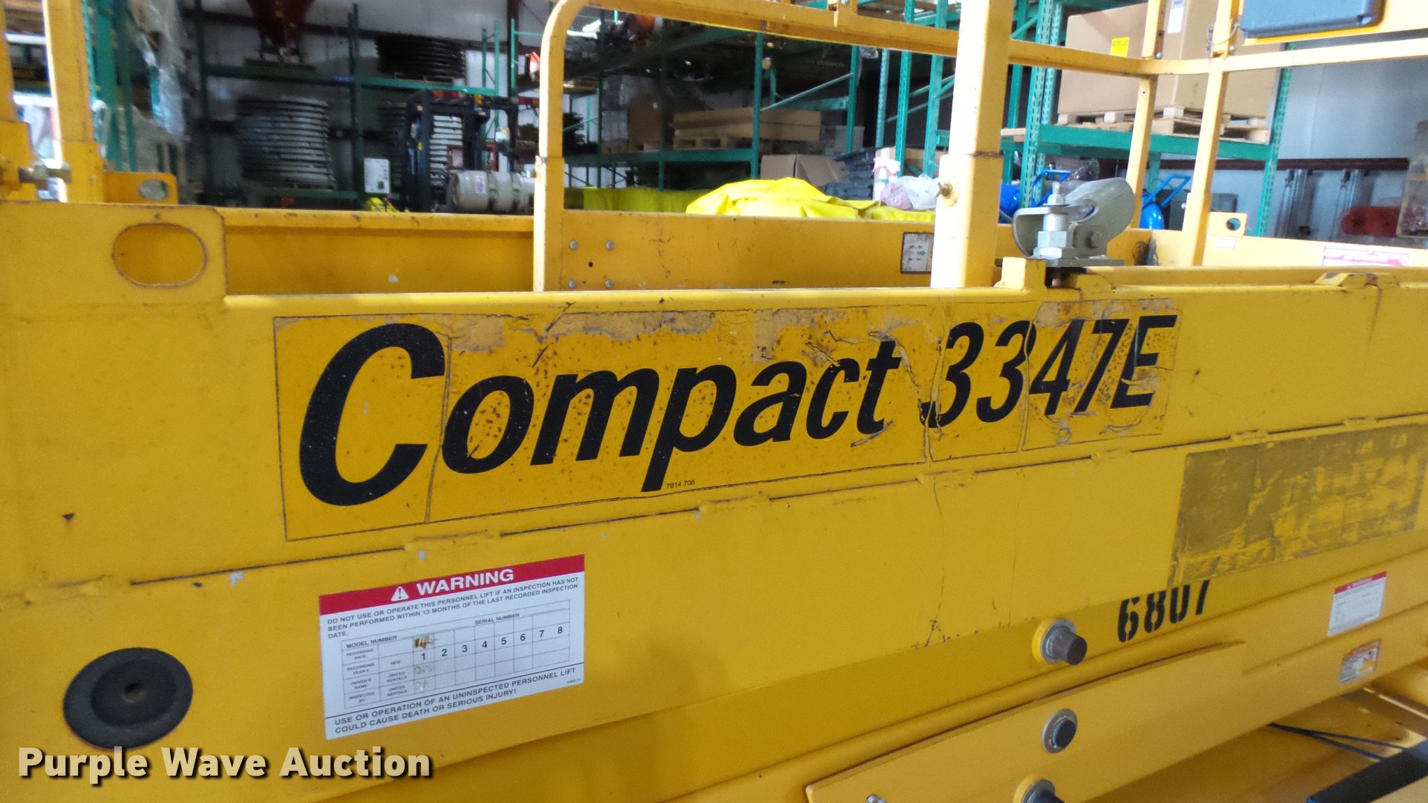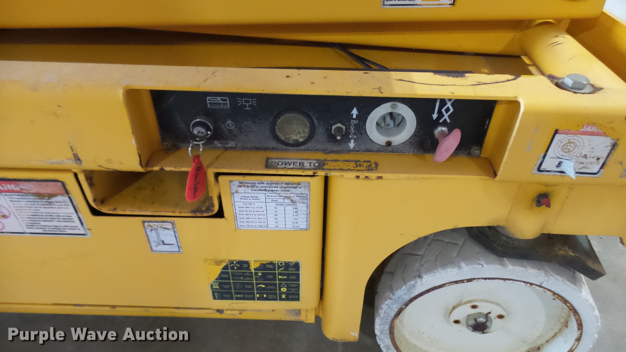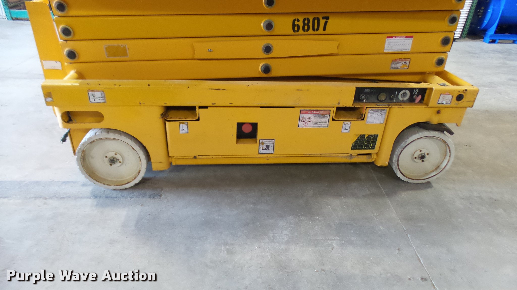 Purple Wave is selling a used Scissor or Vertical Lift in Missouri. This item is a 2006 Haulotte 3347E scissor lift with the following: 24V operation, 660 lbs maximum lift capacity, 33' maximum lift height, 46"W platform, Manual platform extensions, AC power outlet, Safety alarm, Pot hole protection, On-board charger, Side fork lift pockets, 15 x 5 non-marking tires, Serial CE125481