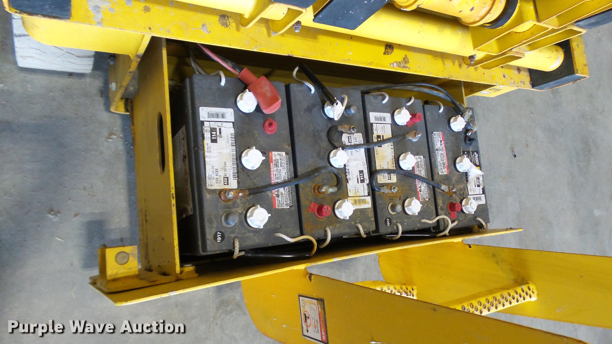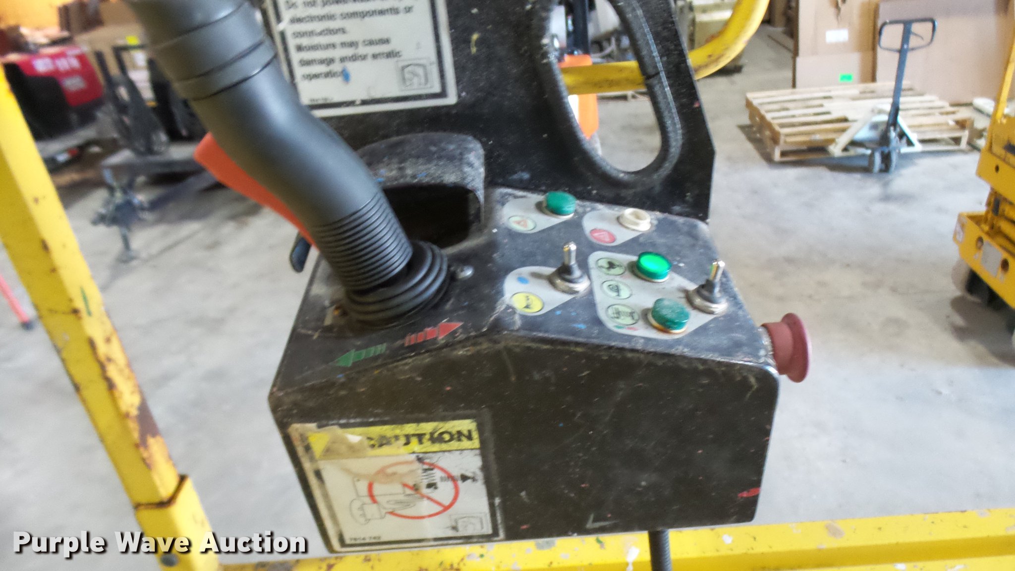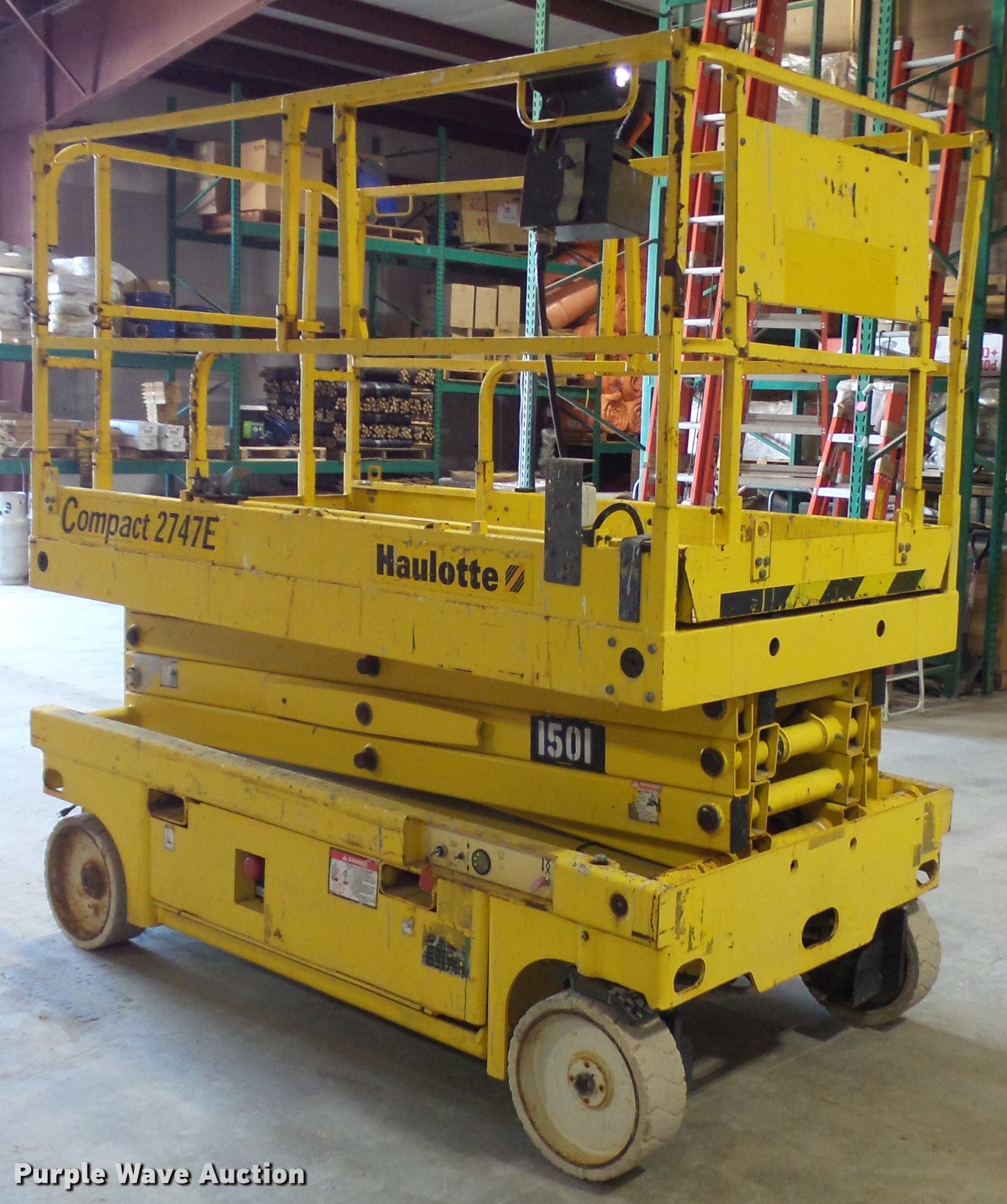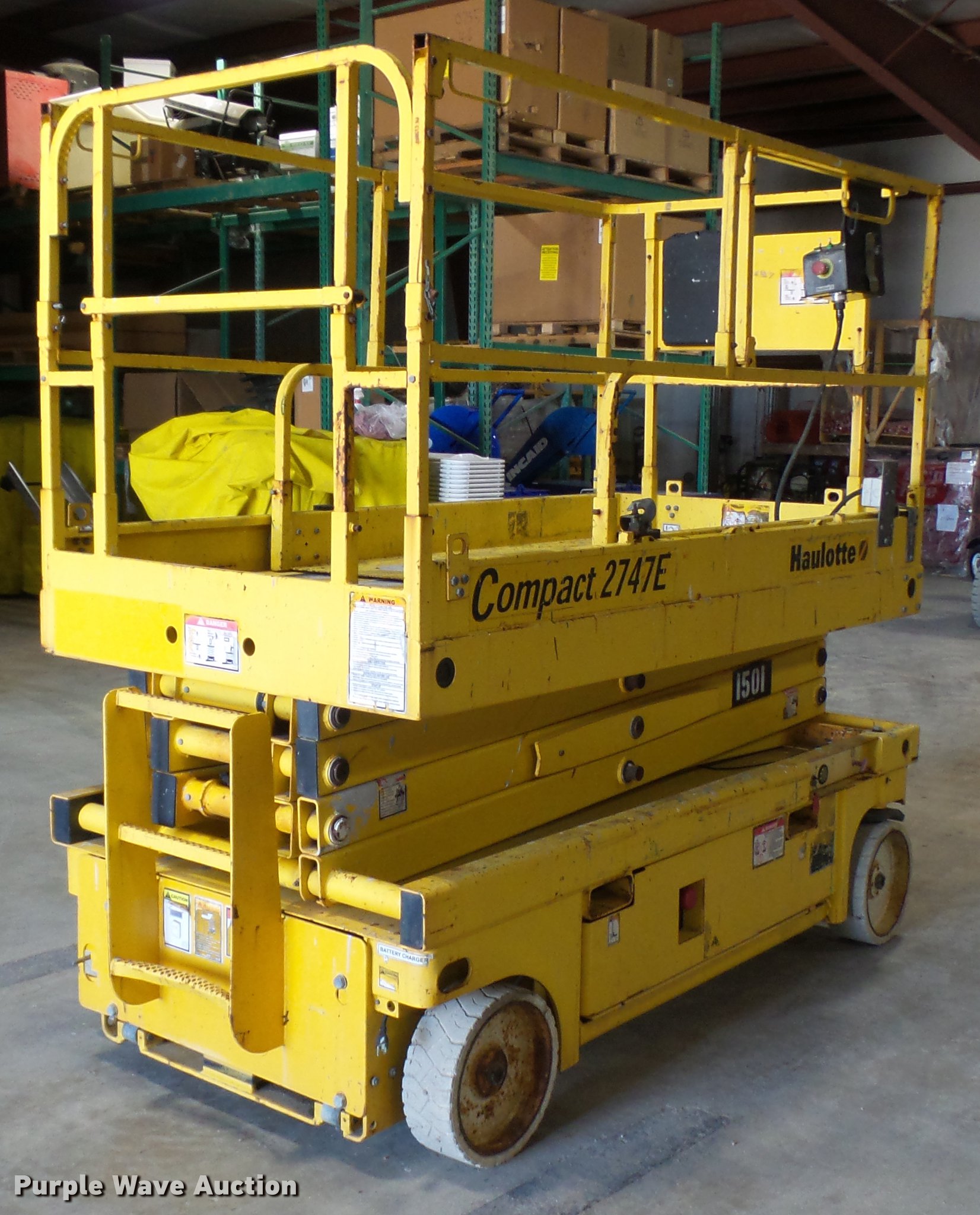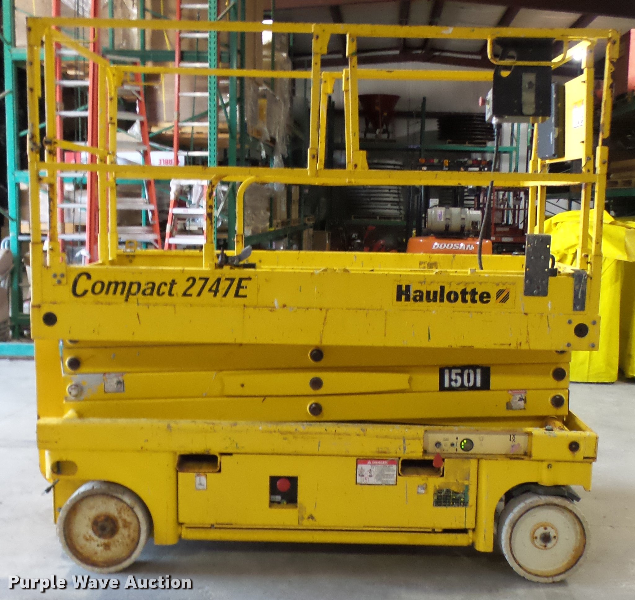 Purple Wave is selling a used Scissor or Vertical Lift in Missouri. This item is a 2001 Haulotte 2746E scissor lift with the following: 203 hours on meter, 24V operation, 500 lbs maximum lift capacity, 27' maximum lift height, 47"W platform, Manual platform extensions, Platform and ground controls, AC power outlet, Pot hole protection, On-board charger, Side fork pockets, Non-marking tires, Serial CE104284