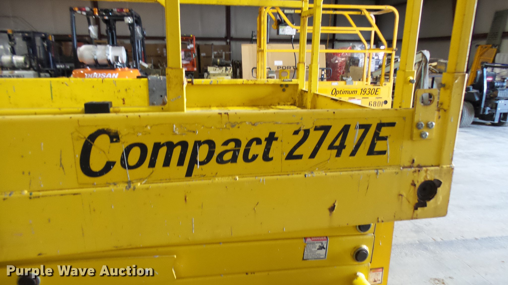 2001 Haulotte 2746E scissor lift. 203 hours on meter, 24V operation, 500 lbs maximum lift capacity, 27' maximum lift height, 47"W platform Manual platform extensions, Platform and ground controls, AC power outlet, Pot hole protection, On-board charger, Side fork pockets, Non-marking tires, Serial CE104284. Sedalia Rental & Supply. 21474 US-50. Sedalia, MO 65301