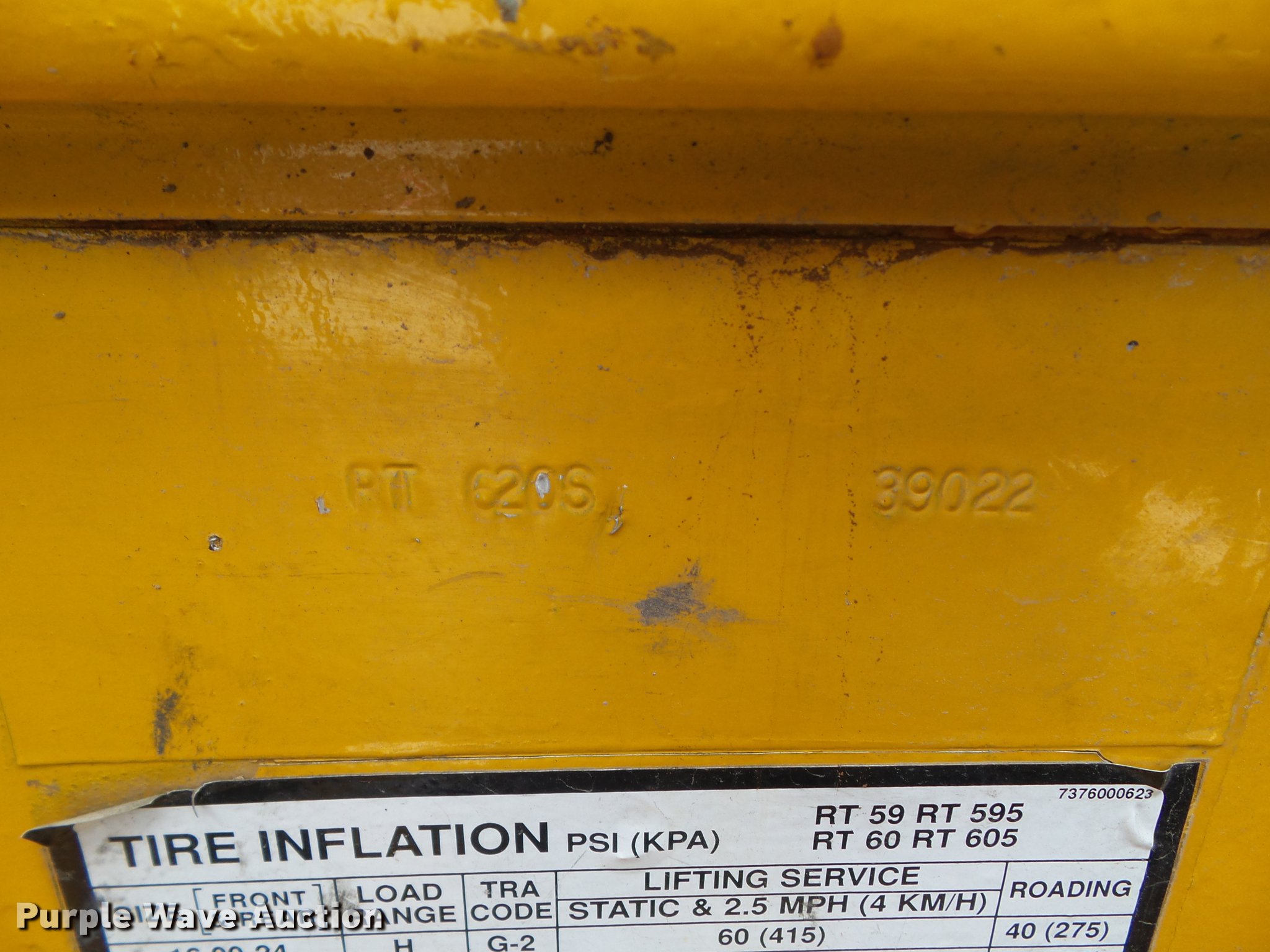 Purple Wave is selling a used Rough or All Terrain Crane in Iowa. This item is a 1977 Grove RT620S crane with the following: 7,060 hours on meter, Cummins 5.9L L6 turbo diesel engine, Manual transmission, Tandem axle, (4) drive wheels, (4) steer wheels, Heat, Suspension seat, Stick crane controls, Work lights, Block heater, Tow hooks, 70'L telescopic boom, 23'L jib, Three boom sections, Crane ball and hook, Single winch, In-cab boom controls, Three sheave crane block, 20 ton capacity, (4) stabalizers, Pintle hitch, 16.00-24 tires, Manuals, Serial 39022