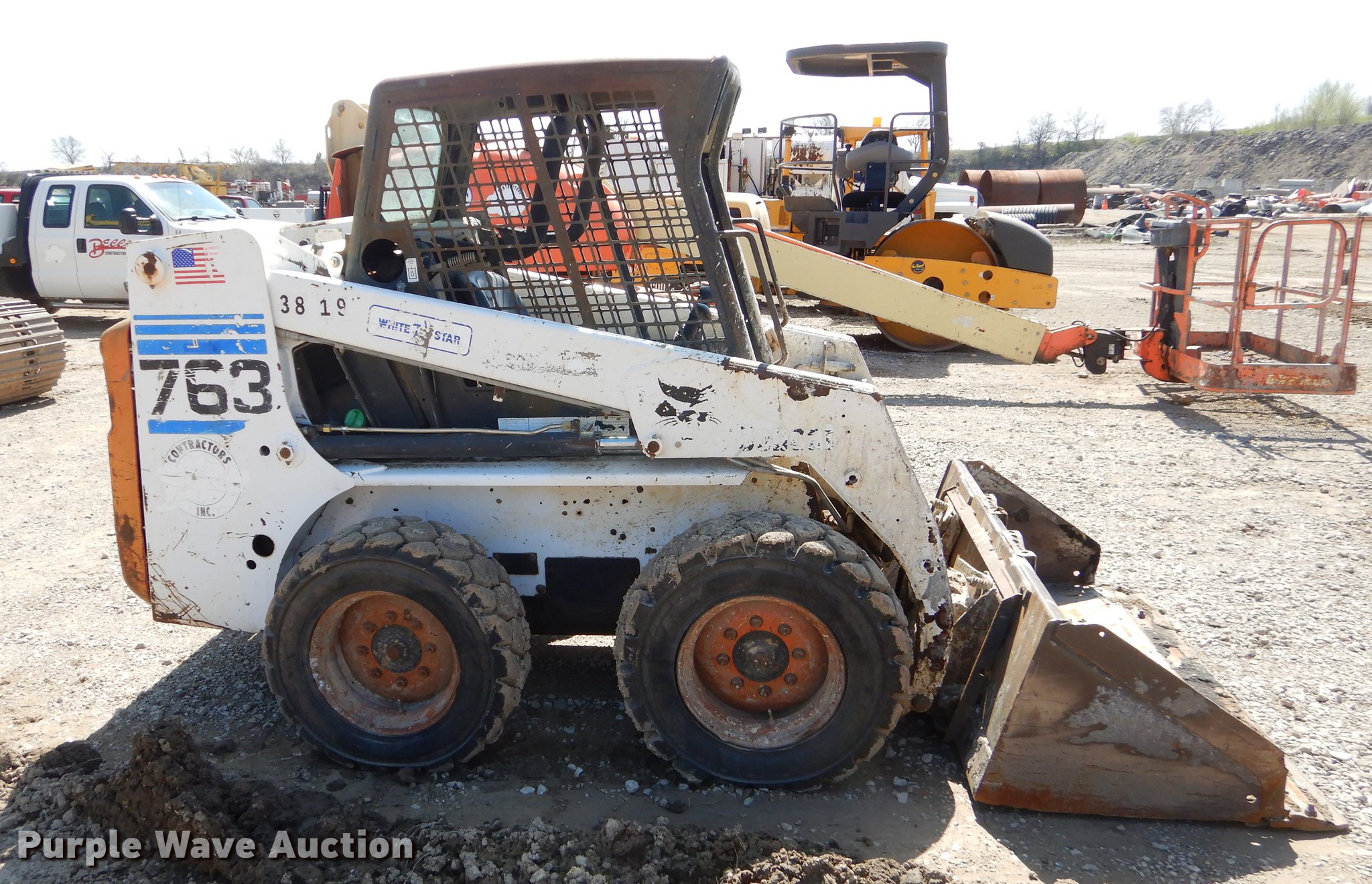 Purple Wave is selling a used Skid Steer Loader in Oklahoma. This item is a 2002 Bobcat 763 skid steer with the following: 7,518 hours on meter, Four cylinder diesel engine, Hydrostatic transmission, Enclosed cab, Joystick controls, Spring suspension seat, Front work lights, 67"W low profile bucket, Bolt-on cutting edge, Manual quick coupler, Auxiliary hydraulics, 10 x 16.5 tires, Serial 512262154