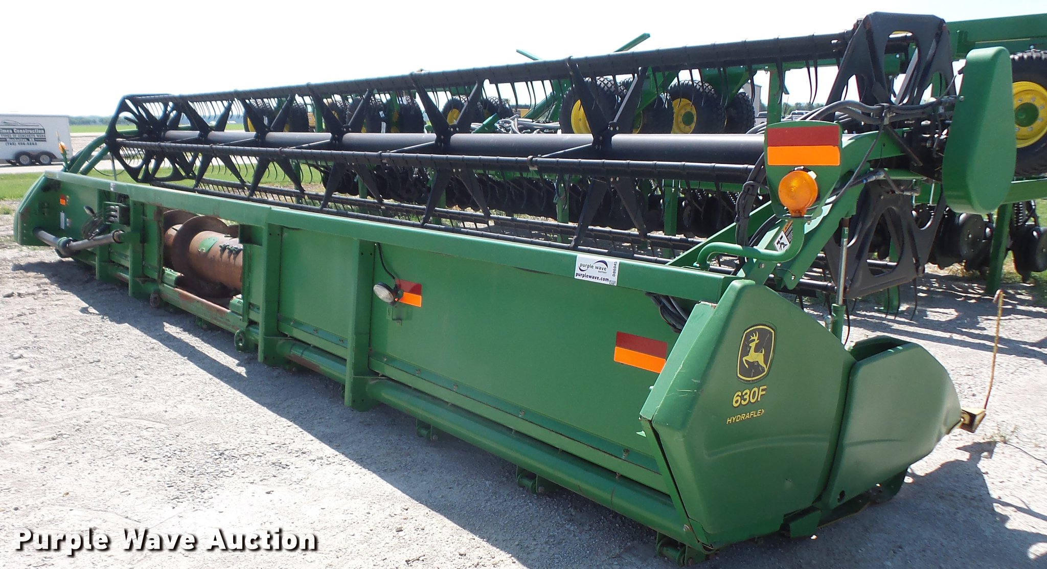 Purple Wave is selling a used Platform or Stripper Head in Kansas. This item is a 2006 John Deere 630F Hydraflex head with the following: 30'W, Finger reel, Hydraulic fore/aft, Hydraulic reel height control, Full finger auger, Stubble lights, Poly skid plates, Single point coupler, Single driveline, Serial H00630F716660, Unit# 43610